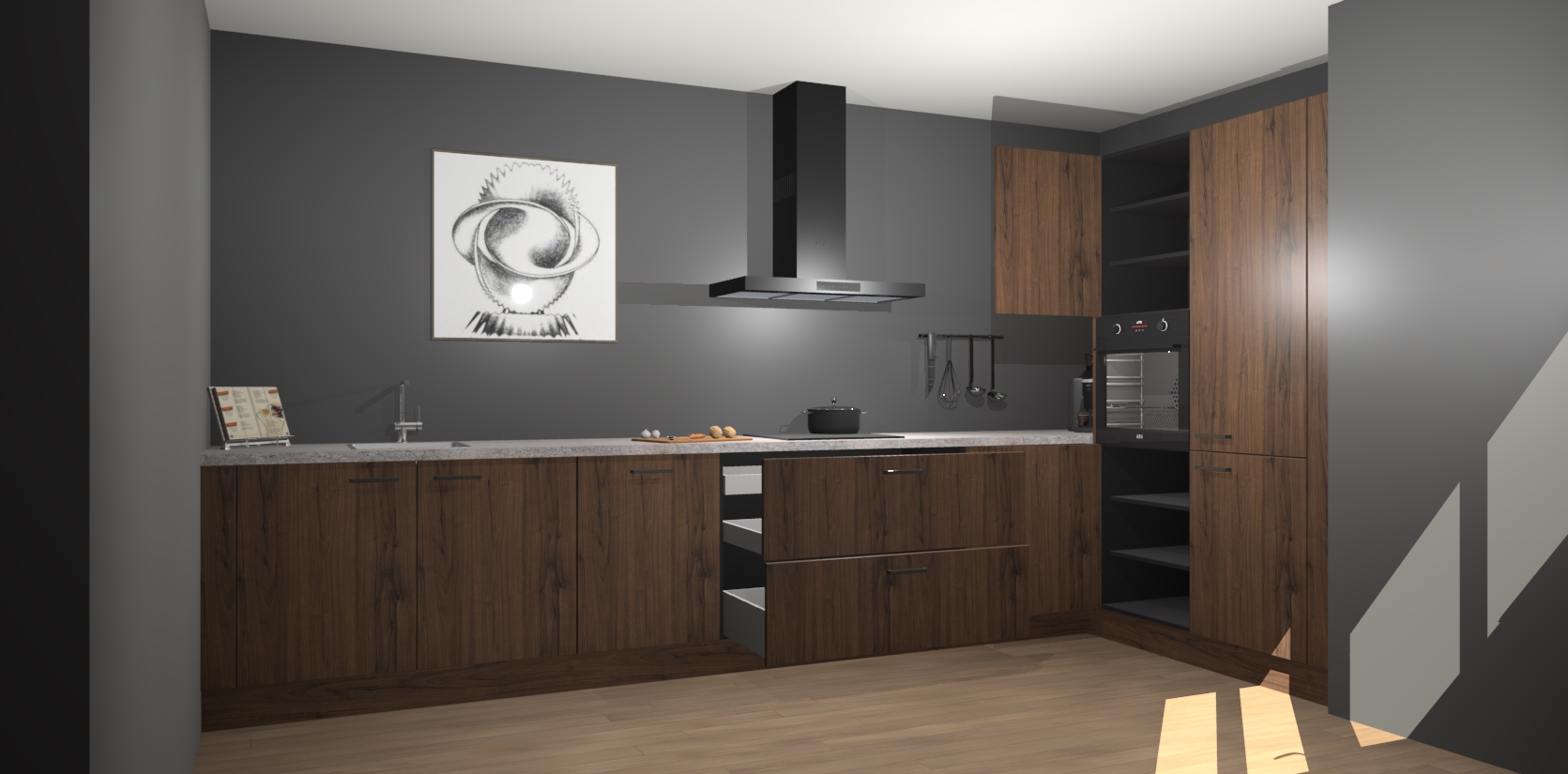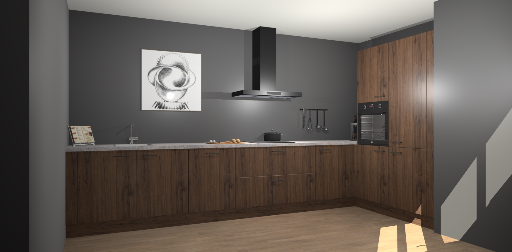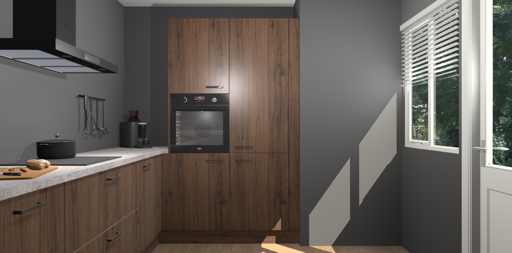 Welkom bij de Noten keuken Khao Lak. Deze prachtige keuken zal de komende jaren het middelpunt van de belangstelling in uw huis zijn. Uitgerust met vijf inbouwapparaten komt u nooit kookgereedschap tekort. Bovendien geeft de warme houtlook elke ruimte een uitnodigende en tijdloze uitstraling.