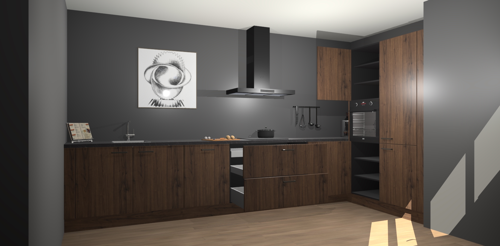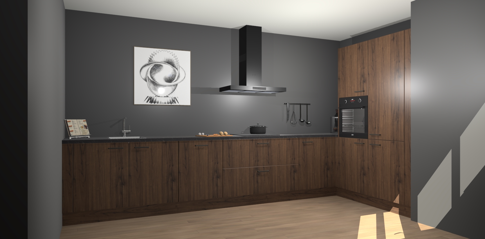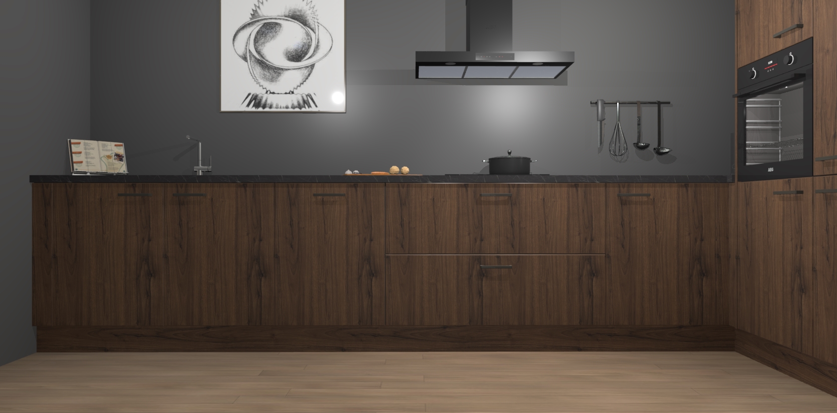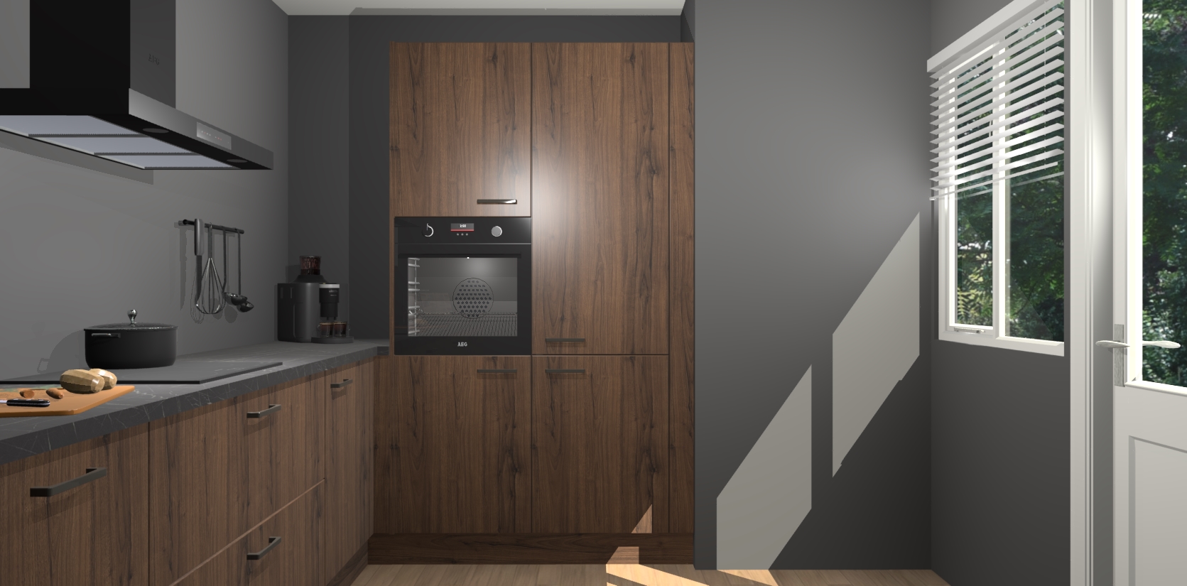 Welkom bij de Noten keuken Khao Lak. Deze prachtige keuken zal de komende jaren het middelpunt van de belangstelling in uw huis zijn. Uitgerust met vijf inbouwapparaten komt u nooit kookgereedschap tekort. Bovendien geeft de warme houtlook elke ruimte een uitnodigende en tijdloze uitstraling.