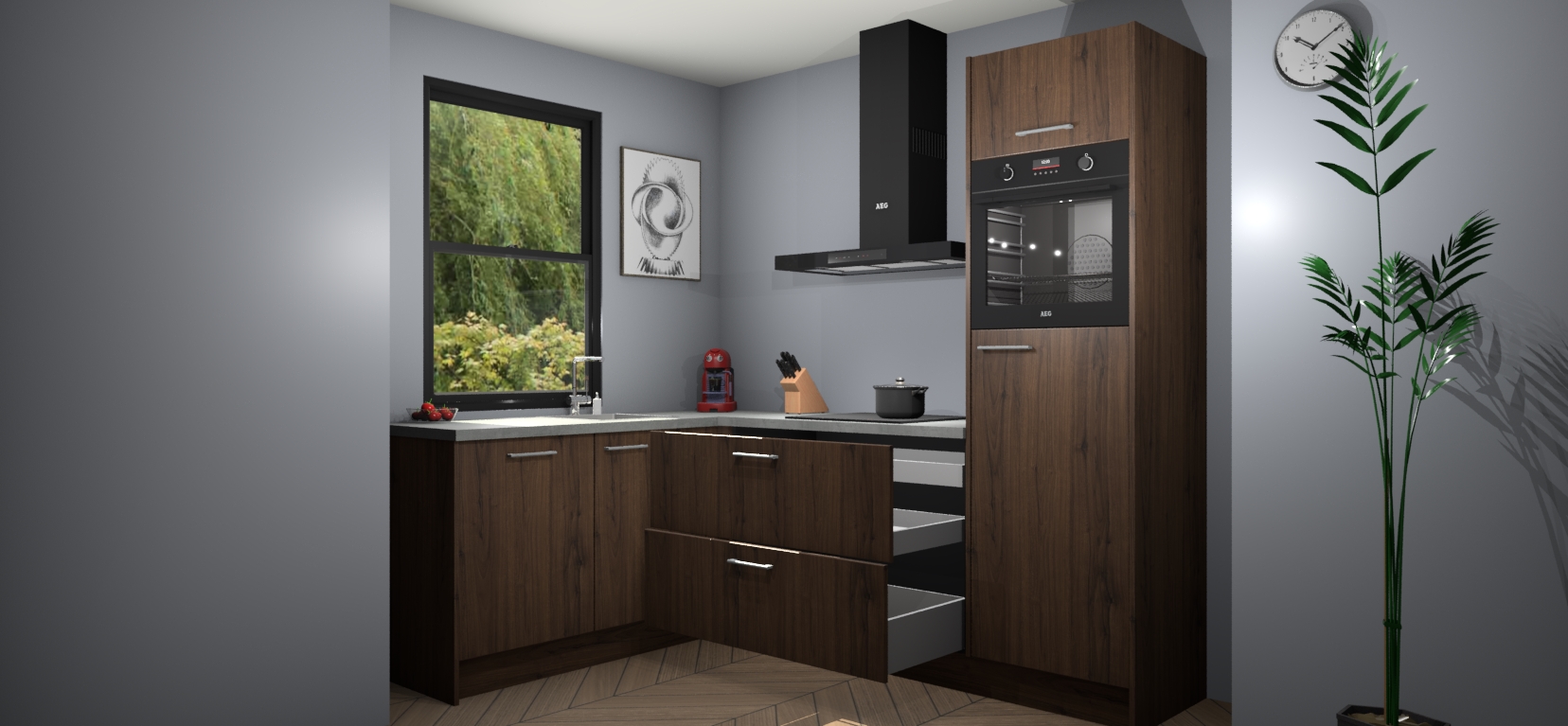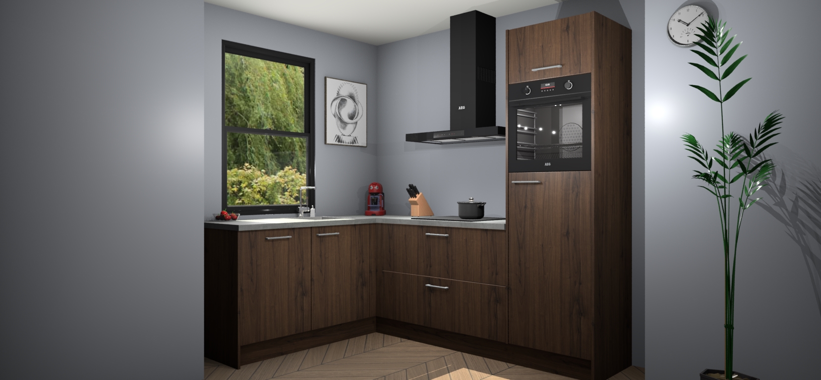 Deze prachtige hoekkeuken heeft alle benodigdheden om uw droomkook- en eetruimte compleet te maken. De Noten kasten bieden een echo van raffinement, terwijl de 5 inbouwapparaten genoeg opties bieden voor het bereiden van heerlijke maaltijden. De oven, inductiekookplaat, afzuigkap, vaatwasser en koelkast zorgen ervoor dat u tijd in de keuken zo efficiënt mogelijk verloopt, terwijl ze ook dat extra vleugje luxe bieden.