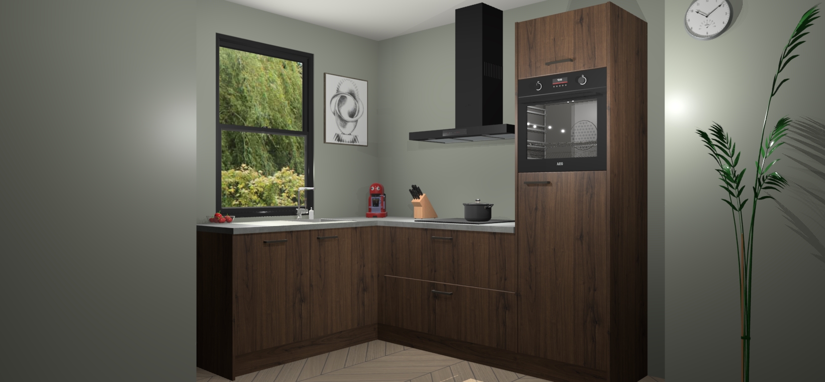 Deze prachtige hoekkeuken heeft alle benodigdheden om uw droomkook- en eetruimte compleet te maken. De Noten kasten bieden een echo van raffinement, terwijl de 5 inbouwapparaten genoeg opties bieden voor het bereiden van heerlijke maaltijden. De oven, inductiekookplaat, afzuigkap, vaatwasser en koelkast zorgen ervoor dat u tijd in de keuken zo efficiënt mogelijk verloopt, terwijl ze ook dat extra vleugje luxe bieden.