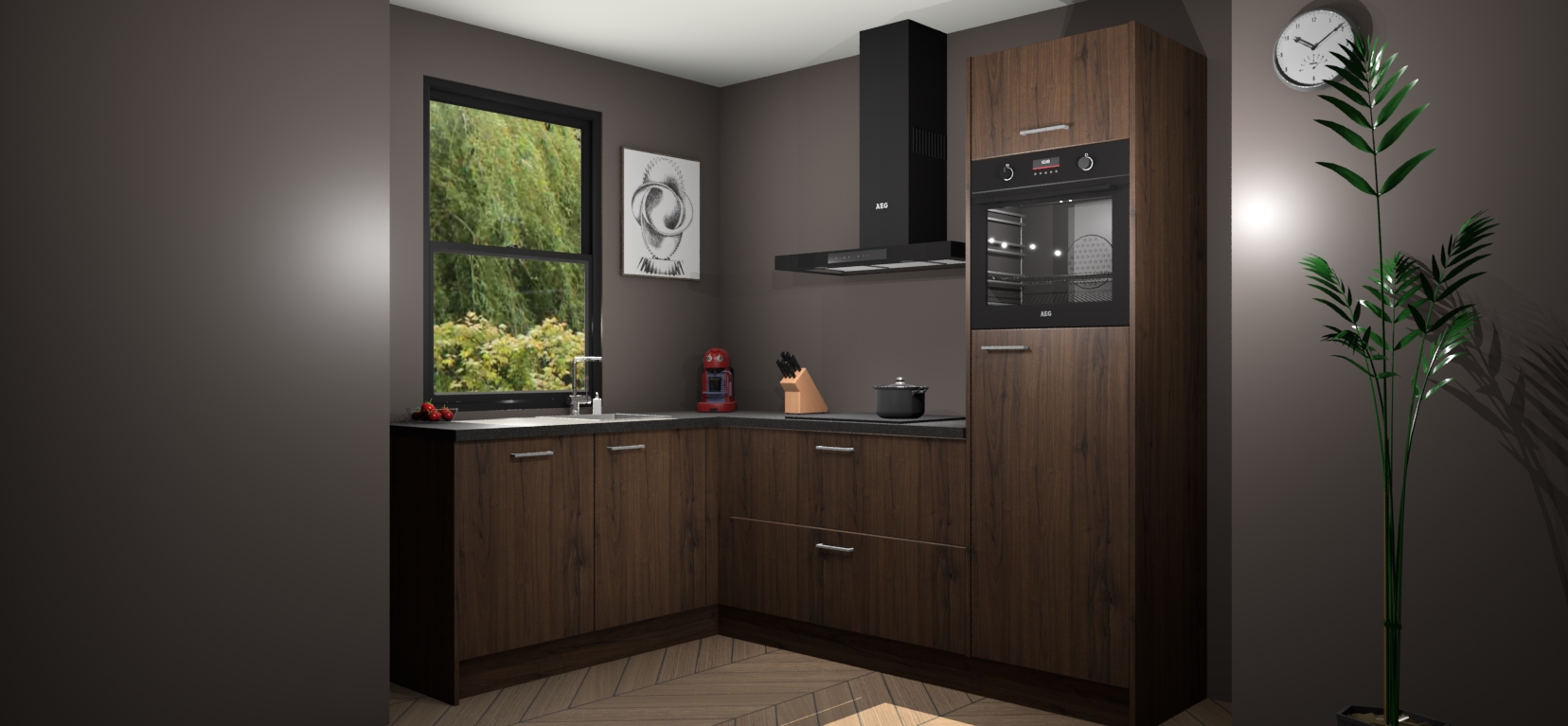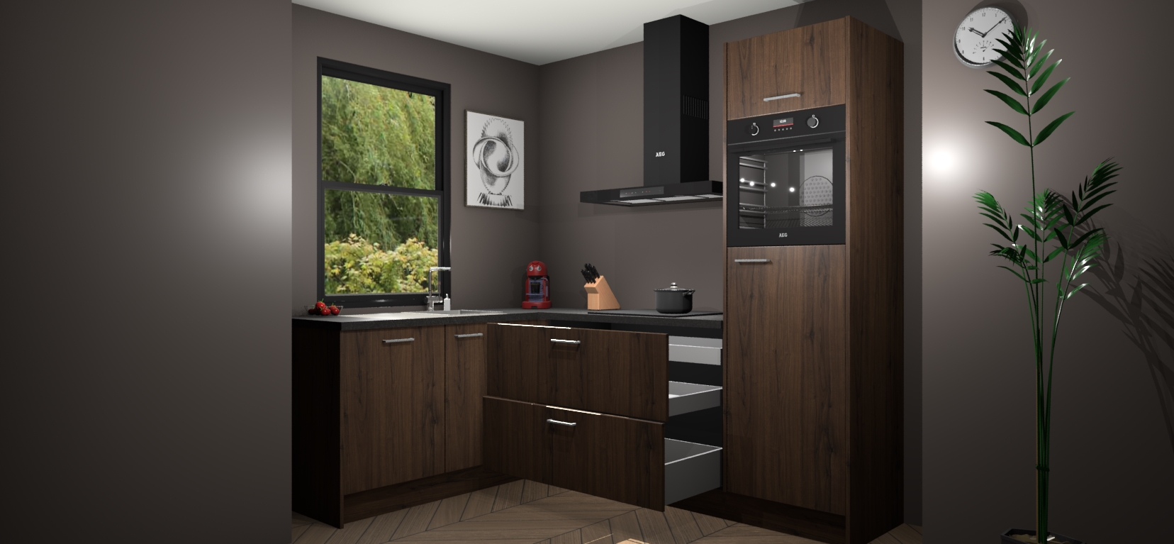 Deze prachtige hoekkeuken heeft alle benodigdheden om uw droomkook- en eetruimte compleet te maken. De Noten kasten bieden een echo van raffinement, terwijl de 5 inbouwapparaten genoeg opties bieden voor het bereiden van heerlijke maaltijden. De oven, inductiekookplaat, afzuigkap, vaatwasser en koelkast zorgen ervoor dat u tijd in de keuken zo efficiënt mogelijk verloopt, terwijl ze ook dat extra vleugje luxe bieden.