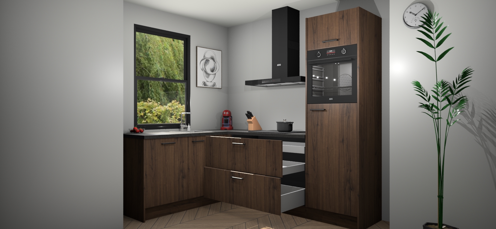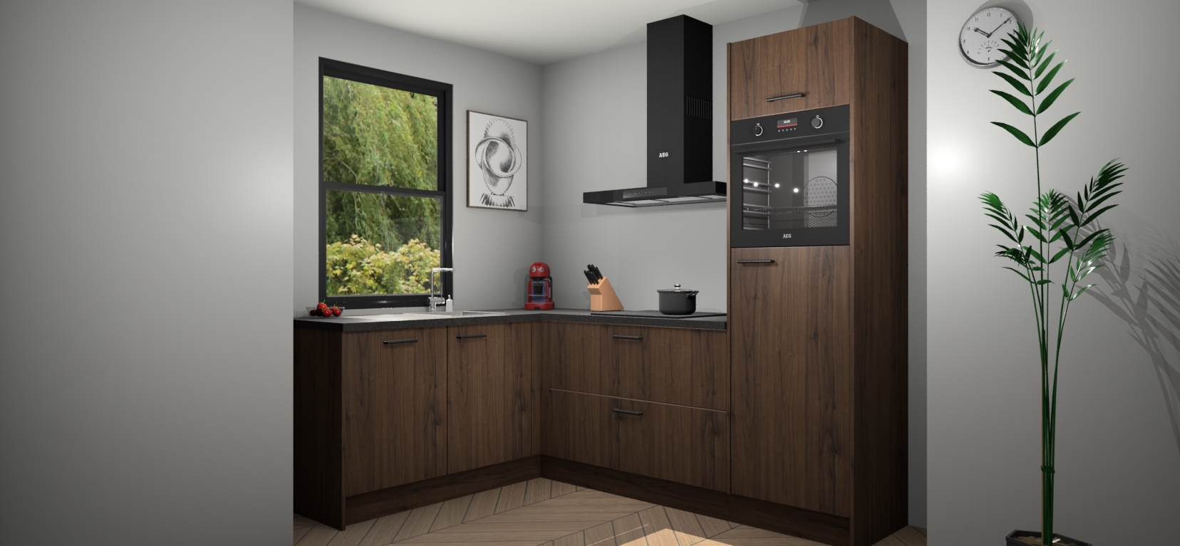 Deze prachtige hoekkeuken heeft alle benodigdheden om uw droomkook- en eetruimte compleet te maken. De Noten kasten bieden een echo van raffinement, terwijl de 5 inbouwapparaten genoeg opties bieden voor het bereiden van heerlijke maaltijden. De oven, inductiekookplaat, afzuigkap, vaatwasser en koelkast zorgen ervoor dat u tijd in de keuken zo efficiënt mogelijk verloopt, terwijl ze ook dat extra vleugje luxe bieden.