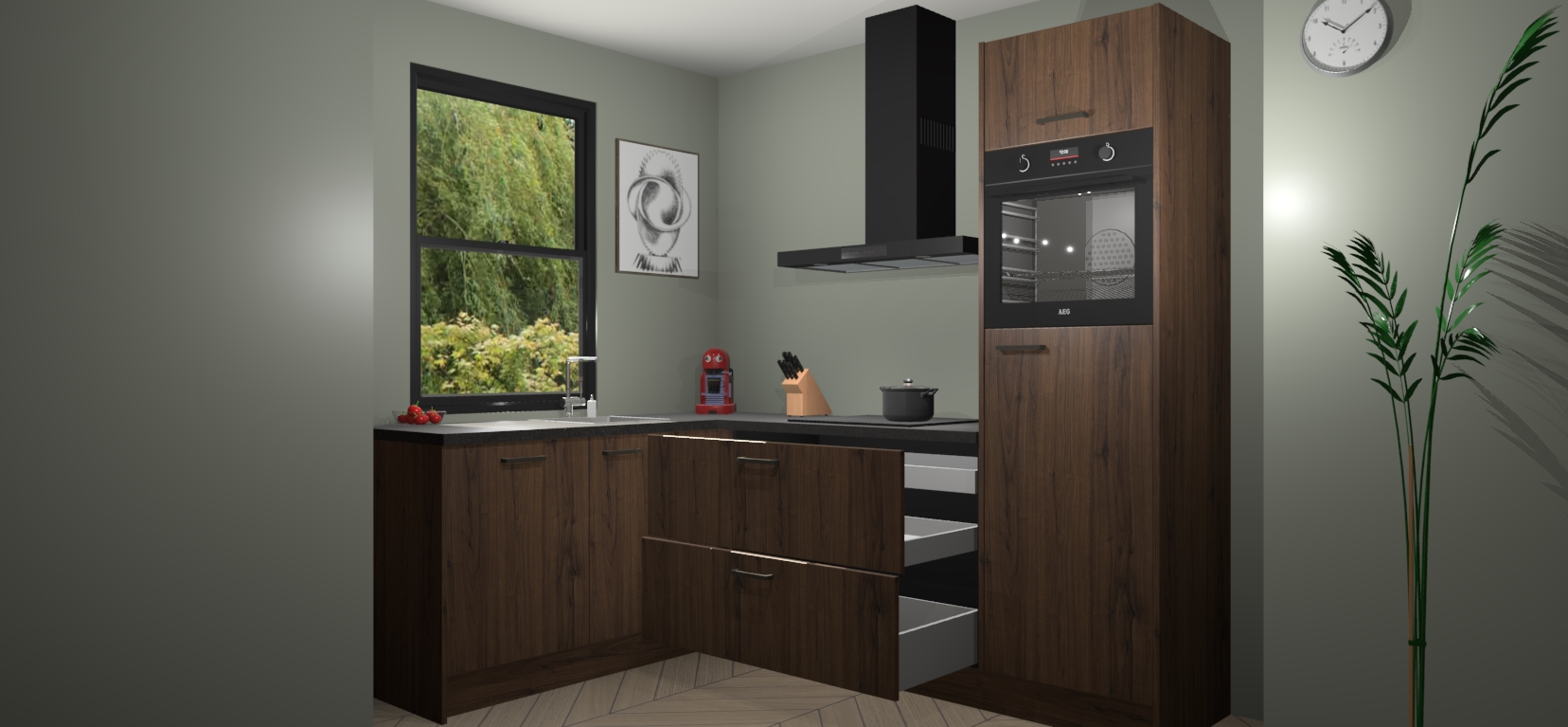Deze prachtige hoekkeuken heeft alle benodigdheden om uw droomkook- en eetruimte compleet te maken. De Noten kasten bieden een echo van raffinement, terwijl de 5 inbouwapparaten genoeg opties bieden voor het bereiden van heerlijke maaltijden. De oven, inductiekookplaat, afzuigkap, vaatwasser en koelkast zorgen ervoor dat u tijd in de keuken zo efficiënt mogelijk verloopt, terwijl ze ook dat extra vleugje luxe bieden.