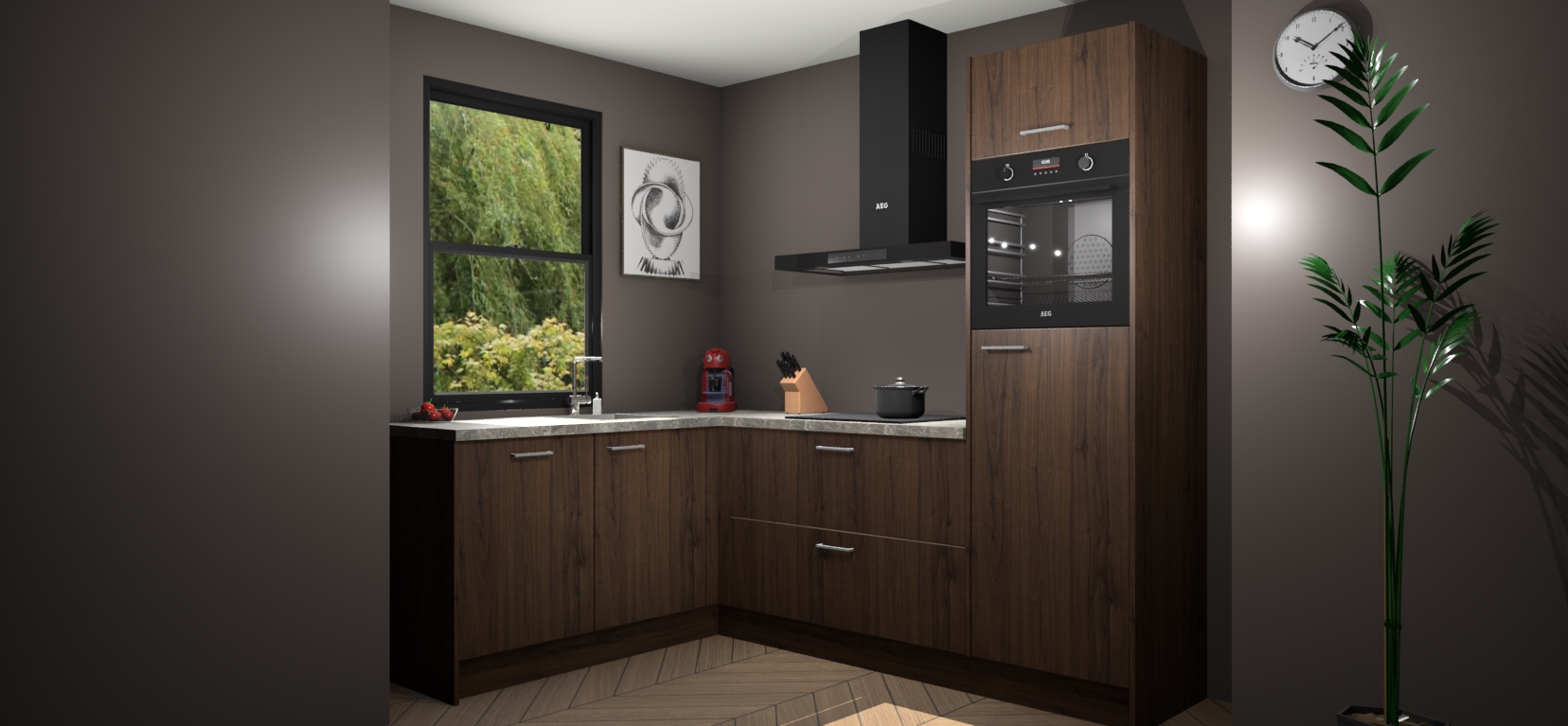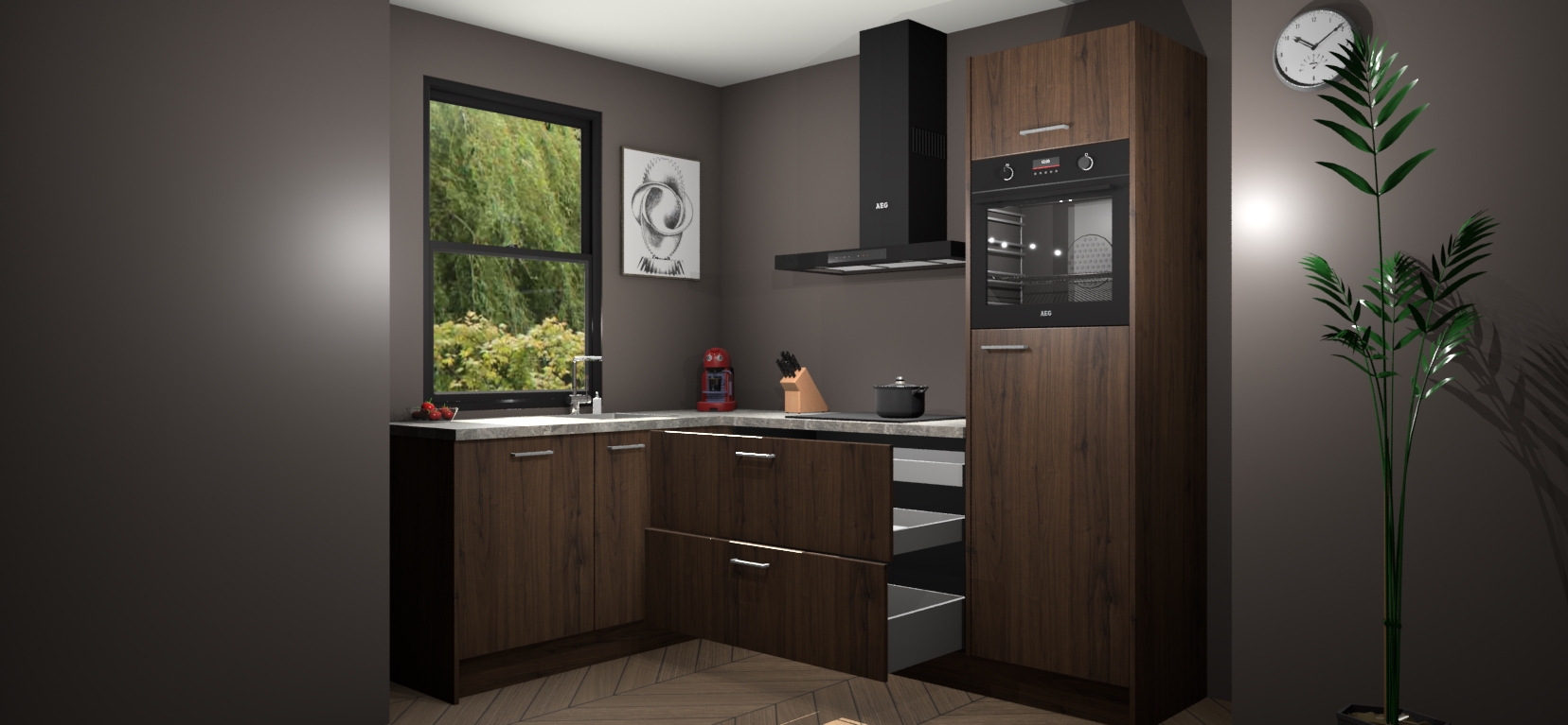 Deze prachtige hoekkeuken heeft alle benodigdheden om uw droomkook- en eetruimte compleet te maken. De Noten kasten bieden een echo van raffinement, terwijl de 5 inbouwapparaten genoeg opties bieden voor het bereiden van heerlijke maaltijden. De oven, inductiekookplaat, afzuigkap, vaatwasser en koelkast zorgen ervoor dat u tijd in de keuken zo efficiënt mogelijk verloopt, terwijl ze ook dat extra vleugje luxe bieden.