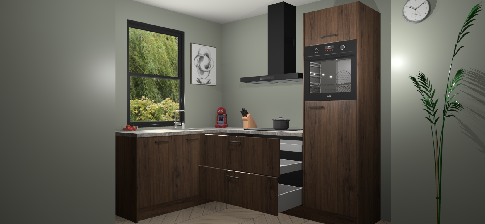 Deze prachtige hoekkeuken heeft alle benodigdheden om uw droomkook- en eetruimte compleet te maken. De Noten kasten bieden een echo van raffinement, terwijl de 5 inbouwapparaten genoeg opties bieden voor het bereiden van heerlijke maaltijden. De oven, inductiekookplaat, afzuigkap, vaatwasser en koelkast zorgen ervoor dat u tijd in de keuken zo efficiënt mogelijk verloopt, terwijl ze ook dat extra vleugje luxe bieden.