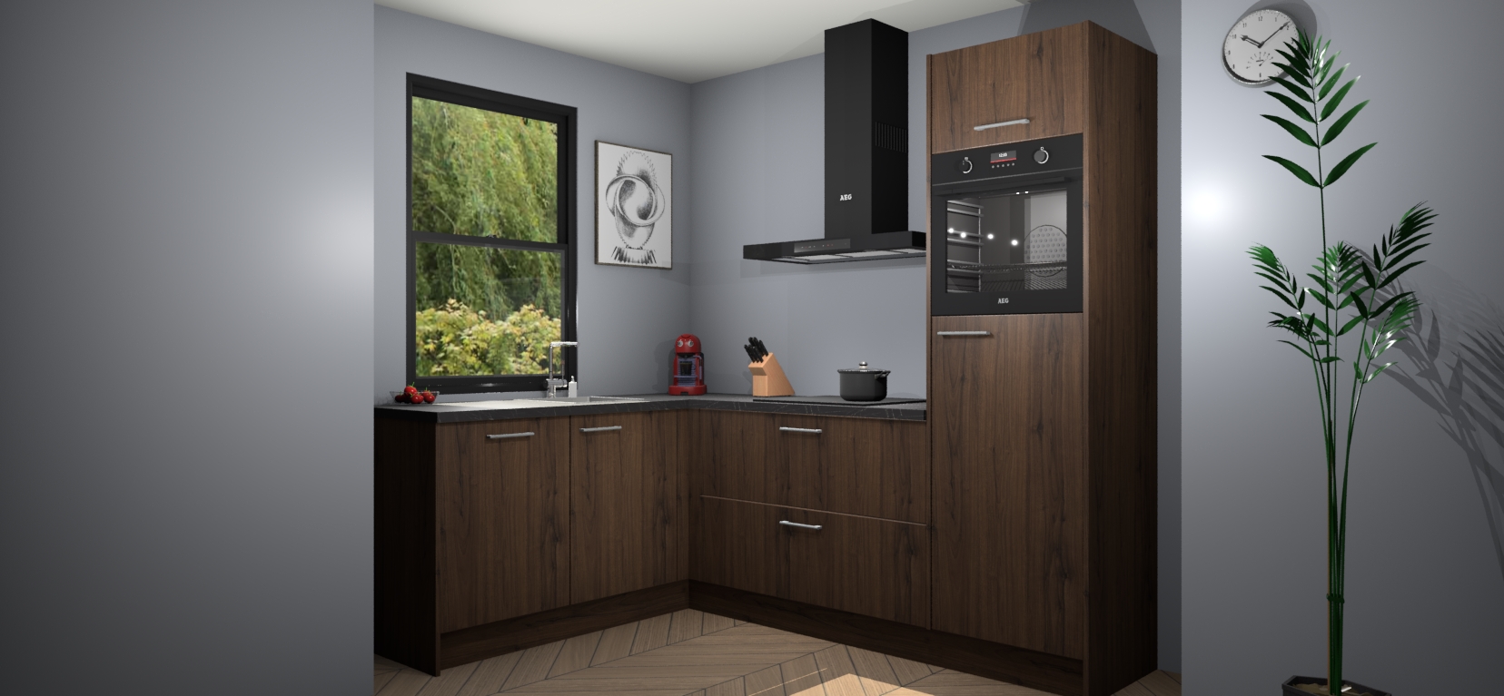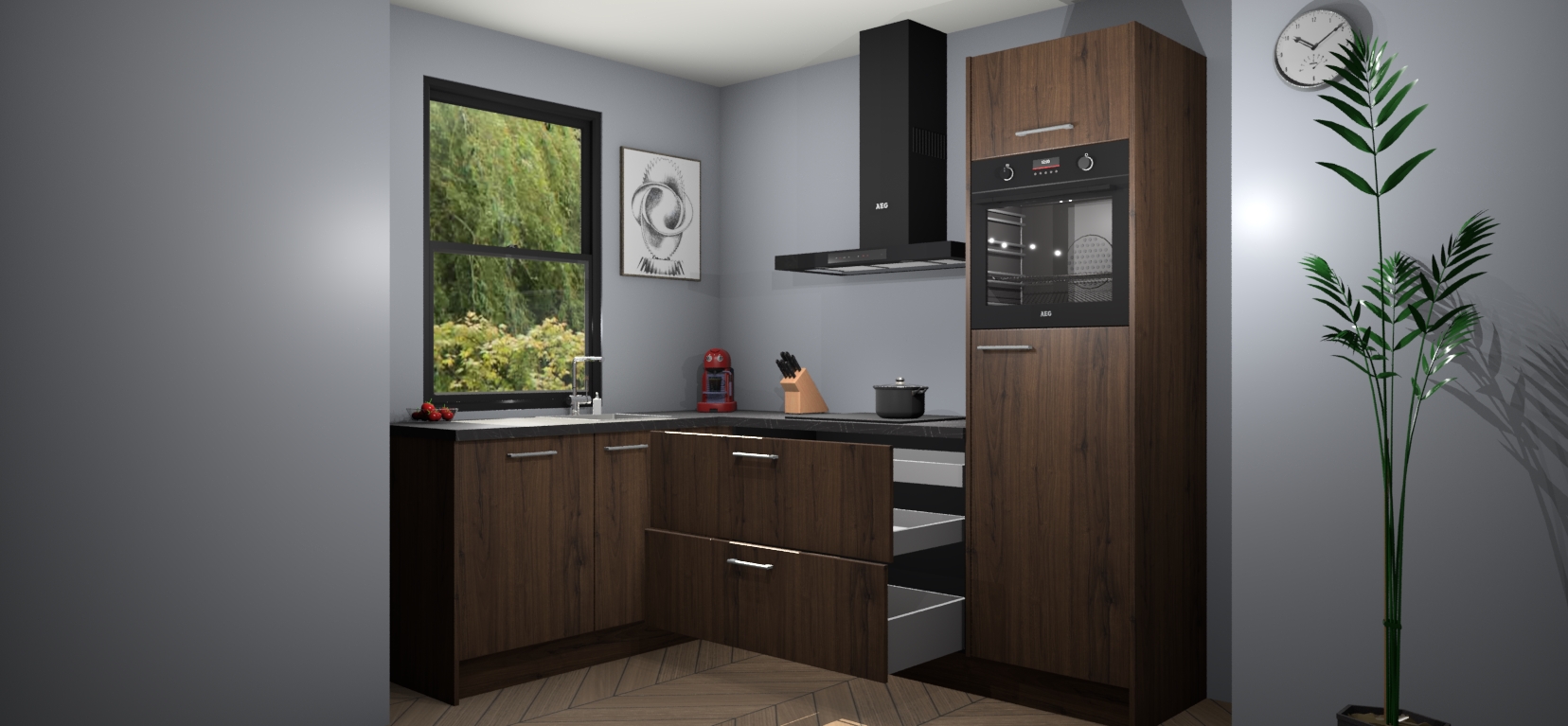 Deze prachtige hoekkeuken heeft alle benodigdheden om uw droomkook- en eetruimte compleet te maken. De Noten kasten bieden een echo van raffinement, terwijl de 5 inbouwapparaten genoeg opties bieden voor het bereiden van heerlijke maaltijden. De oven, inductiekookplaat, afzuigkap, vaatwasser en koelkast zorgen ervoor dat u tijd in de keuken zo efficiënt mogelijk verloopt, terwijl ze ook dat extra vleugje luxe bieden.