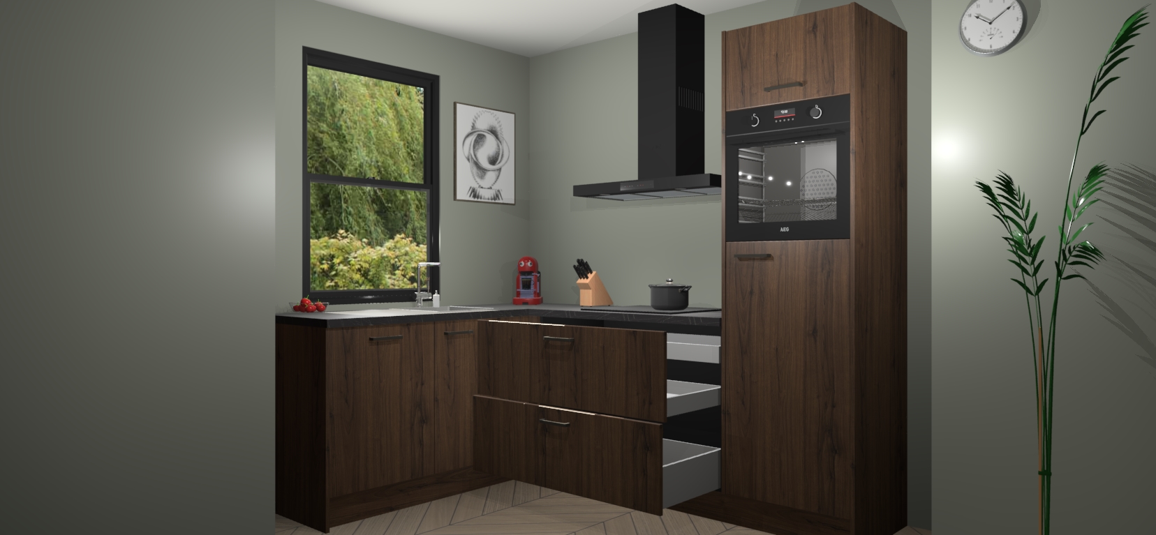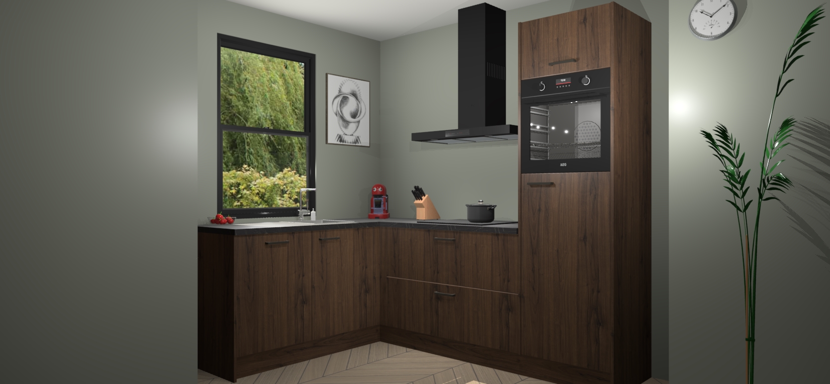 Deze prachtige hoekkeuken heeft alle benodigdheden om uw droomkook- en eetruimte compleet te maken. De Noten kasten bieden een echo van raffinement, terwijl de 5 inbouwapparaten genoeg opties bieden voor het bereiden van heerlijke maaltijden. De oven, inductiekookplaat, afzuigkap, vaatwasser en koelkast zorgen ervoor dat u tijd in de keuken zo efficiënt mogelijk verloopt, terwijl ze ook dat extra vleugje luxe bieden.