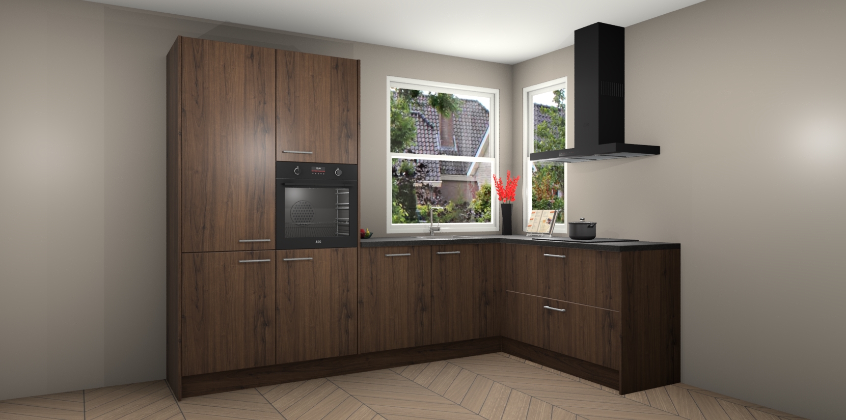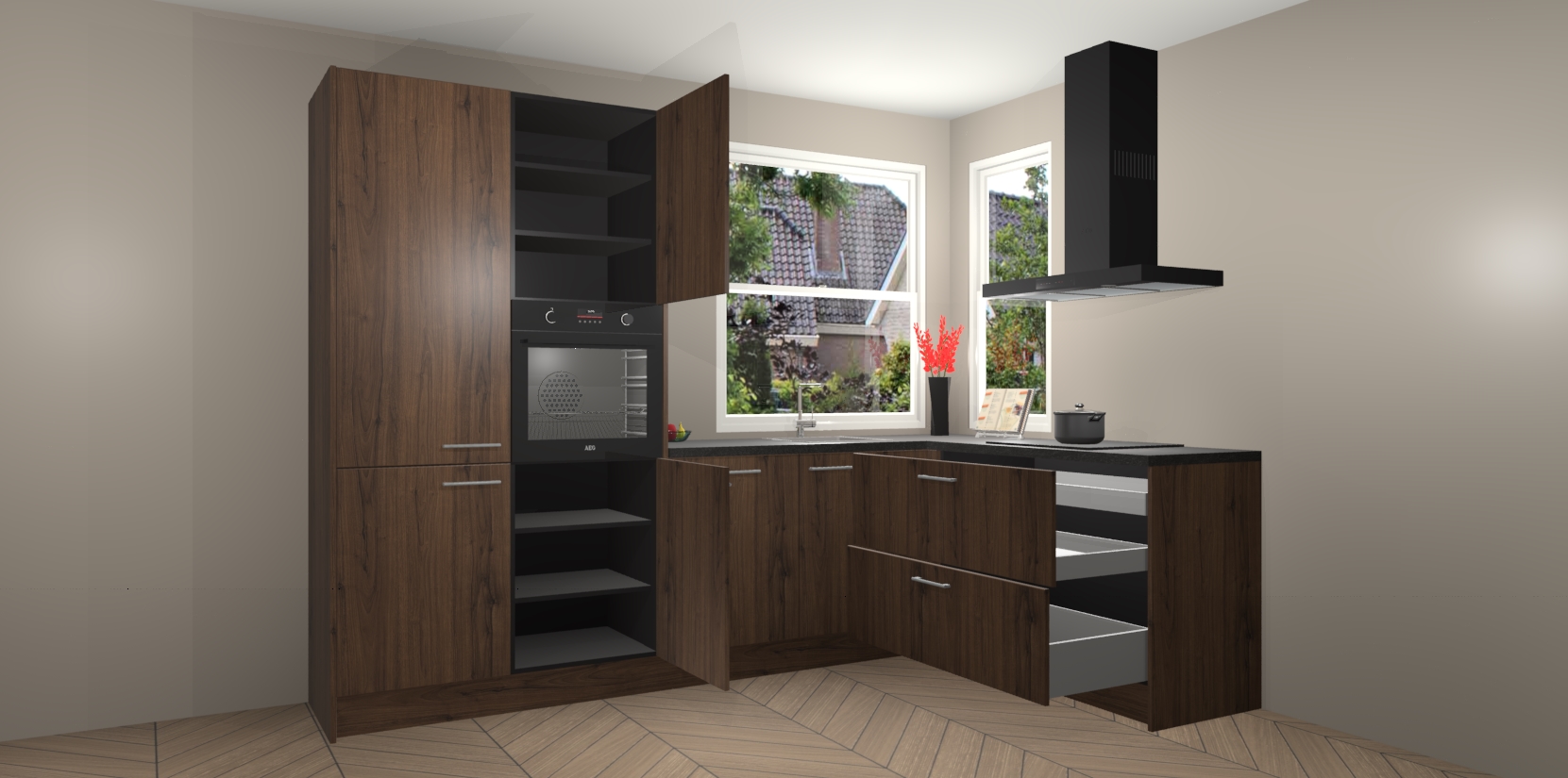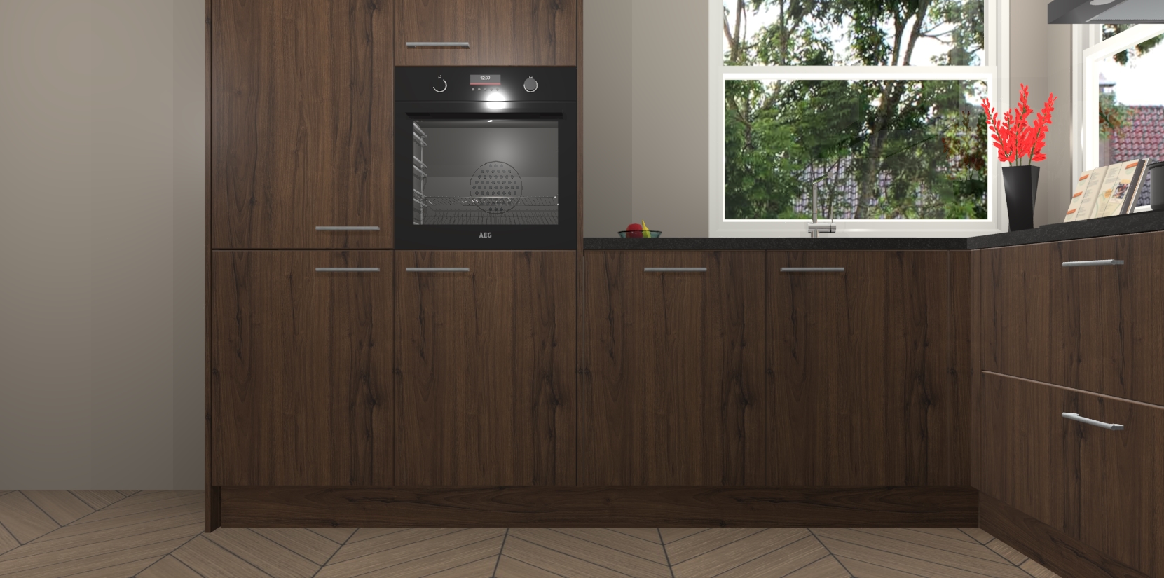 Elke Noten keuken Kotor wordt compleet geleverd met vijf inbouwapparaten, waaronder een oven, inductiekookplaat, afzuigkap, vaatwasser en koelkast. Sterker nog - indien gewenst kunt u deze apparaten na bestelling eenvoudig upgraden naar AEG! Extra functies zijn onder andere soft close deuren voor extra gemak, en elke kast wordt voor gemonteerd geleverd zodat u sneller van uw nieuwe keuken kunt genieten.
