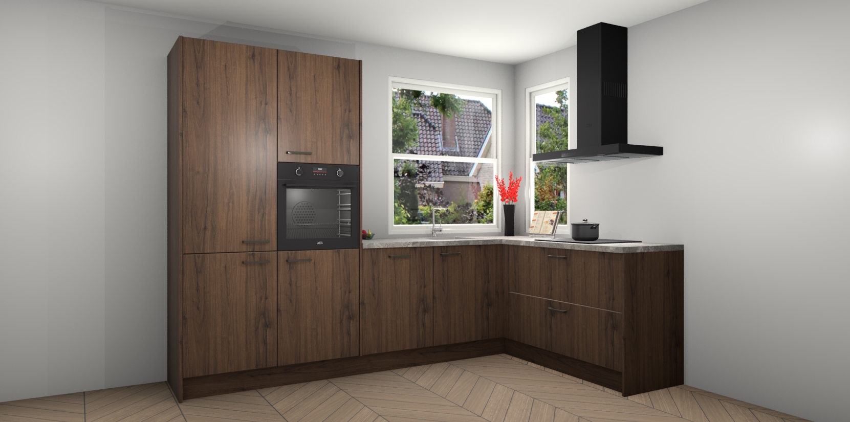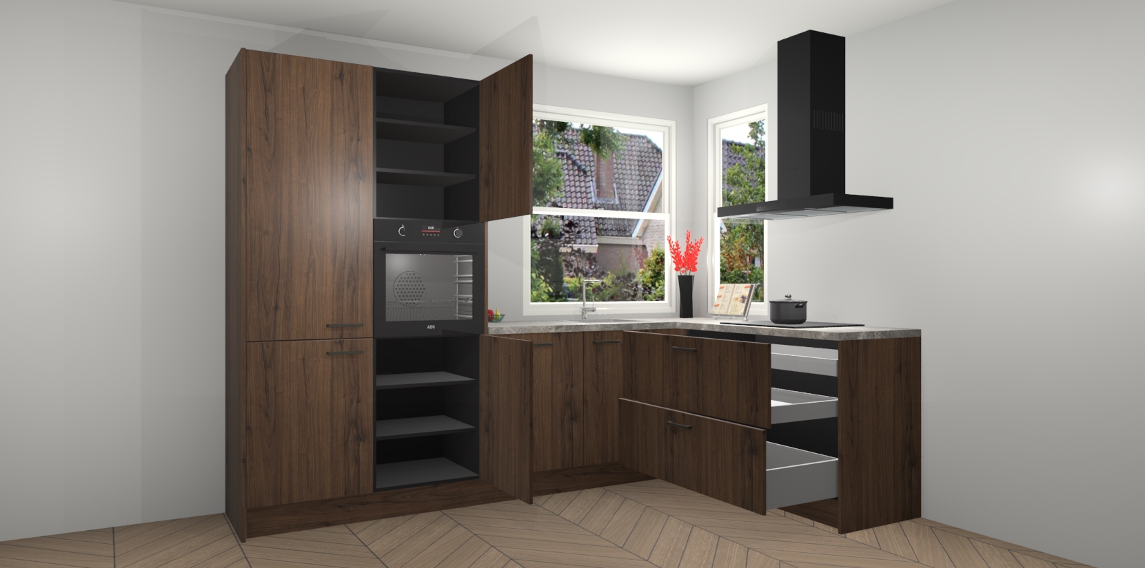 Elke Noten keuken Kotor wordt compleet geleverd met vijf inbouwapparaten, waaronder een oven, inductiekookplaat, afzuigkap, vaatwasser en koelkast. Sterker nog - indien gewenst kunt u deze apparaten na bestelling eenvoudig upgraden naar AEG! Extra functies zijn onder andere soft close deuren voor extra gemak, en elke kast wordt voor gemonteerd geleverd zodat u sneller van uw nieuwe keuken kunt genieten.