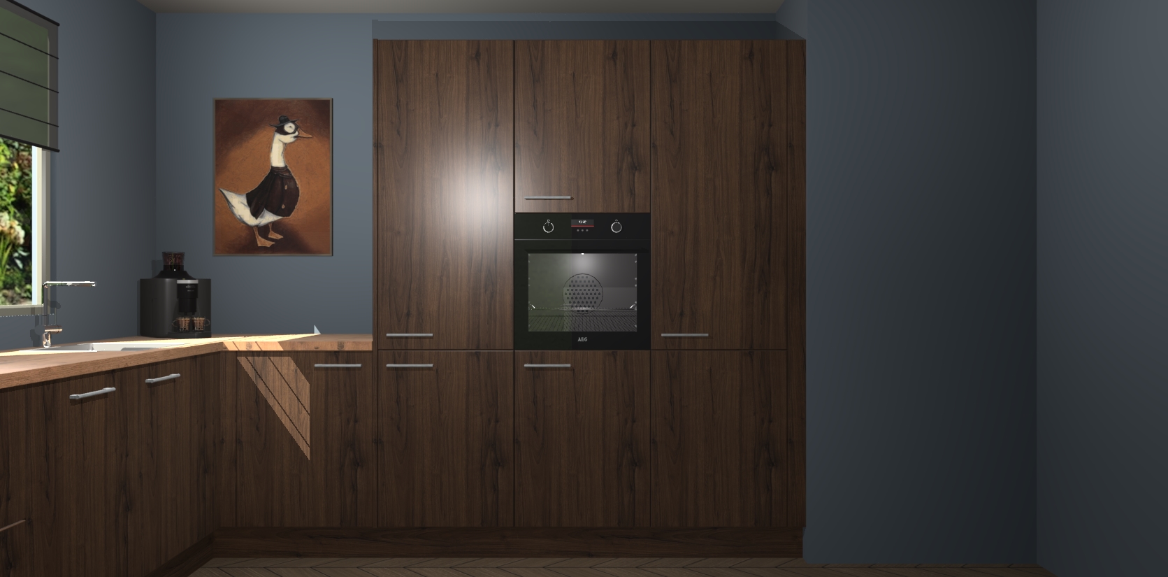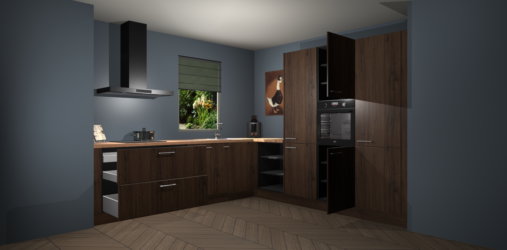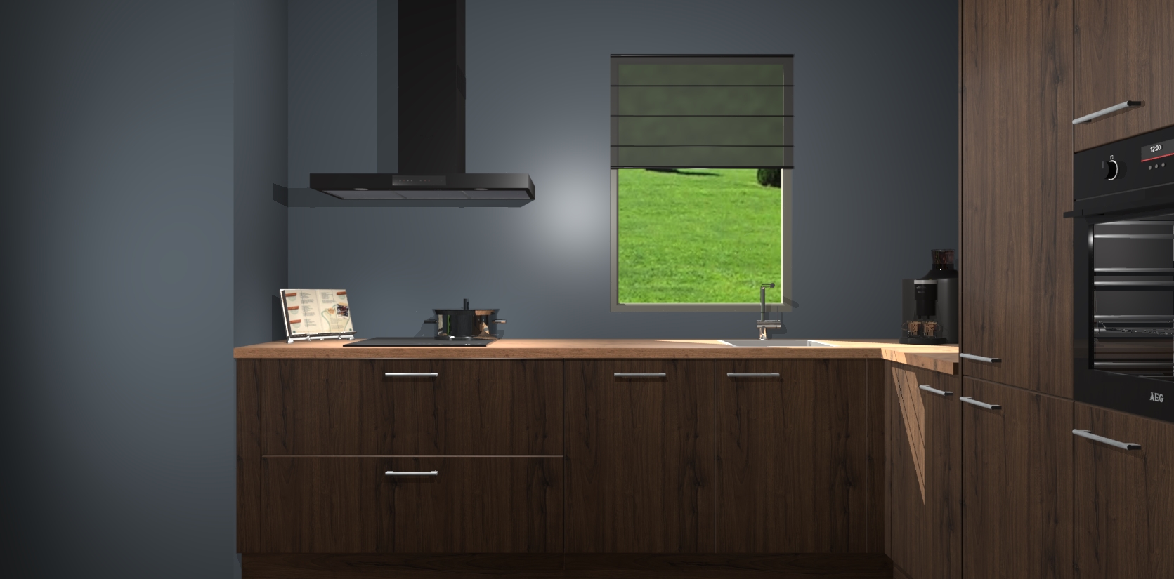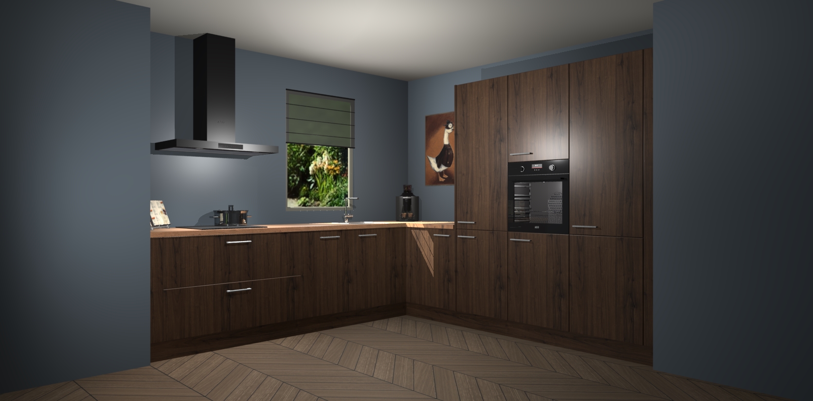 Welkom bij de Noten keuken Laos. Deze prachtige keuken zal de komende jaren het middelpunt van de belangstelling in uw huis zijn. Uitgerust met vijf inbouwapparaten komt u nooit kookgereedschap tekort. Bovendien geeft de warme houtlook elke ruimte een uitnodigende en tijdloze uitstraling.