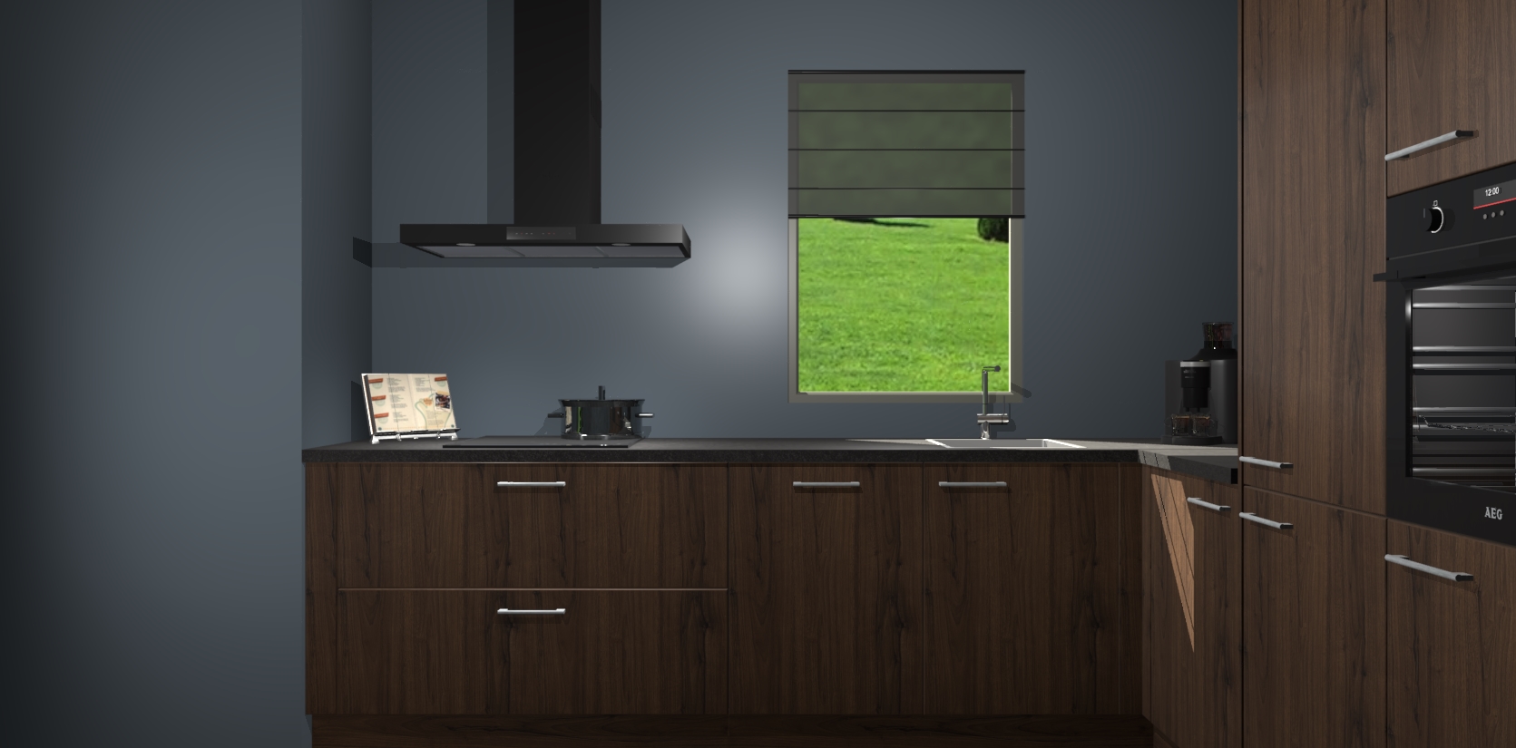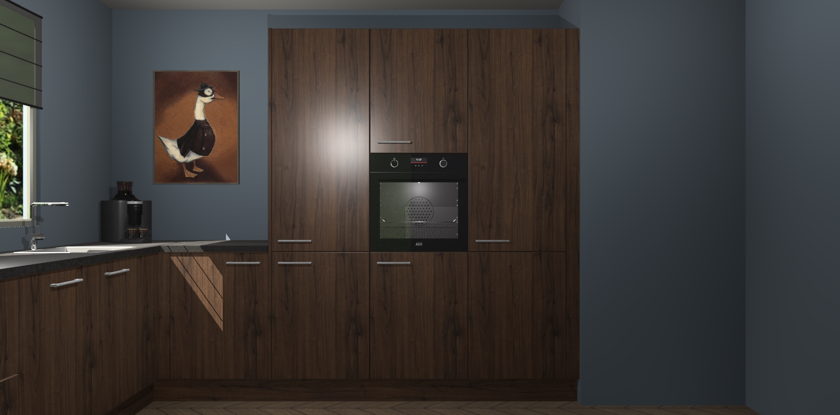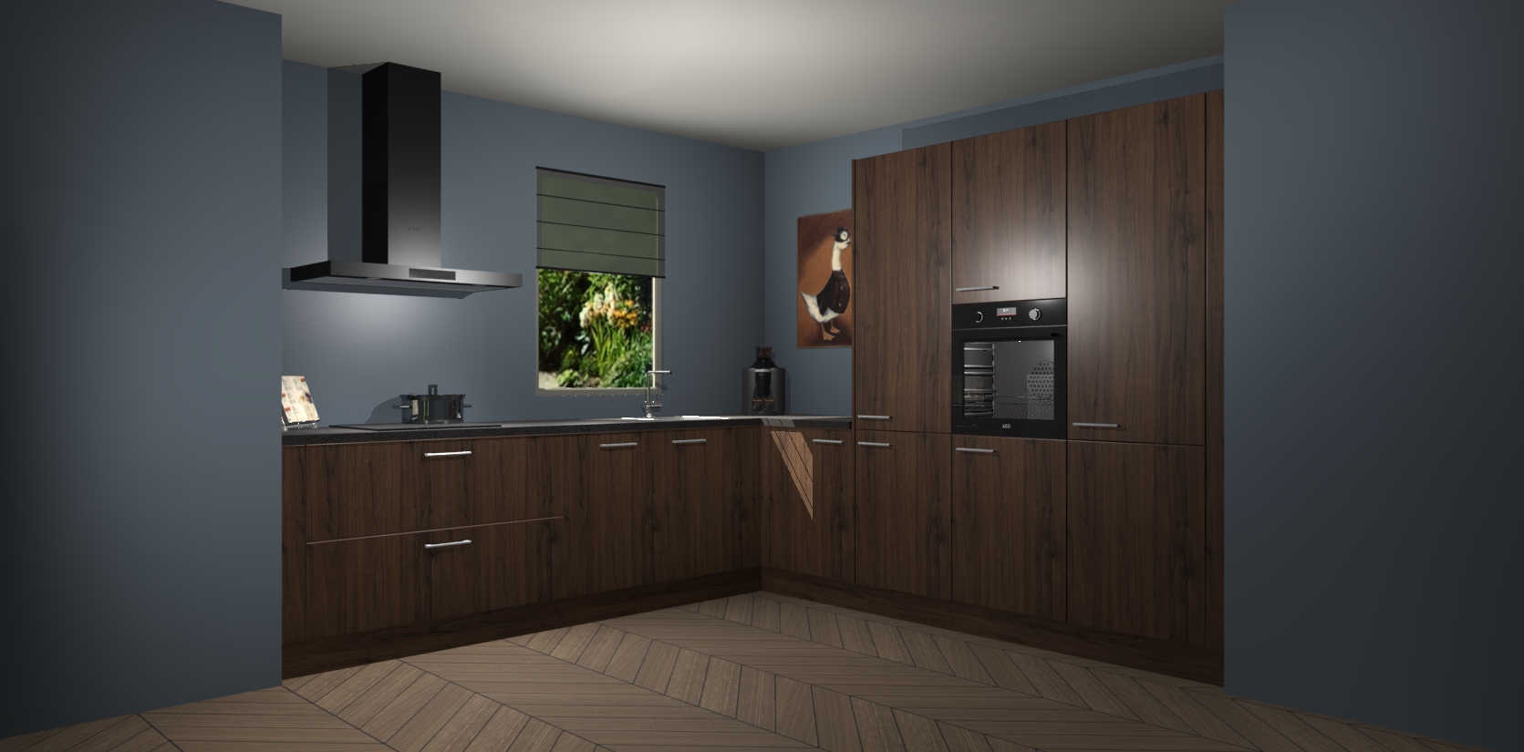 Welkom bij de Noten keuken Laos. Deze prachtige keuken zal de komende jaren het middelpunt van de belangstelling in uw huis zijn. Uitgerust met vijf inbouwapparaten komt u nooit kookgereedschap tekort. Bovendien geeft de warme houtlook elke ruimte een uitnodigende en tijdloze uitstraling.