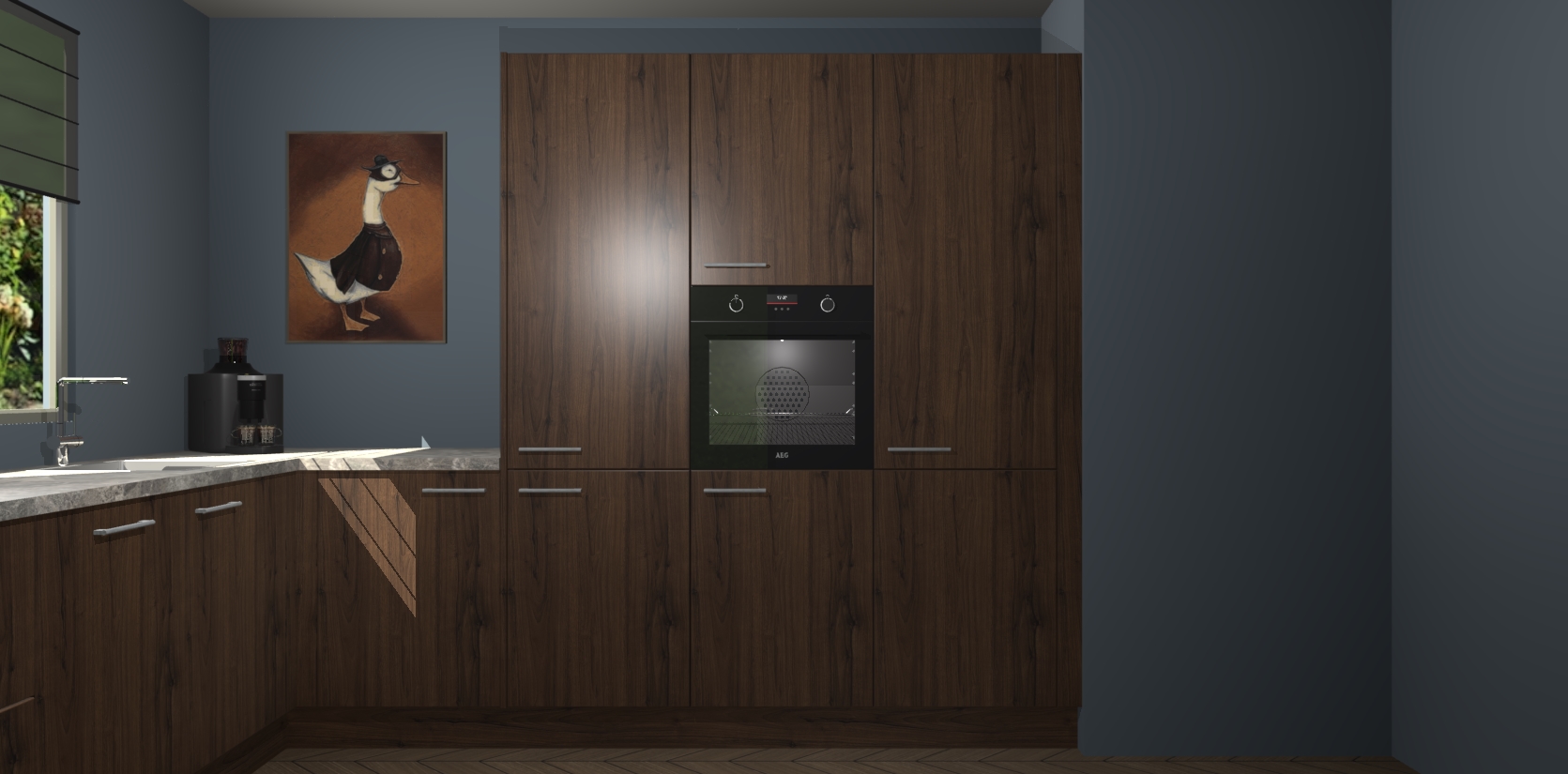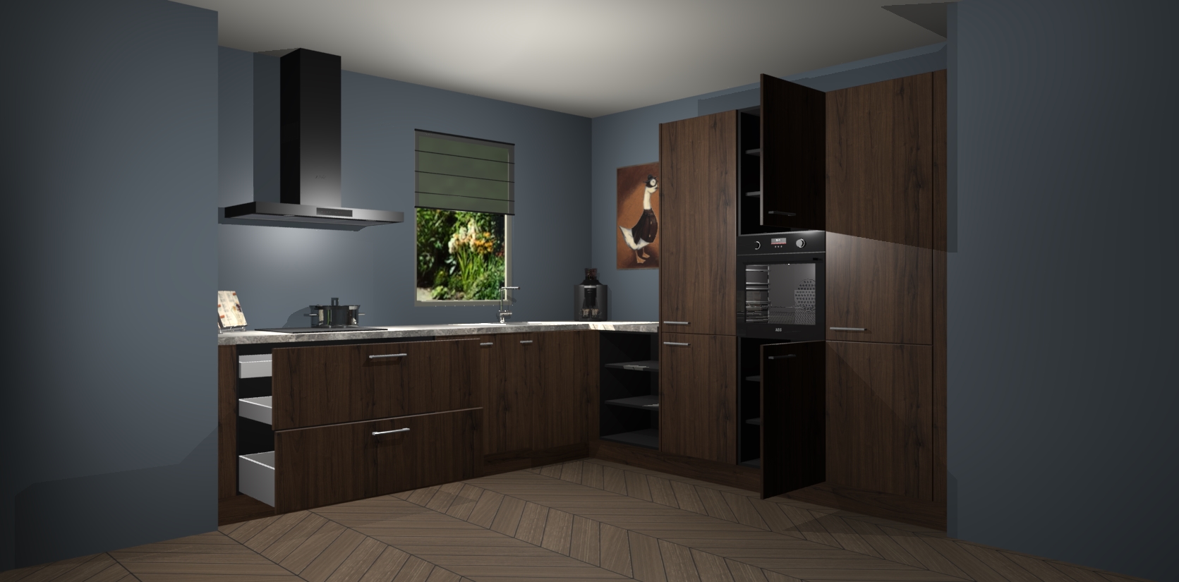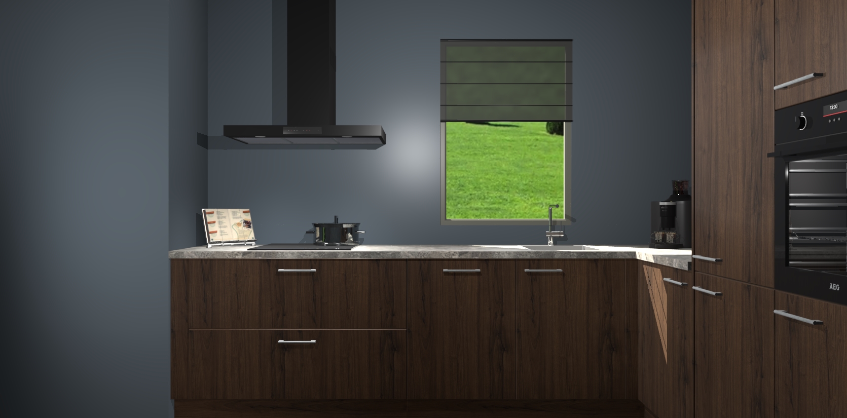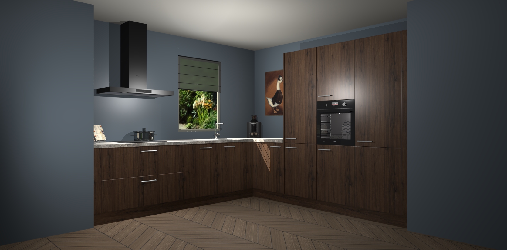 Welkom bij de Noten keuken Laos. Deze prachtige keuken zal de komende jaren het middelpunt van de belangstelling in uw huis zijn. Uitgerust met vijf inbouwapparaten komt u nooit kookgereedschap tekort. Bovendien geeft de warme houtlook elke ruimte een uitnodigende en tijdloze uitstraling.