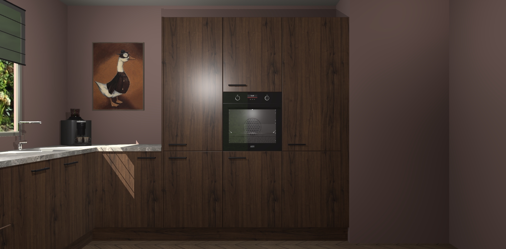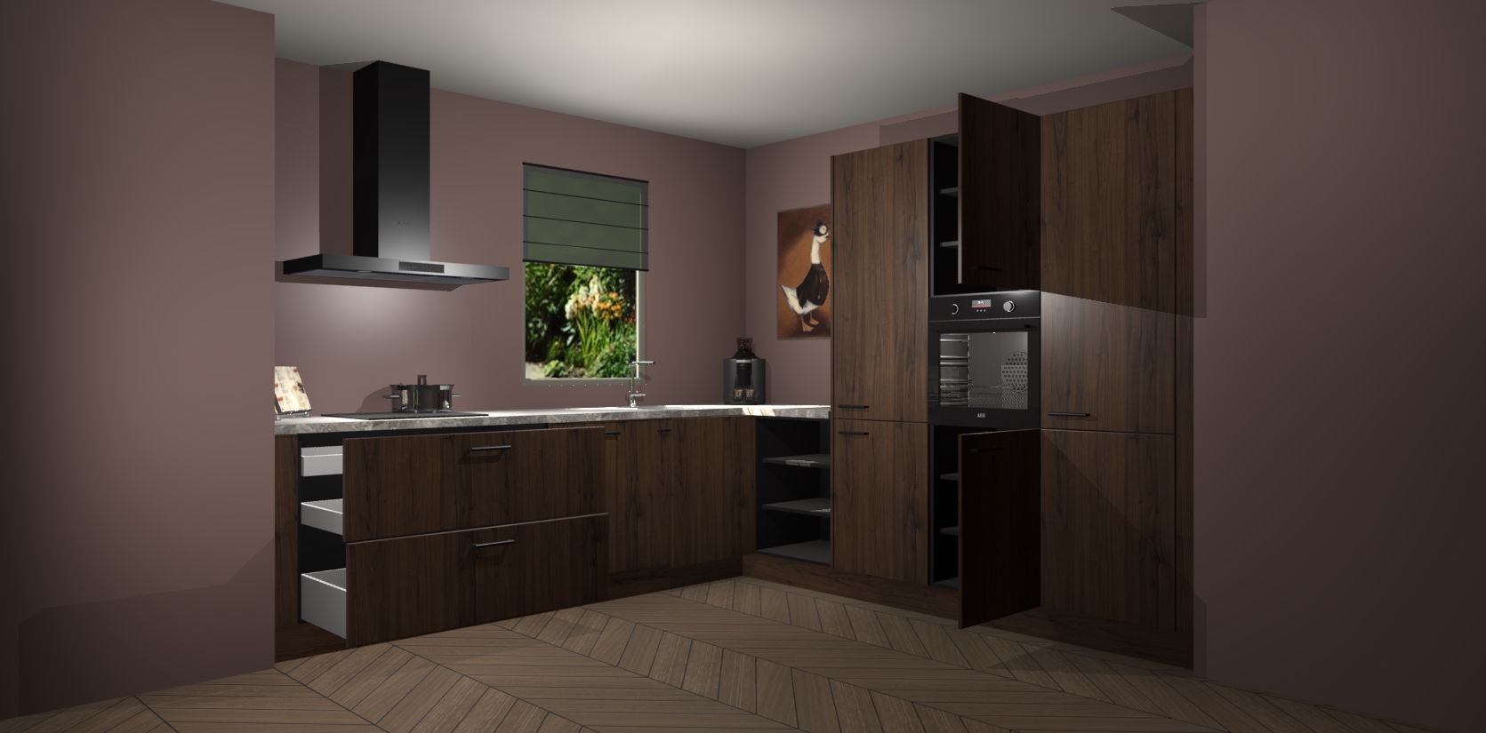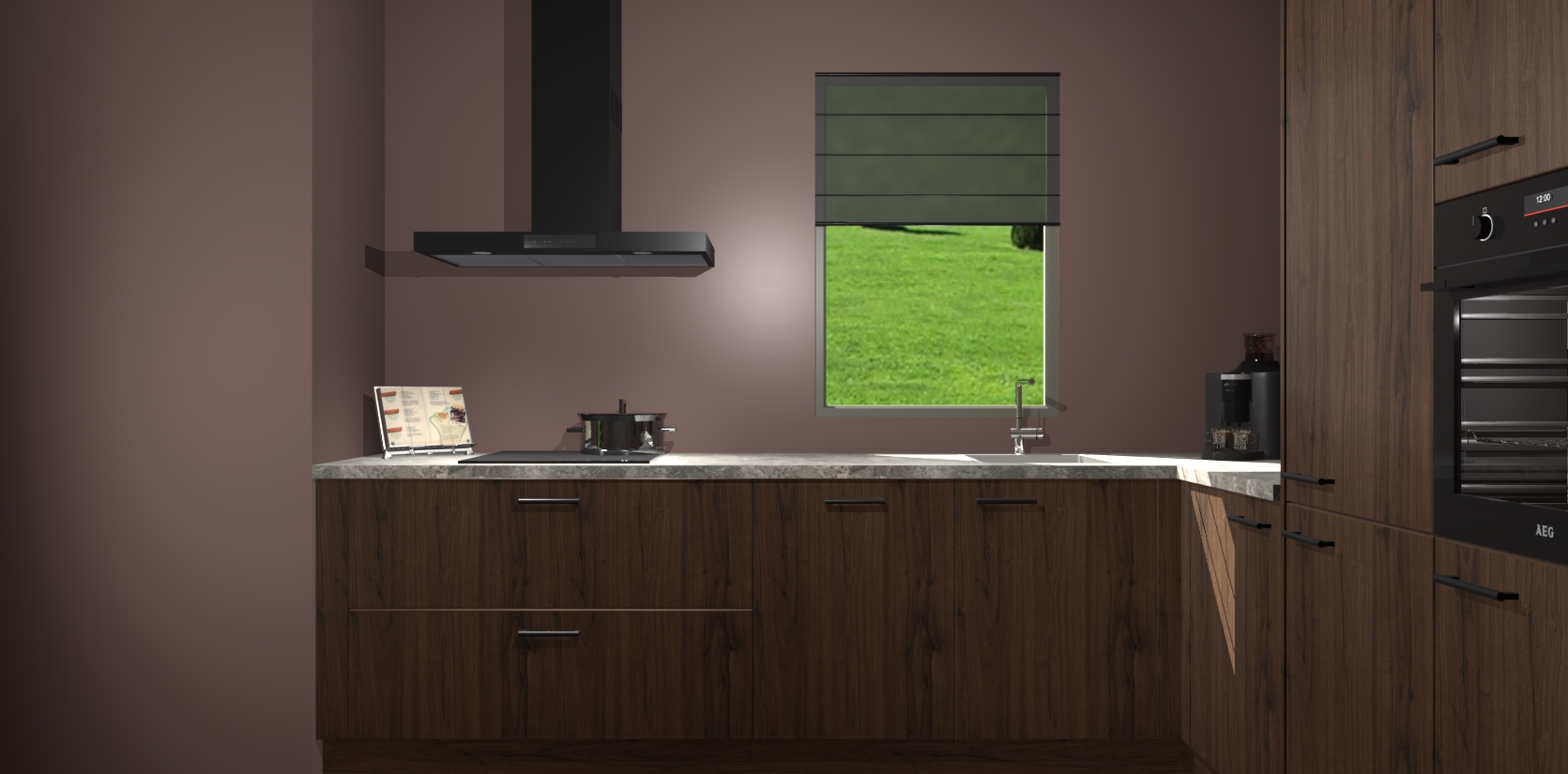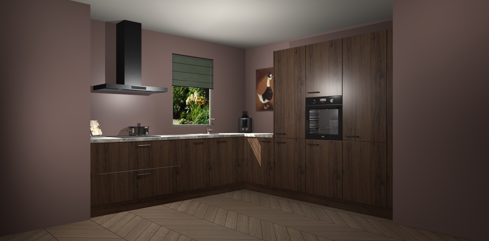 Welkom bij de Noten keuken Laos. Deze prachtige keuken zal de komende jaren het middelpunt van de belangstelling in uw huis zijn. Uitgerust met vijf inbouwapparaten komt u nooit kookgereedschap tekort. Bovendien geeft de warme houtlook elke ruimte een uitnodigende en tijdloze uitstraling.