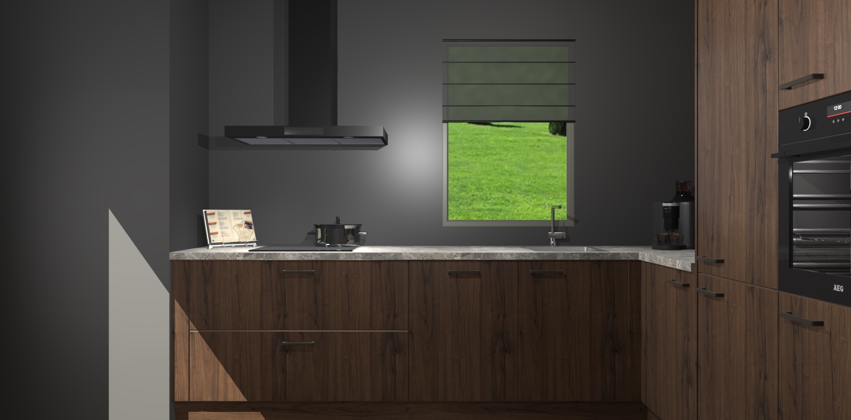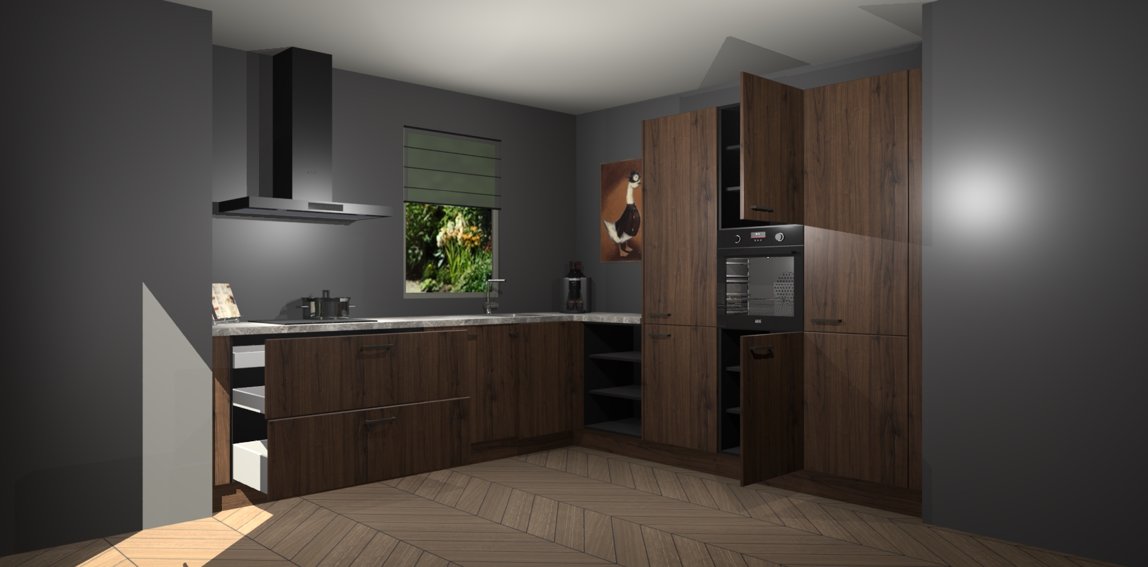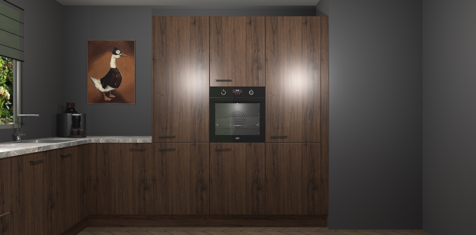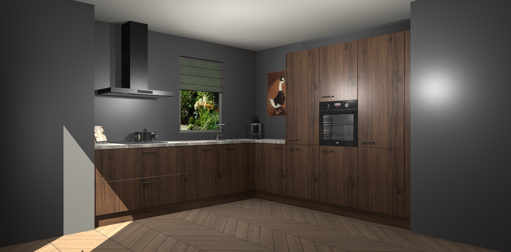 Welkom bij de Noten keuken Laos. Deze prachtige keuken zal de komende jaren het middelpunt van de belangstelling in uw huis zijn. Uitgerust met vijf inbouwapparaten komt u nooit kookgereedschap tekort. Bovendien geeft de warme houtlook elke ruimte een uitnodigende en tijdloze uitstraling.