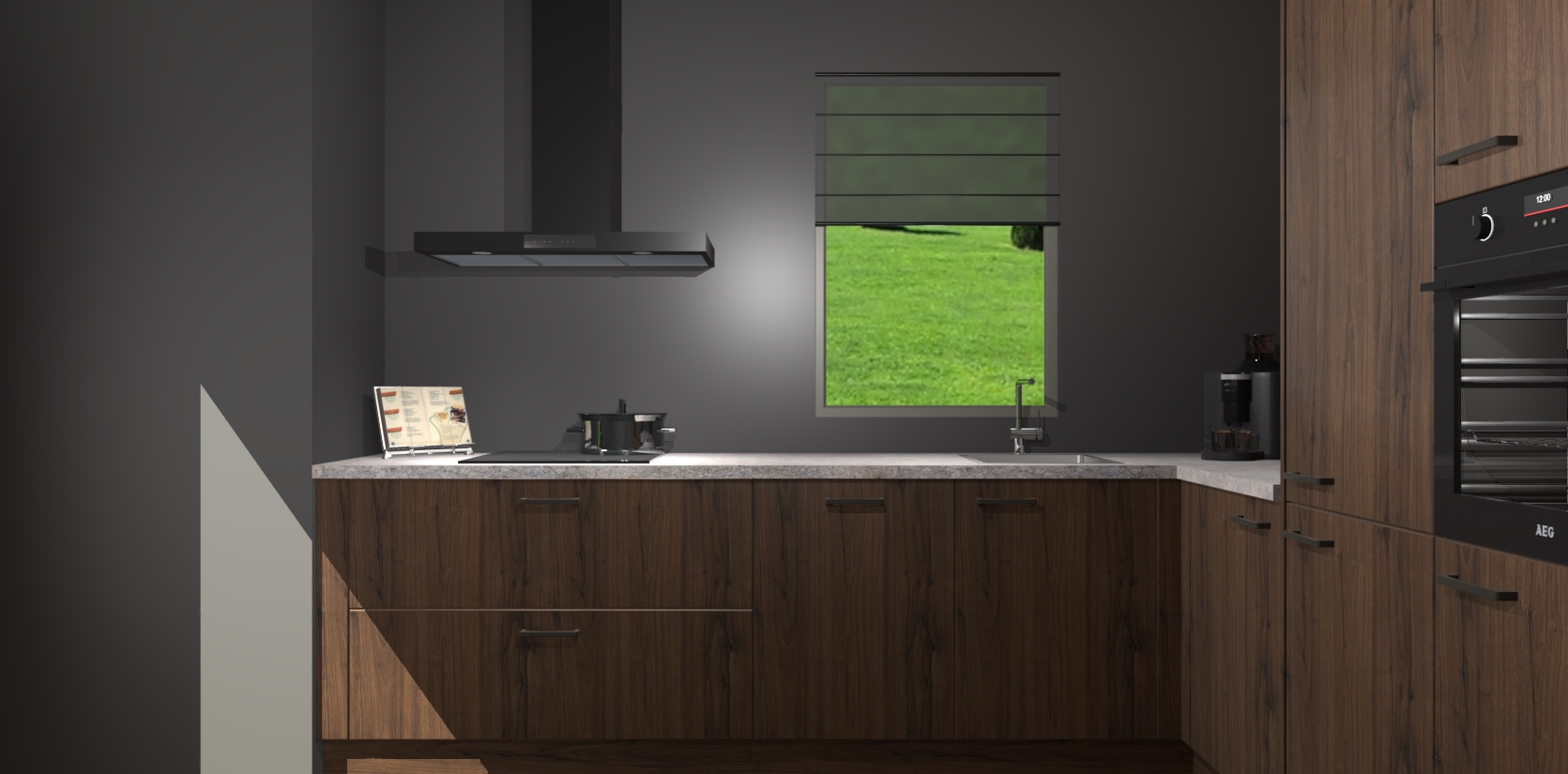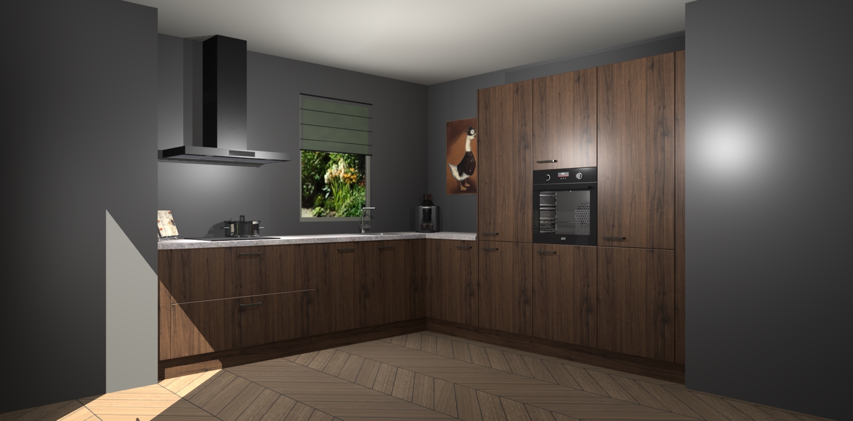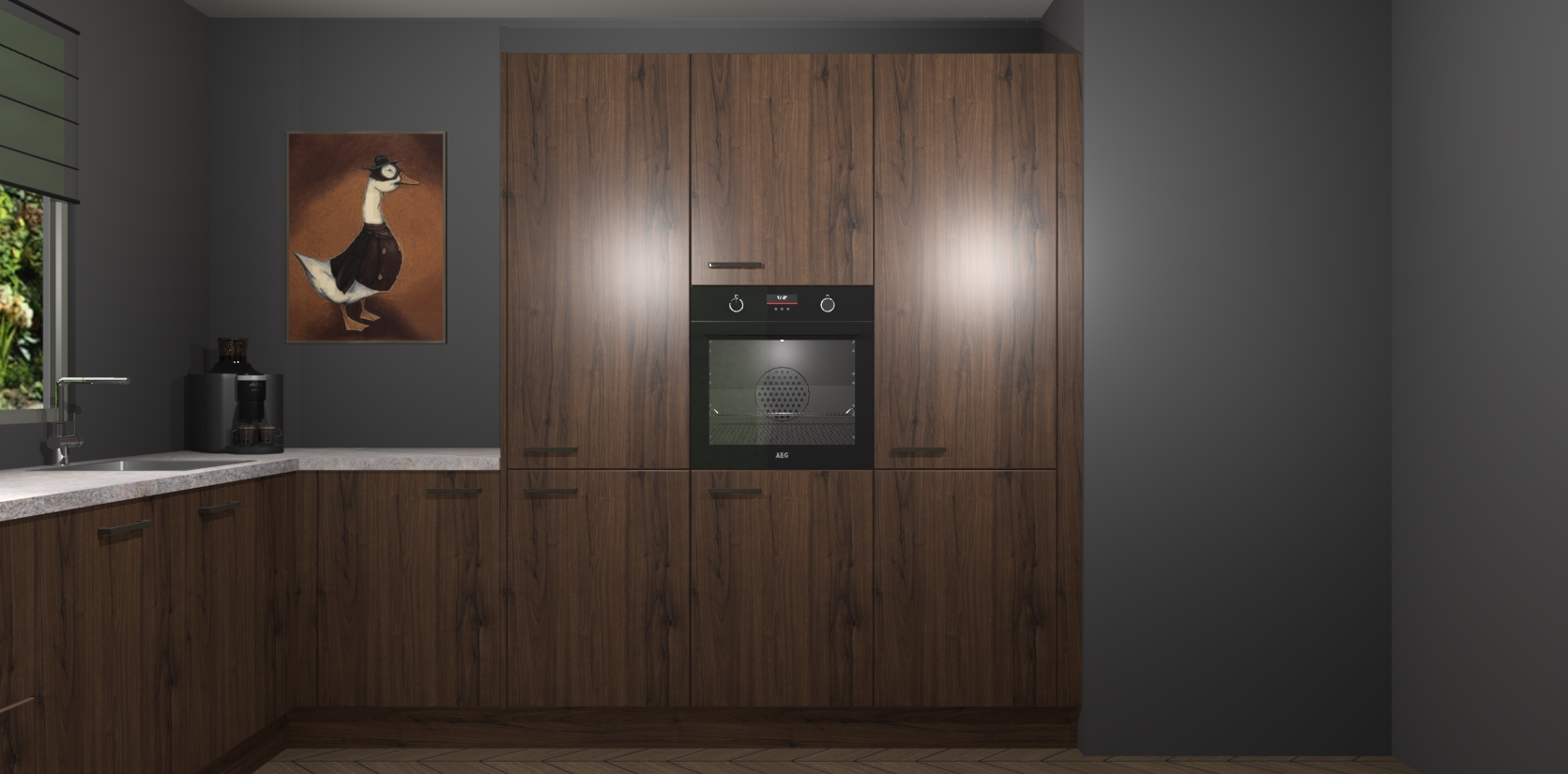 Welkom bij de Noten keuken Laos. Deze prachtige keuken zal de komende jaren het middelpunt van de belangstelling in uw huis zijn. Uitgerust met vijf inbouwapparaten komt u nooit kookgereedschap tekort. Bovendien geeft de warme houtlook elke ruimte een uitnodigende en tijdloze uitstraling.