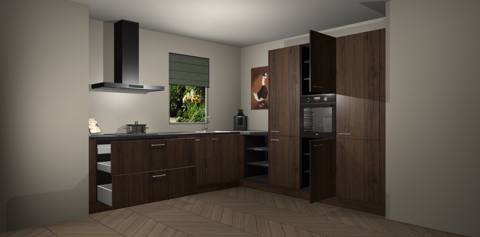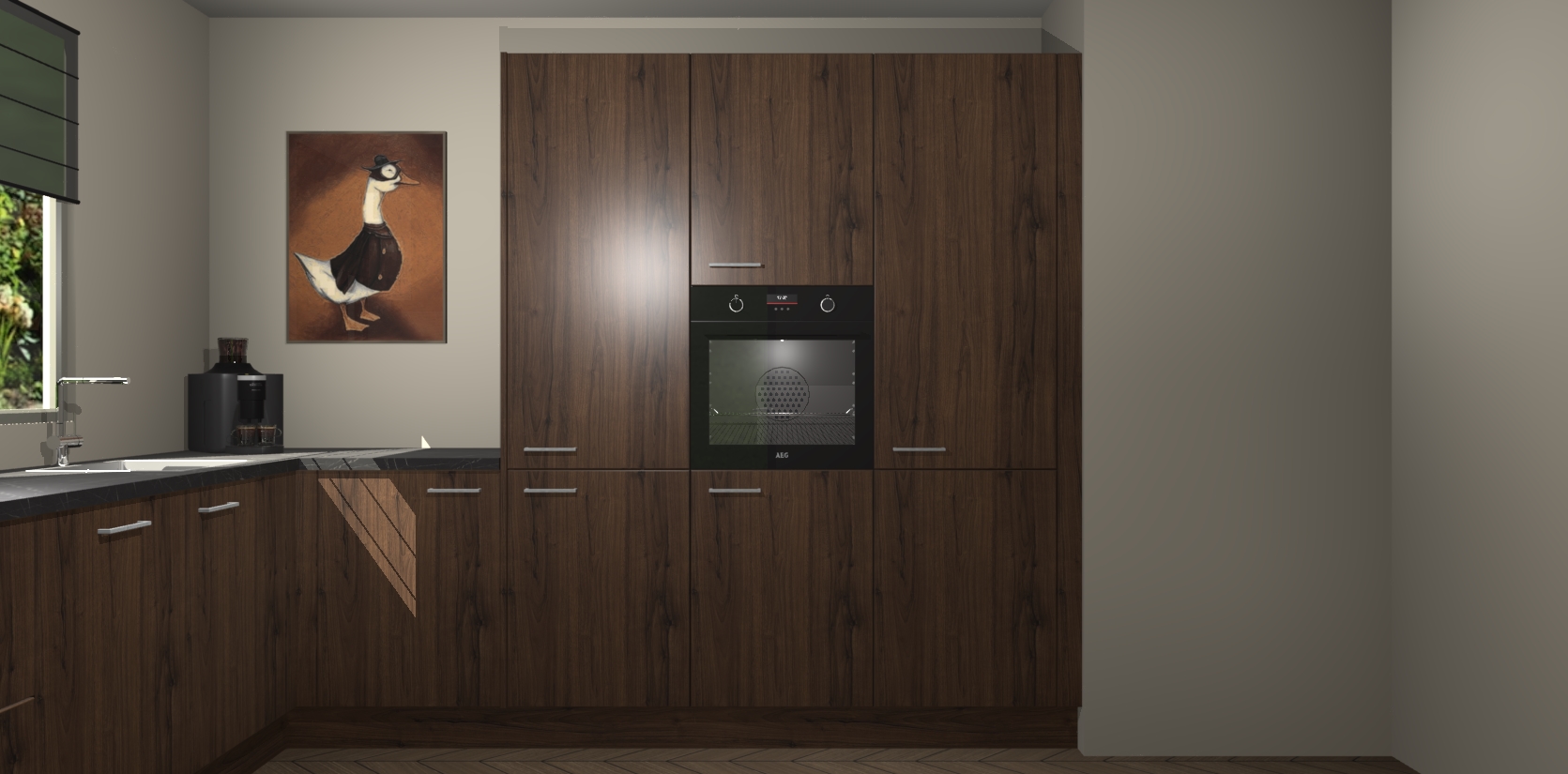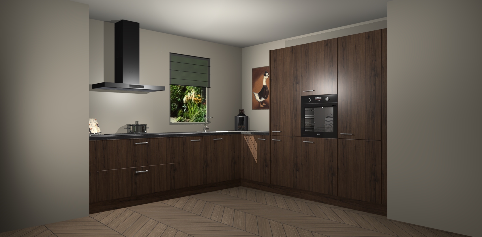Welkom bij de Noten keuken Laos. Deze prachtige keuken zal de komende jaren het middelpunt van de belangstelling in uw huis zijn. Uitgerust met vijf inbouwapparaten komt u nooit kookgereedschap tekort. Bovendien geeft de warme houtlook elke ruimte een uitnodigende en tijdloze uitstraling.