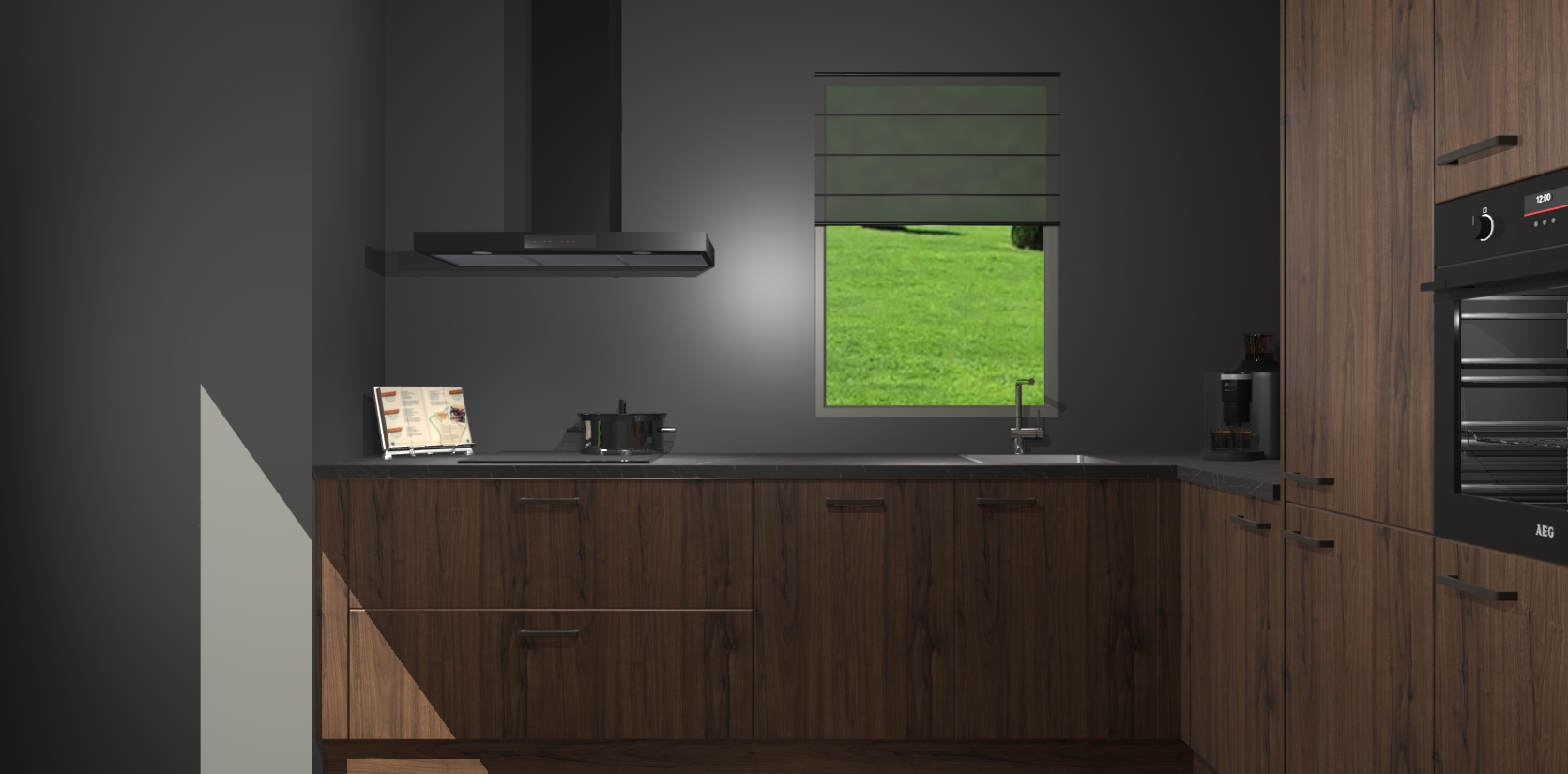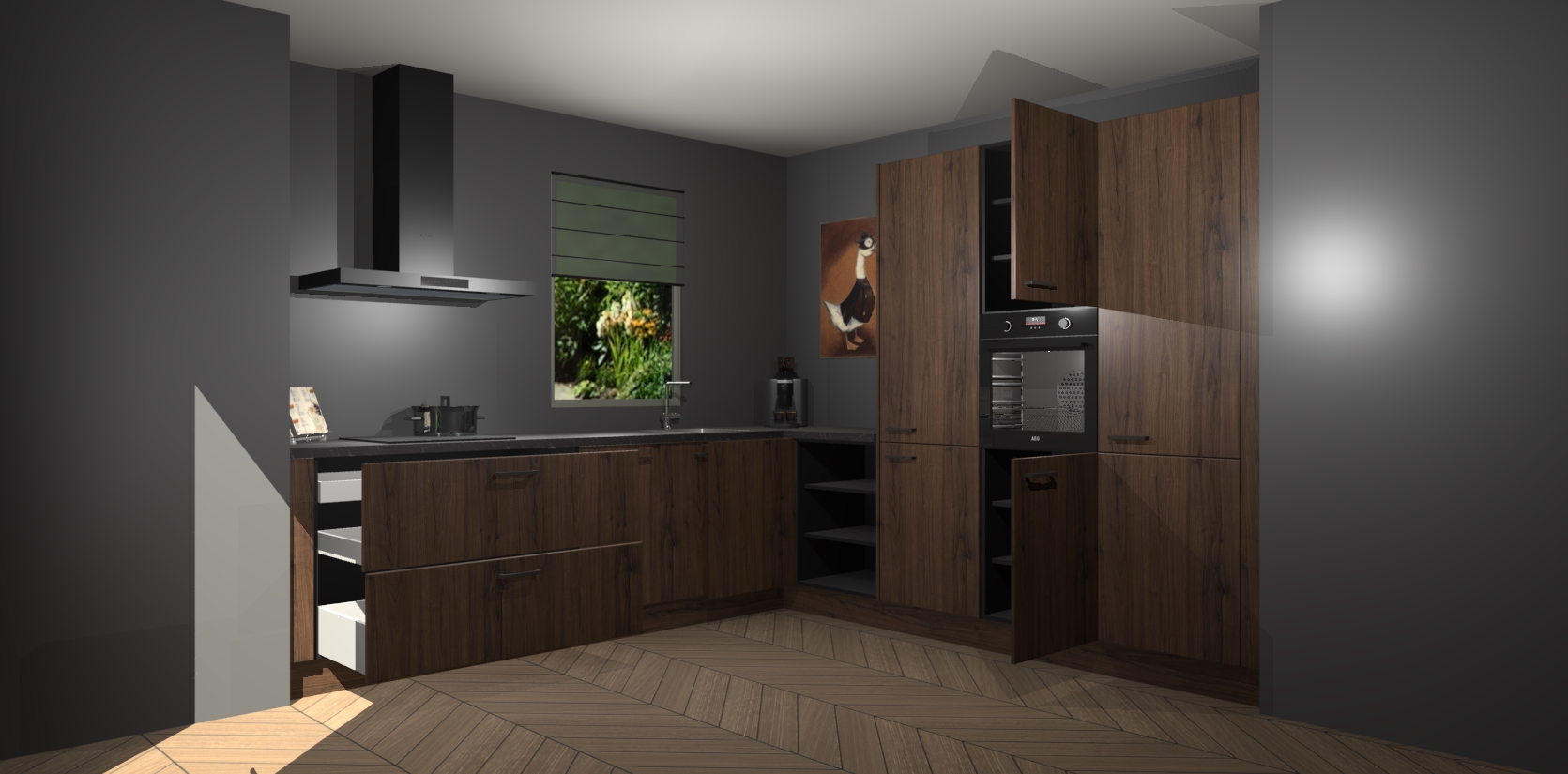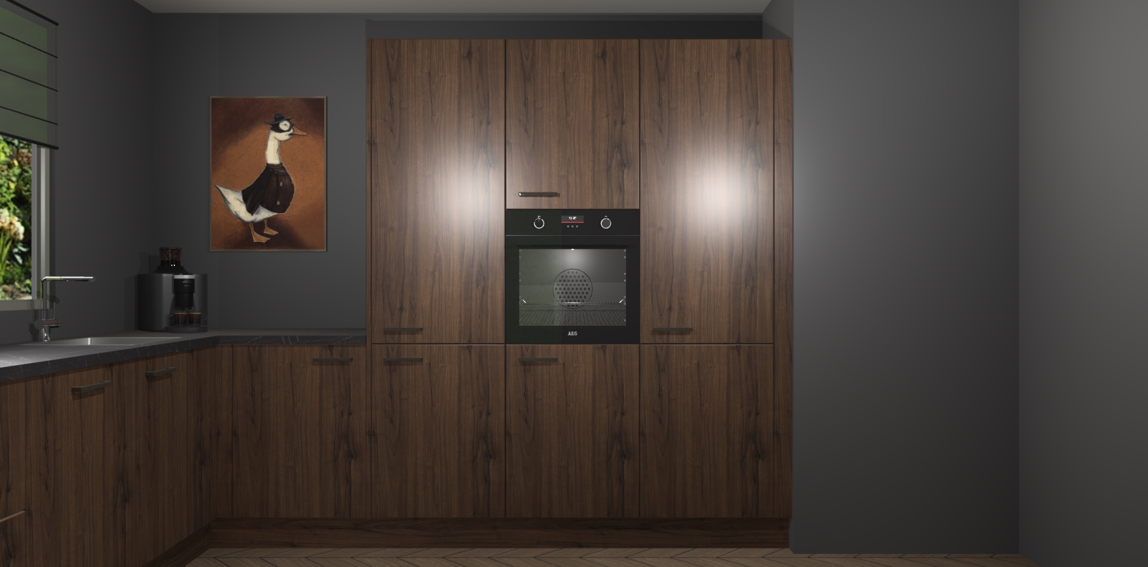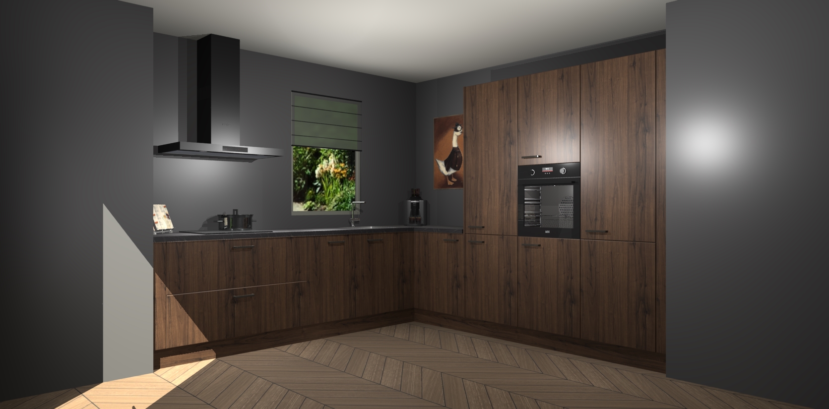 Welkom bij de Noten keuken Laos. Deze prachtige keuken zal de komende jaren het middelpunt van de belangstelling in uw huis zijn. Uitgerust met vijf inbouwapparaten komt u nooit kookgereedschap tekort. Bovendien geeft de warme houtlook elke ruimte een uitnodigende en tijdloze uitstraling.