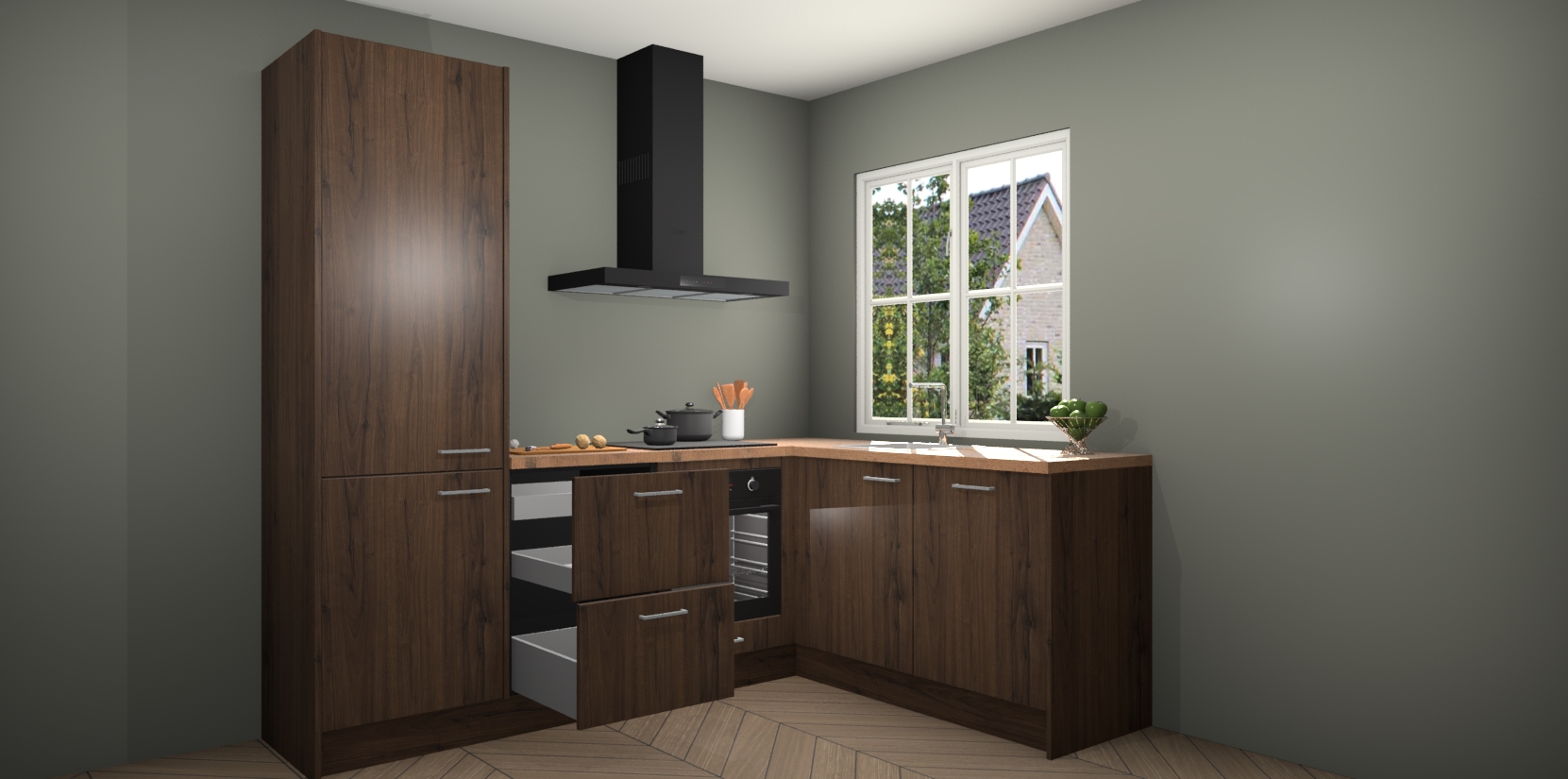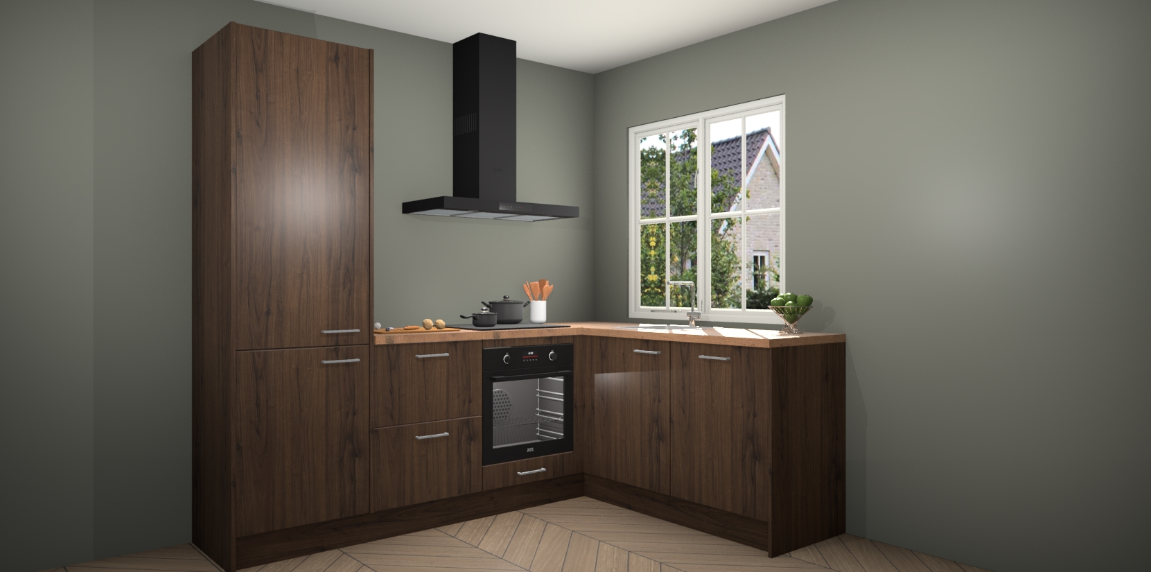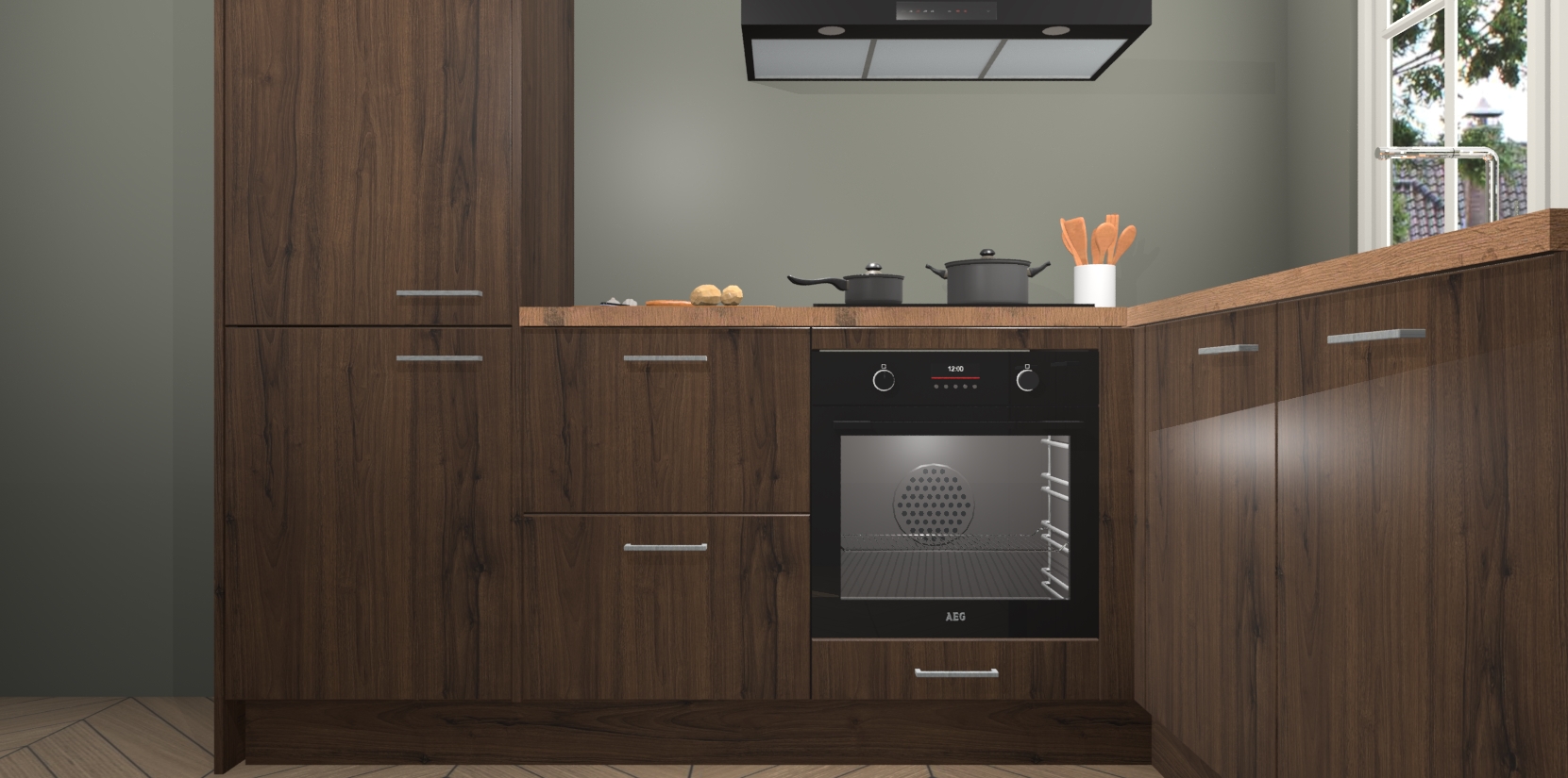 De Noten keuken Linz is de perfecte keuze voor uw nieuwe moderne en tijdloze keuken. Ga voor moderne en tijdloze elegantie in uw keuken. De prachtige hoekkeuken biedt een verfrissende kijk op de manier waarop we ons vertrouwde keukenontwerp kunnen aanpassen in een nieuwe stijl.  Één blik om alles te zien: zo mooi dat het bijna magisch lijkt.