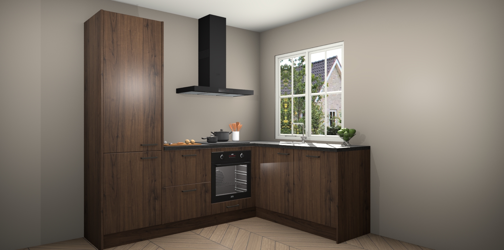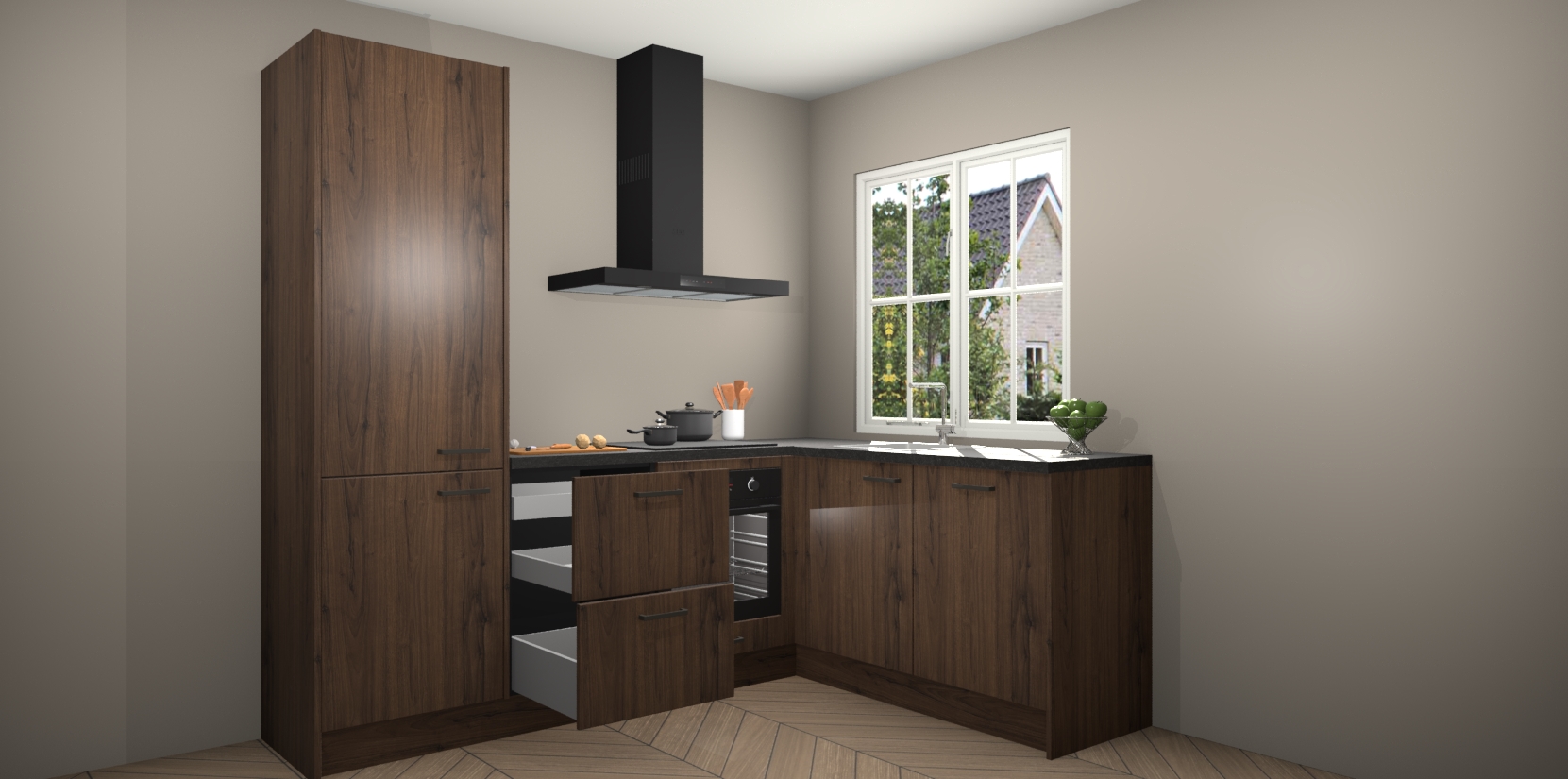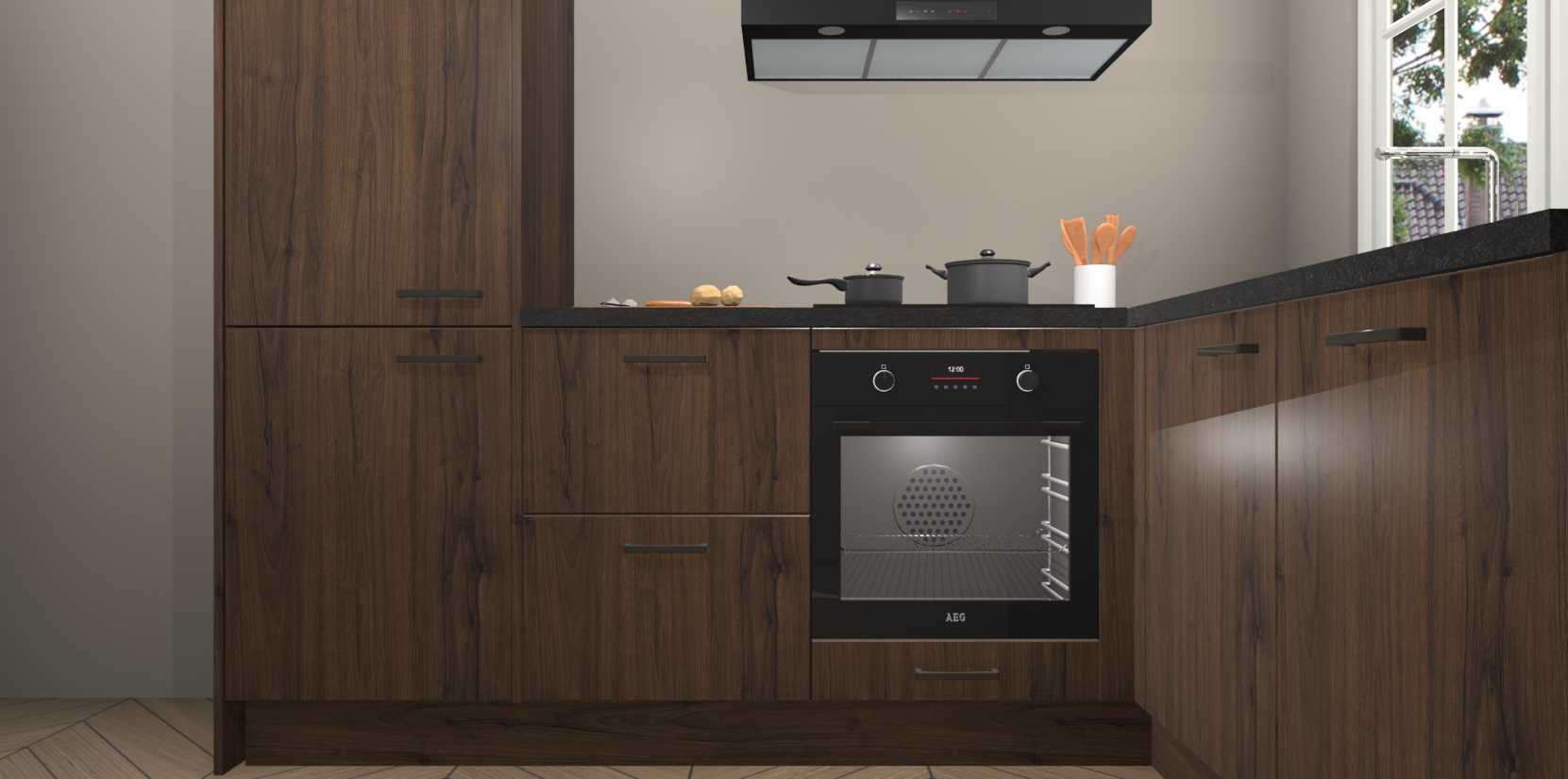 De Noten keuken Linz is de perfecte keuze voor uw nieuwe moderne en tijdloze keuken. Ga voor moderne en tijdloze elegantie in uw keuken. De prachtige hoekkeuken biedt een verfrissende kijk op de manier waarop we ons vertrouwde keukenontwerp kunnen aanpassen in een nieuwe stijl.  Één blik om alles te zien: zo mooi dat het bijna magisch lijkt.