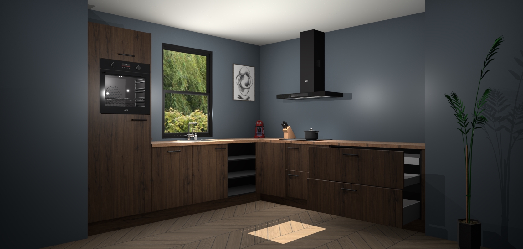 Welkom bij de noten eiken keuken Lublin. Deze prachtige keuken zal de komende jaren het middelpunt van de belangstelling in uw huis zijn. Uitgerust met vijf inbouwapparaten komt u nooit kookgereedschap tekort. Bovendien geeft de warme houtlook elke ruimte een uitnodigende en tijdloze uitstraling.
