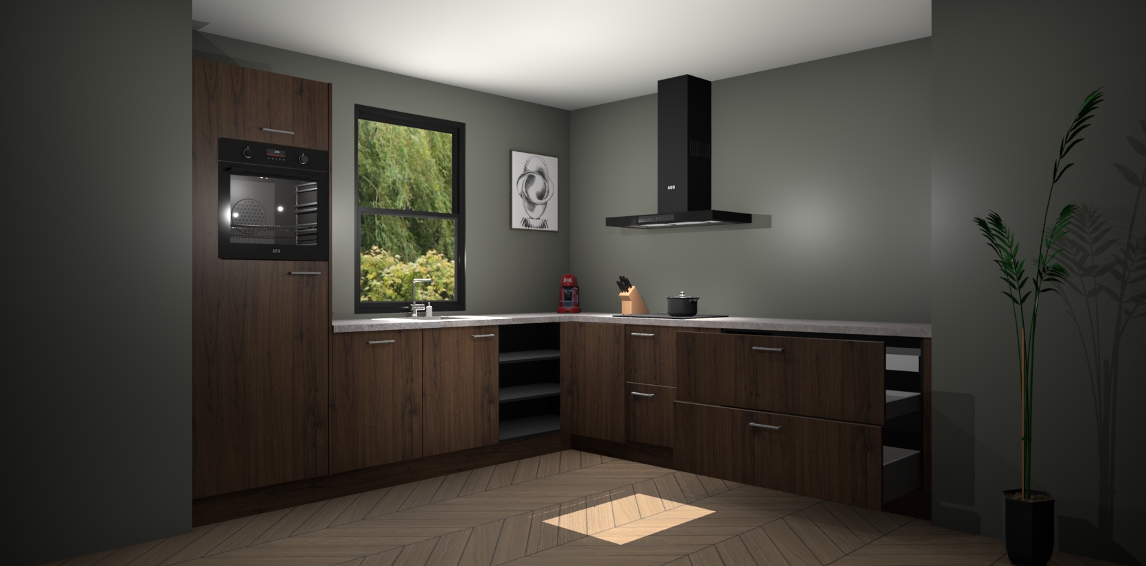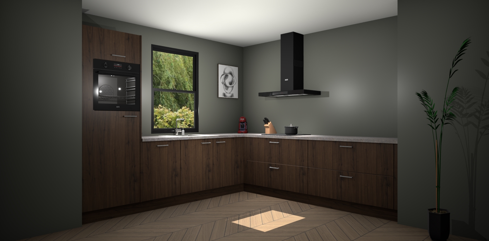 Welkom bij de noten keuken Lublin. Deze prachtige keuken zal de komende jaren het middelpunt van de belangstelling in uw huis zijn. Uitgerust met vijf inbouwapparaten komt u nooit kookgereedschap tekort. Bovendien geeft de warme houtlook elke ruimte een uitnodigende en tijdloze uitstraling.