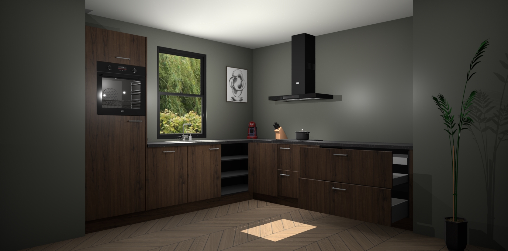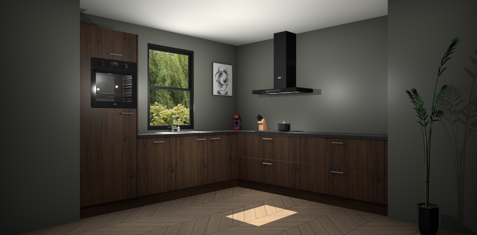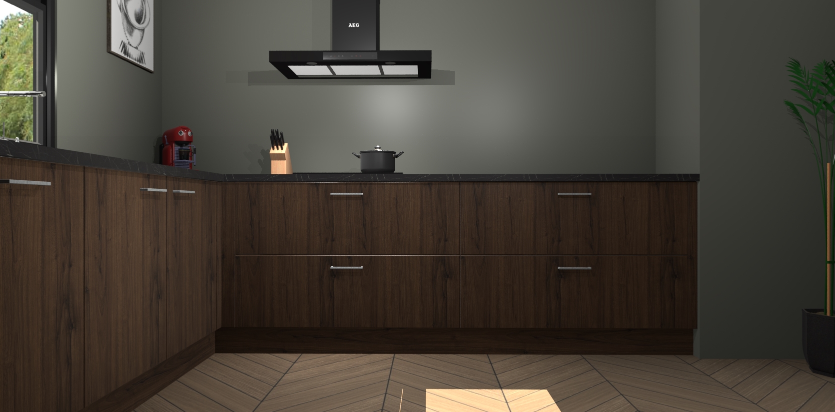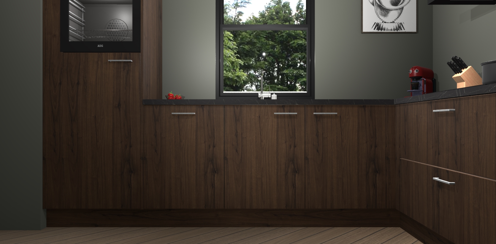 Welkom bij de noten keuken Lublin. Deze prachtige keuken zal de komende jaren het middelpunt van de belangstelling in uw huis zijn. Uitgerust met vijf inbouwapparaten komt u nooit kookgereedschap tekort. Bovendien geeft de warme houtlook elke ruimte een uitnodigende en tijdloze uitstraling.