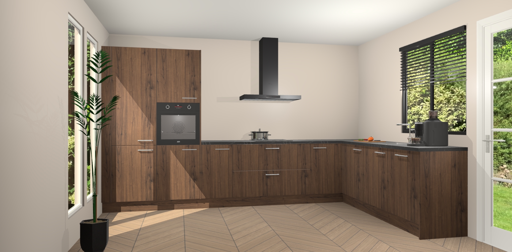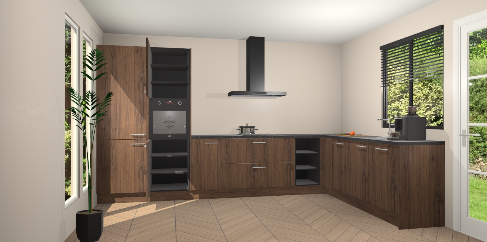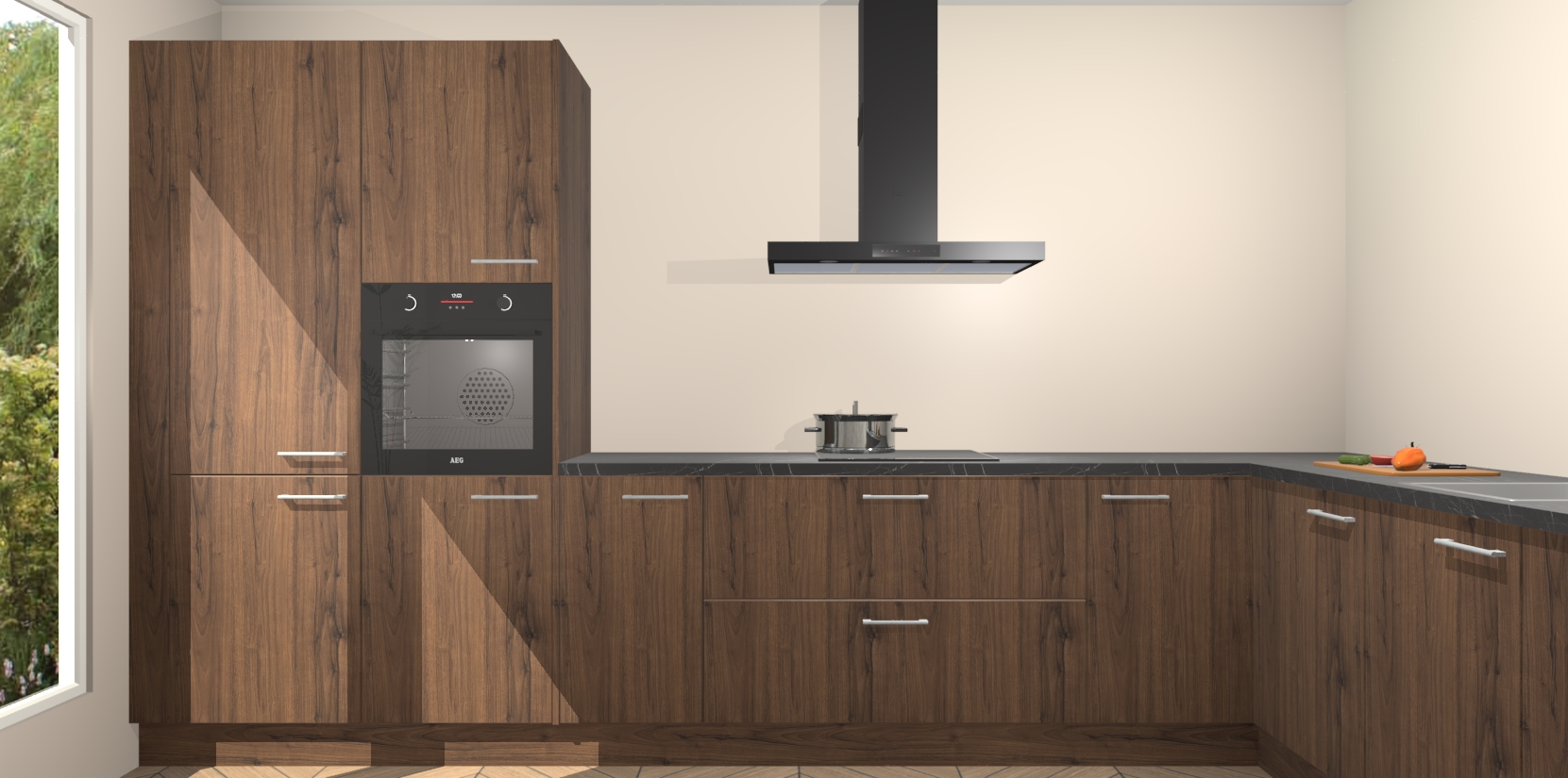 Met een modern, tijdloos design en ruime opslagruimte, zult u zich in no-time thuis voelen in uw nieuwe keuken. Uw leven wordt eenvoudiger met de soft-close deuren die voor het ultieme stille comfort zorgen - geen geluid dat u stoort terwijl u kookt. Ook is de keuken voorzien van 5 ingebouwde apparaten: een oven, inductie kookplaat, afzuigkap, vaatwasser en koelkast. Deze kunnen gemakkelijk na bestelling worden bijgewerkt naar AEG - waardoor uw luxe ervaring compleet is.