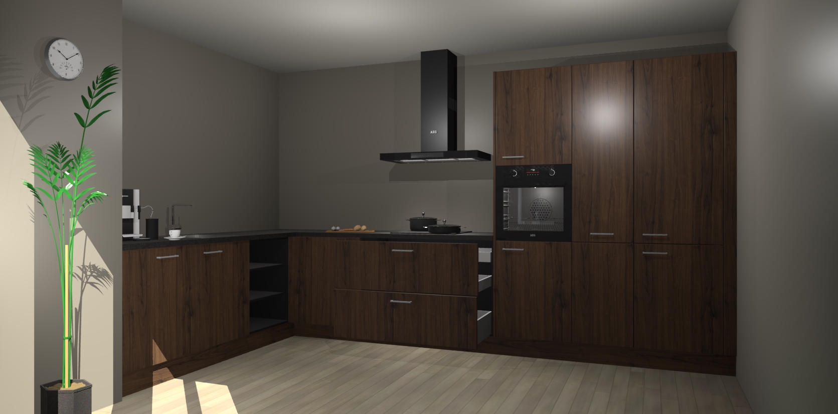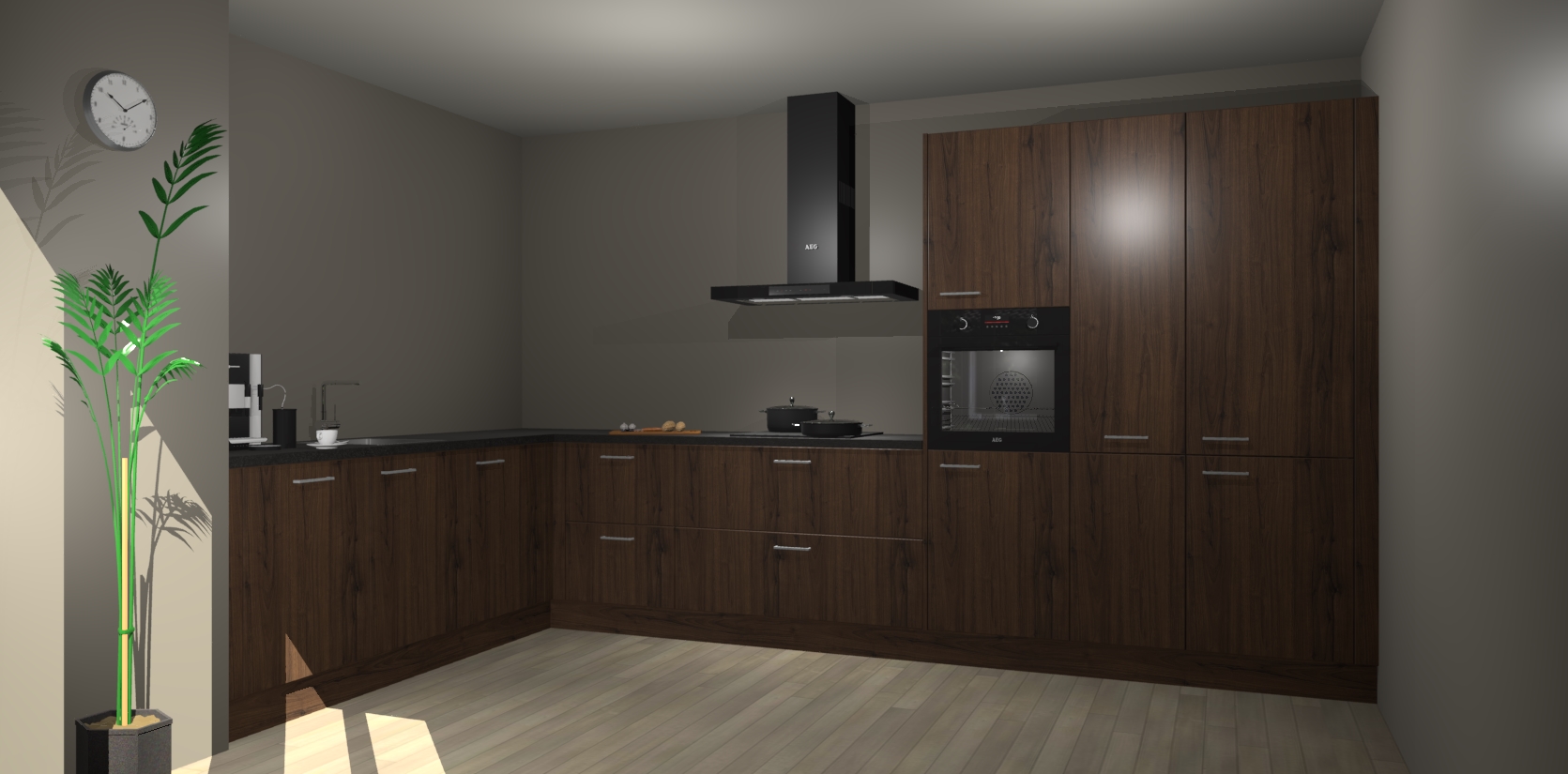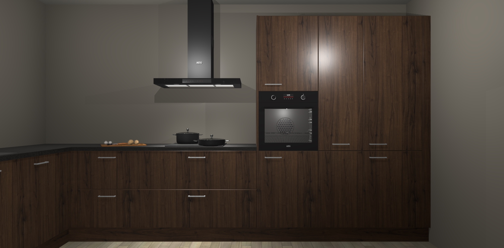 Welkom bij de noten keuken Nuuk. Deze prachtige keuken zal de komende jaren het middelpunt van de belangstelling in uw huis zijn. Uitgerust met vijf inbouwapparaten komt u nooit kookgereedschap tekort.