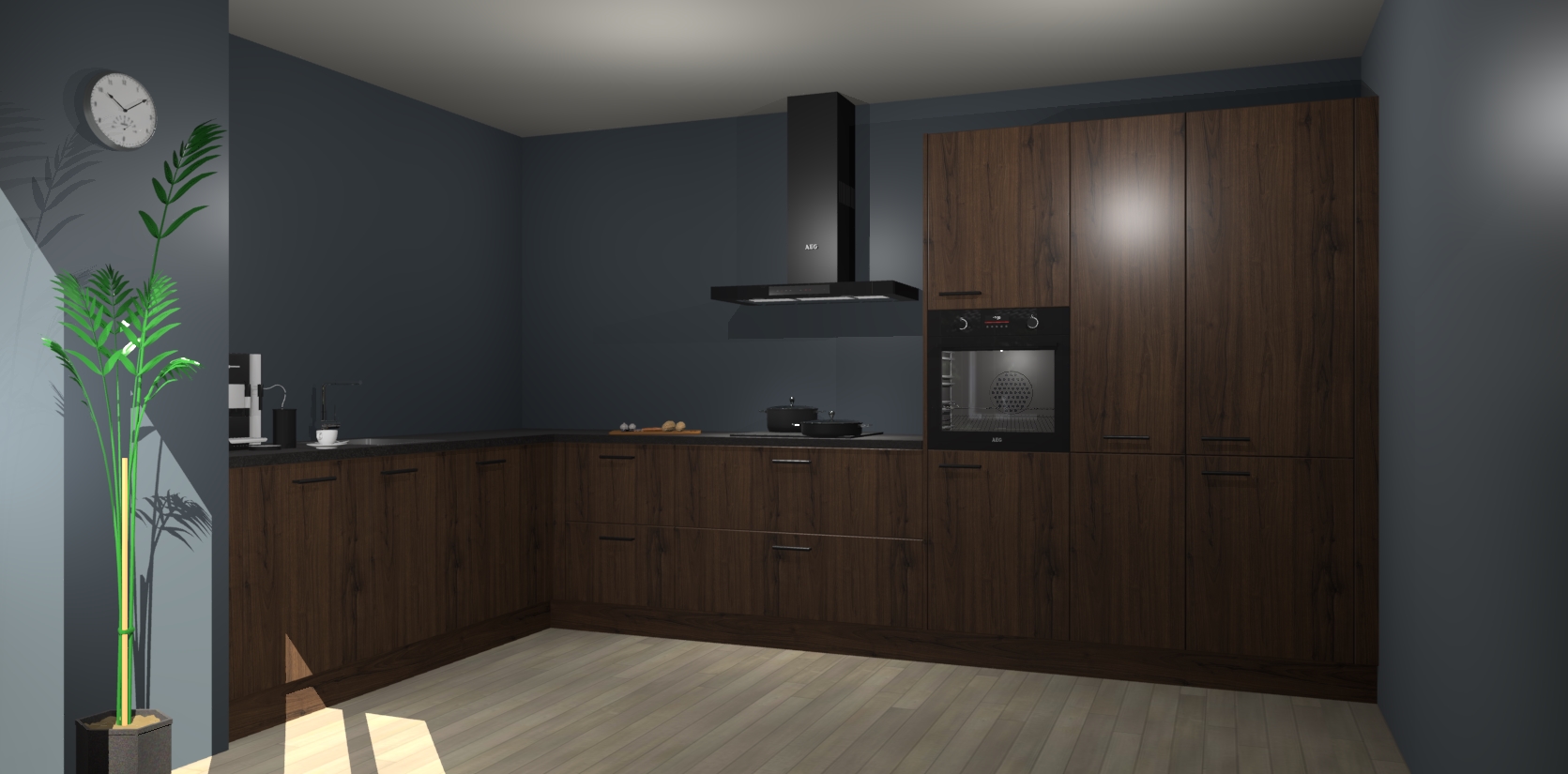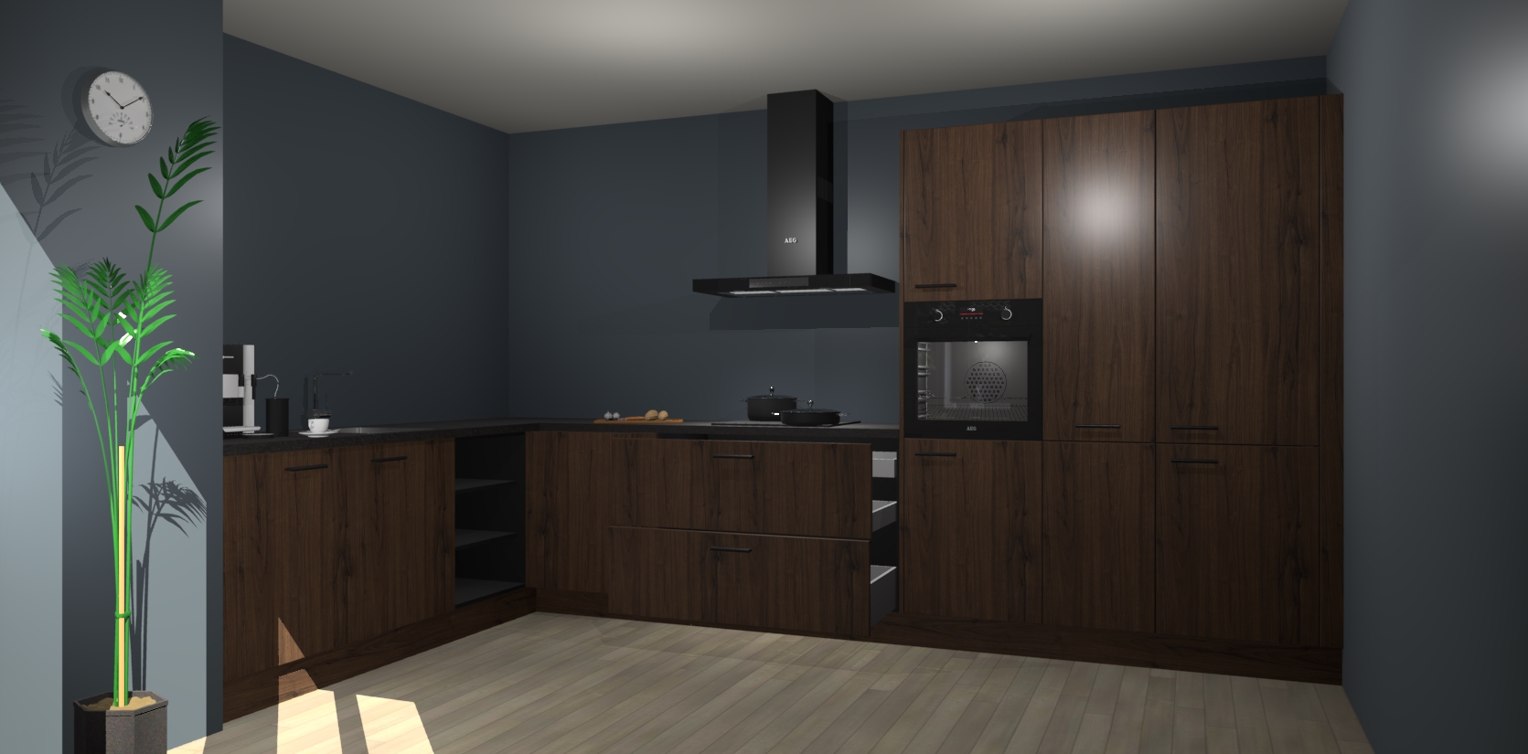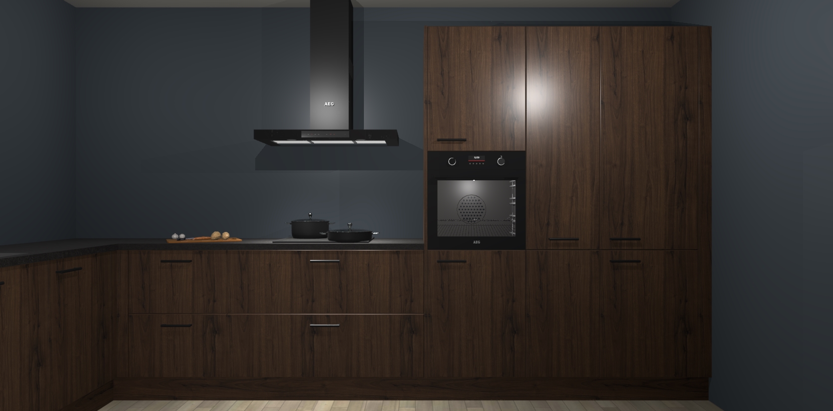 Welkom bij de noten keuken Nuuk. Deze prachtige keuken zal de komende jaren het middelpunt van de belangstelling in uw huis zijn. Uitgerust met vijf inbouwapparaten komt u nooit kookgereedschap tekort.