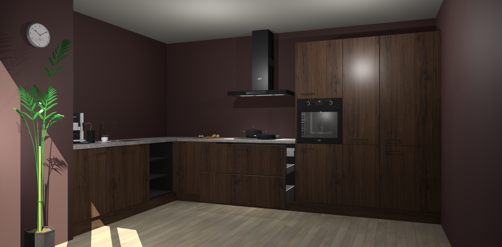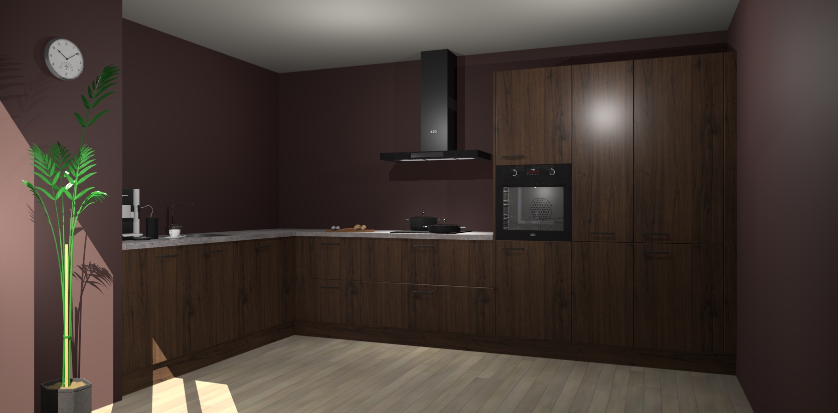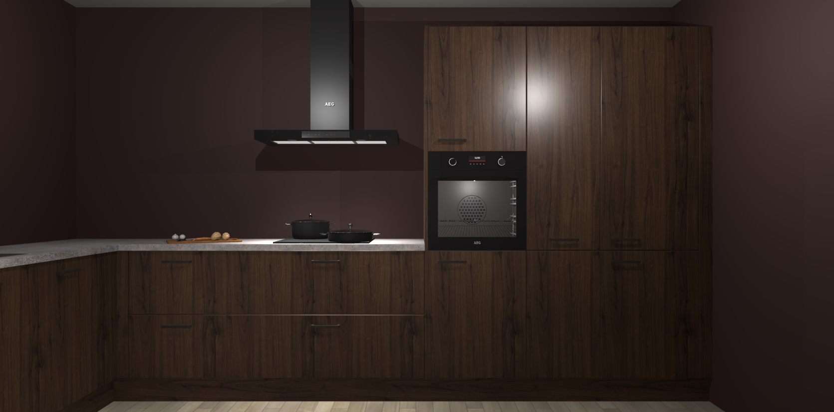 Welkom bij de noten keuken Nuuk. Deze prachtige keuken zal de komende jaren het middelpunt van de belangstelling in uw huis zijn. Uitgerust met vijf inbouwapparaten komt u nooit kookgereedschap tekort.