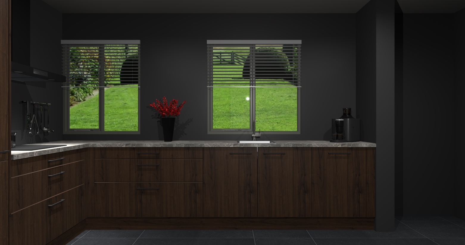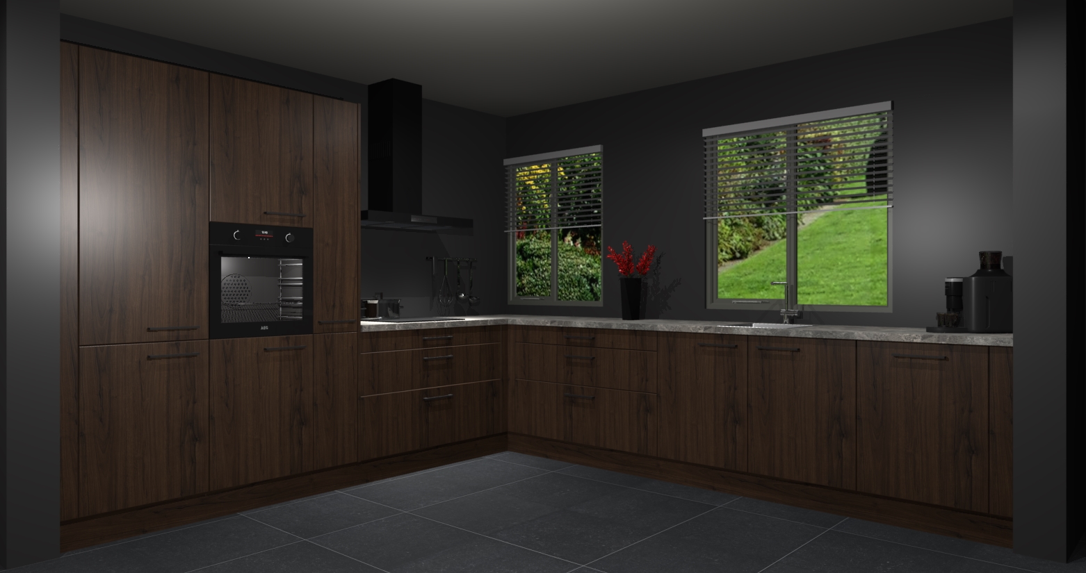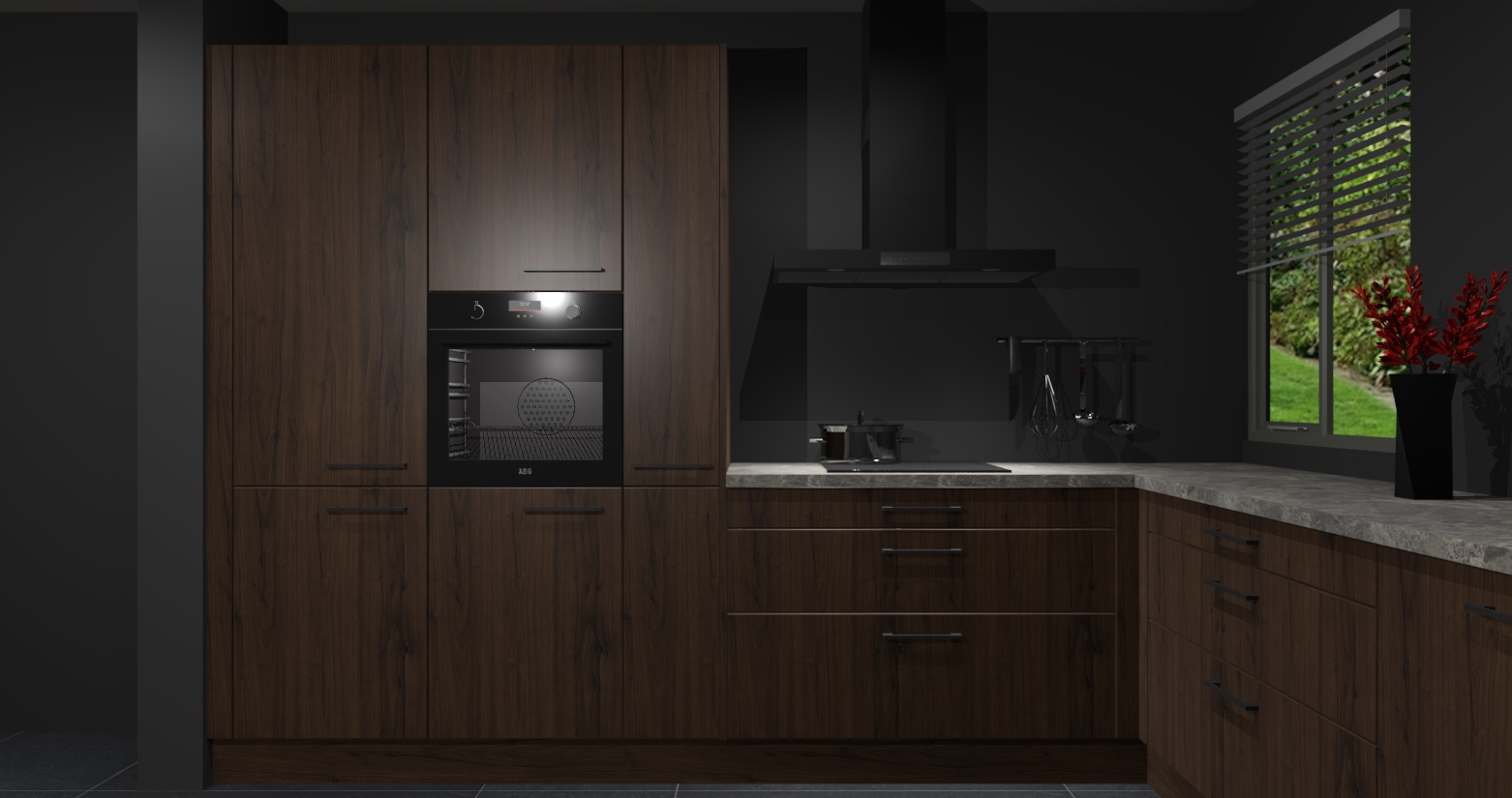Welkom bij de Noten keuken Palermo. Deze prachtige keuken zal de komende jaren het middelpunt van de belangstelling in uw huis zijn. Uitgerust met vijf inbouwapparaten komt u nooit kookgereedschap tekort. Bovendien geeft de warme houtlook elke ruimte een uitnodigende en tijdloze uitstraling.