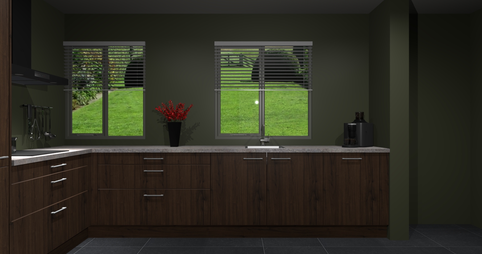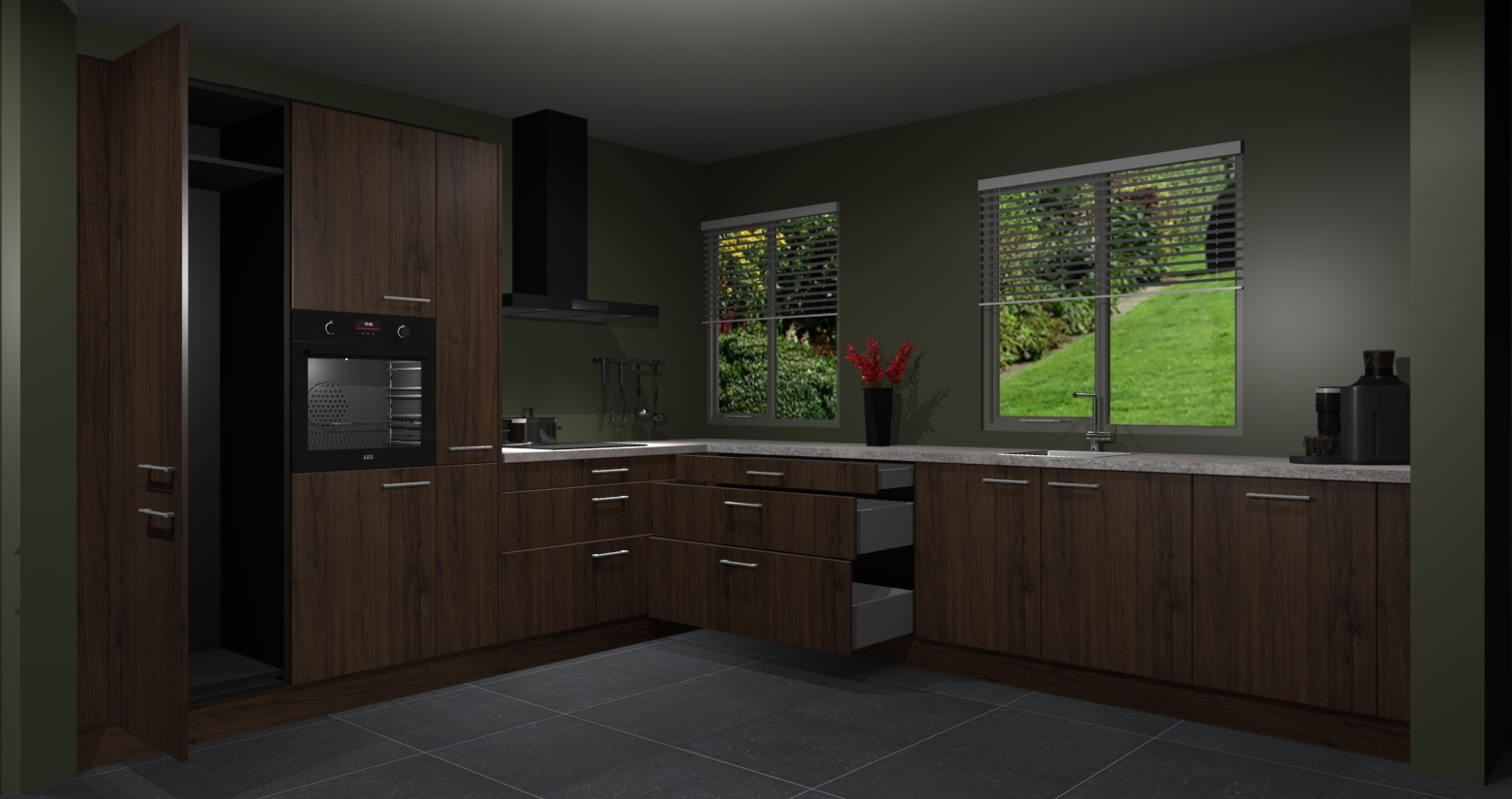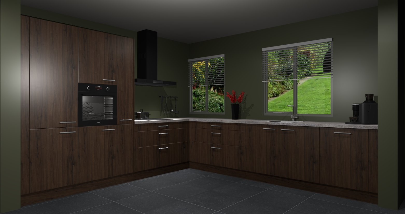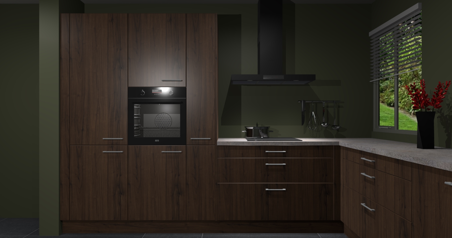 Welkom bij de Noten keuken Palermo. Deze prachtige keuken zal de komende jaren het middelpunt van de belangstelling in uw huis zijn. Uitgerust met vijf inbouwapparaten komt u nooit kookgereedschap tekort. Bovendien geeft de warme houtlook elke ruimte een uitnodigende en tijdloze uitstraling.