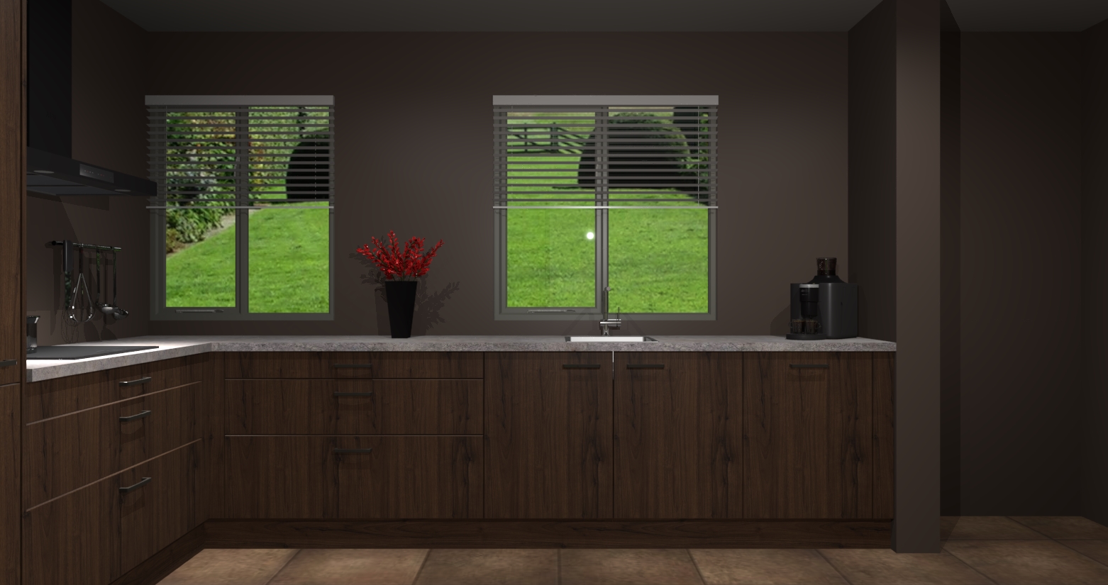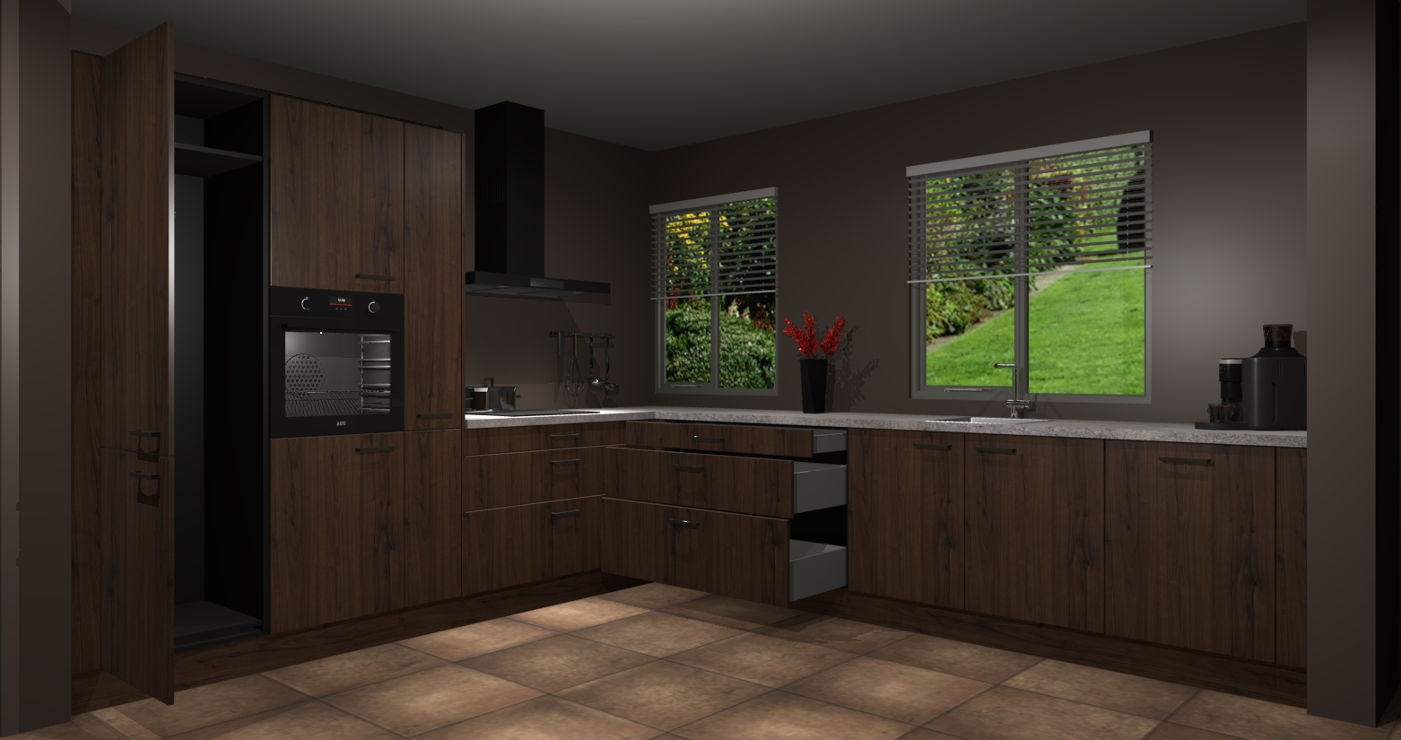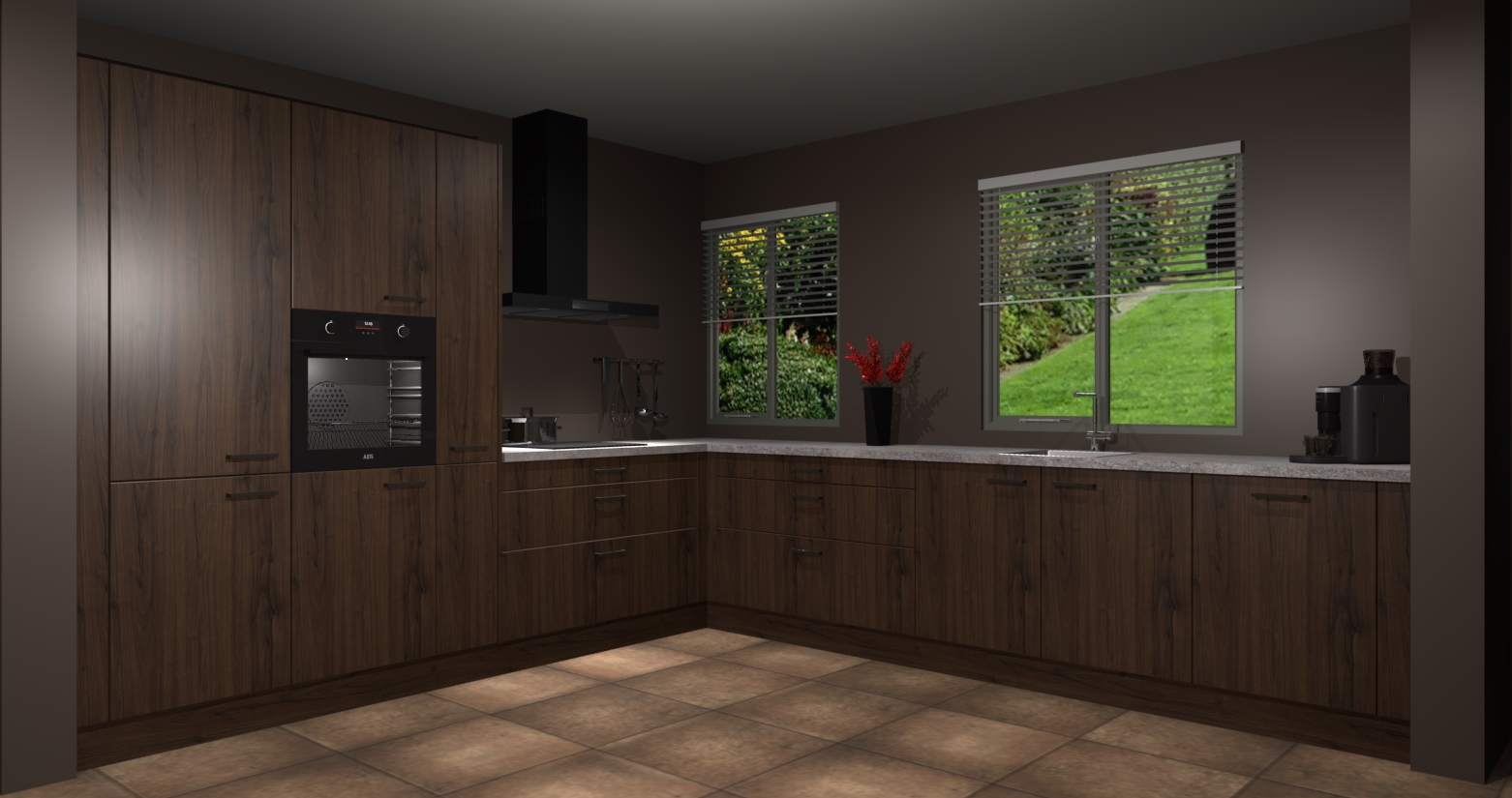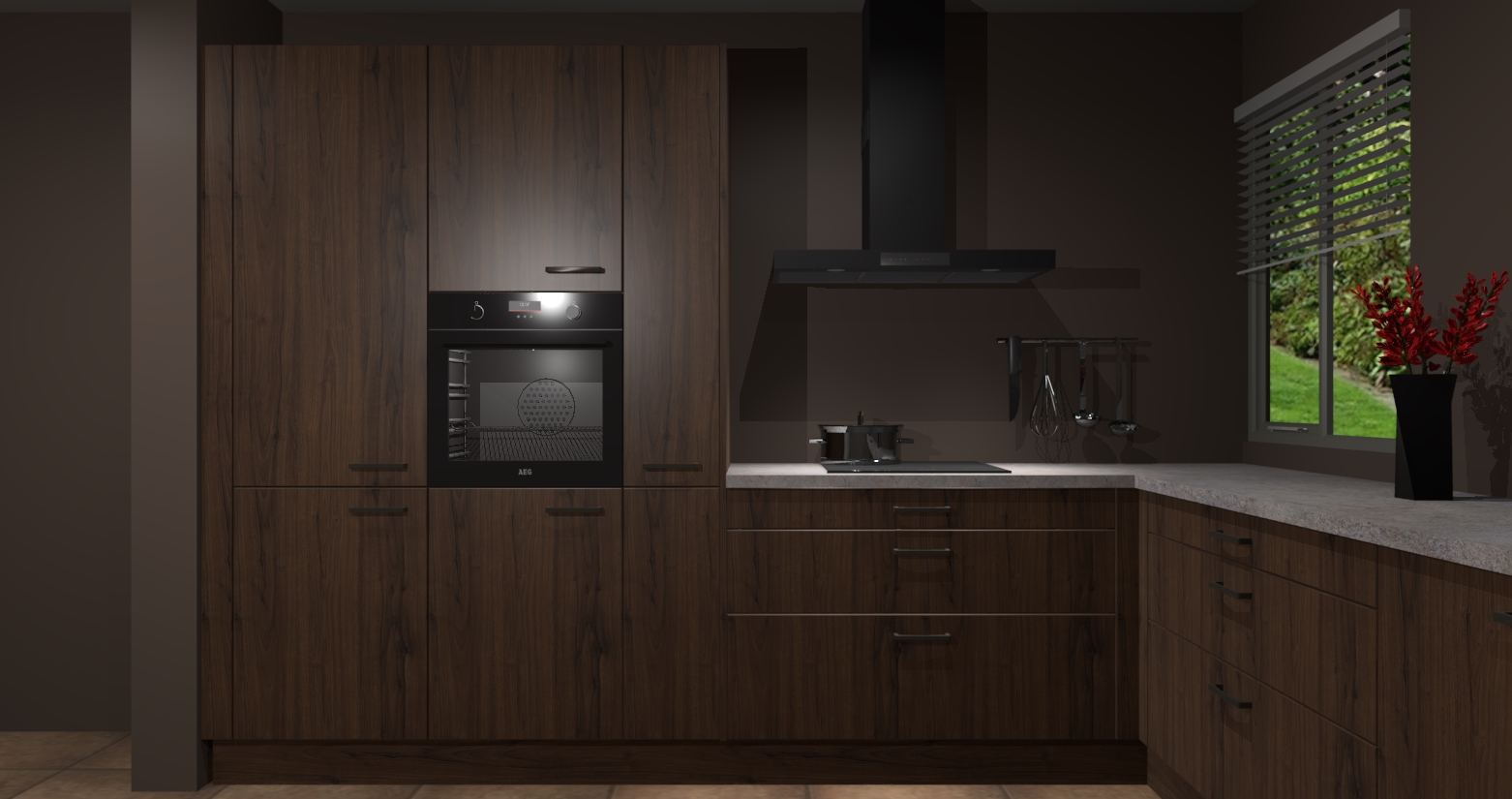 Welkom bij de Noten keuken Palermo. Deze prachtige keuken zal de komende jaren het middelpunt van de belangstelling in uw huis zijn. Uitgerust met vijf inbouwapparaten komt u nooit kookgereedschap tekort. Bovendien geeft de warme houtlook elke ruimte een uitnodigende en tijdloze uitstraling.