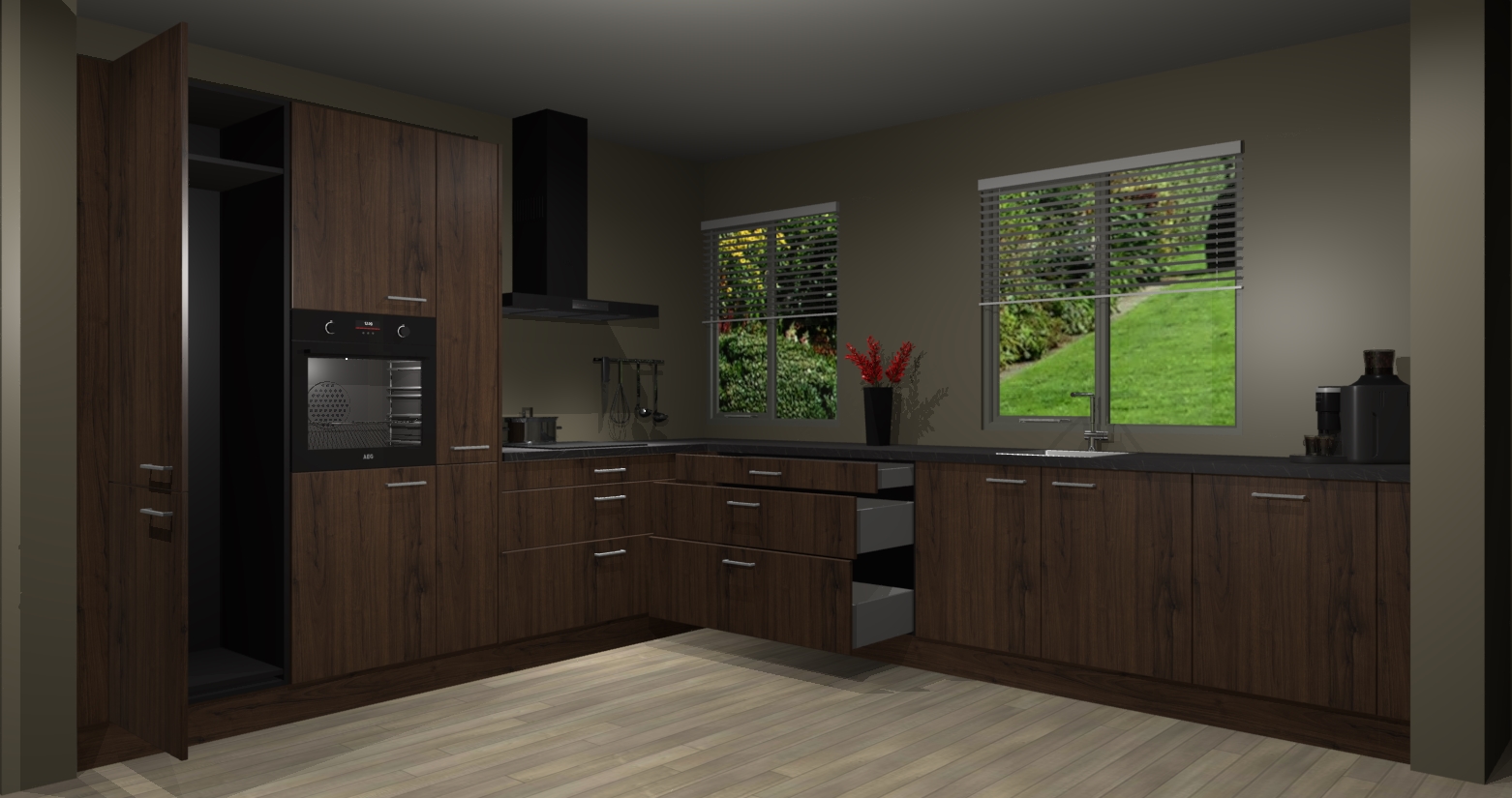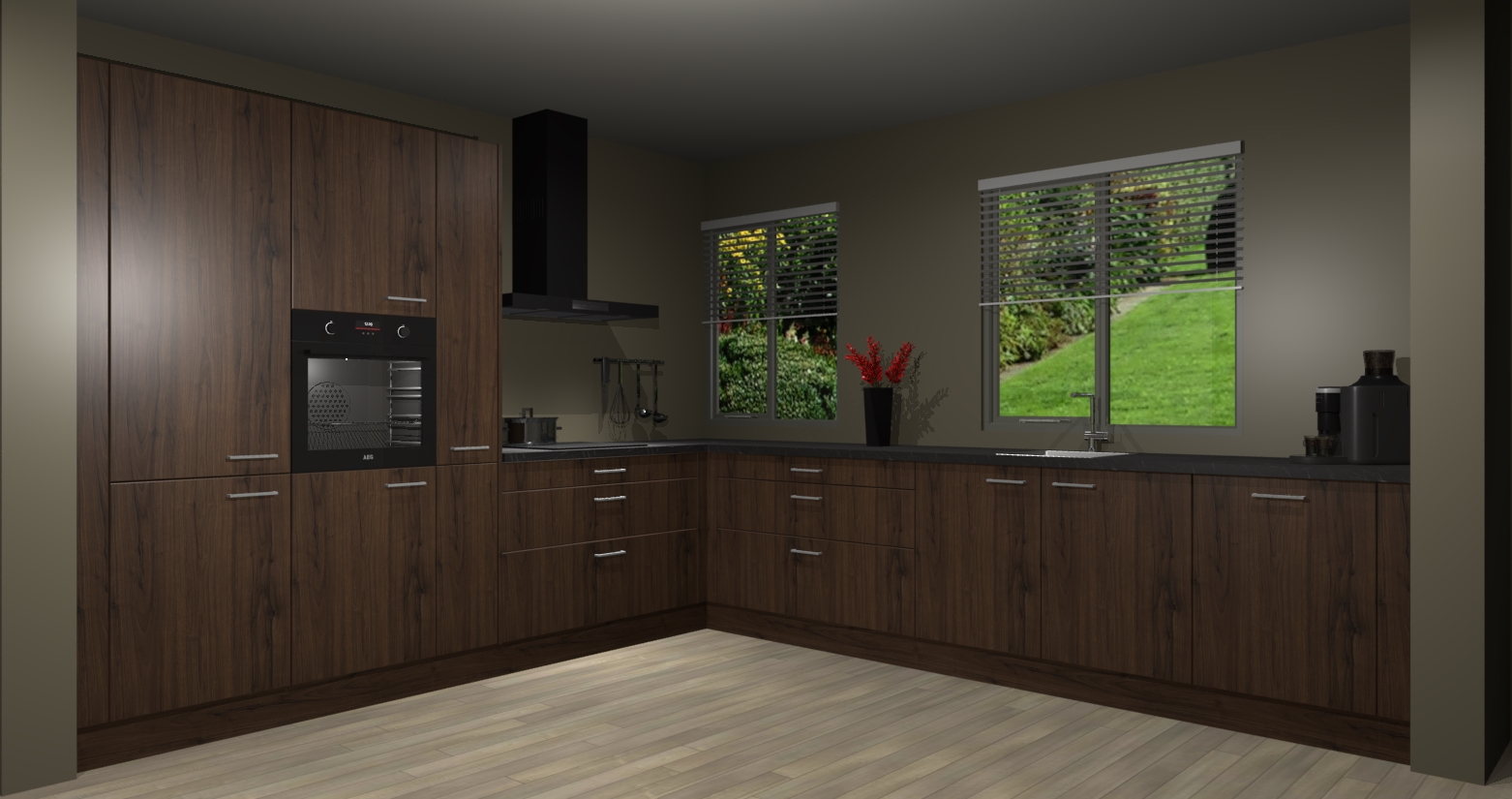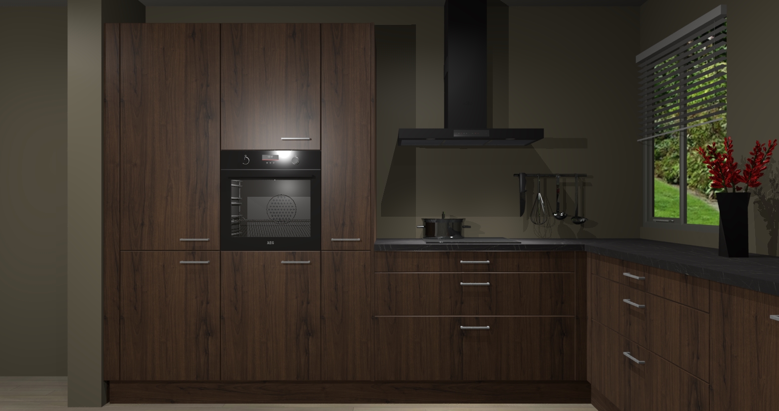 Welkom bij de Noten keuken Palermo. Deze prachtige keuken zal de komende jaren het middelpunt van de belangstelling in uw huis zijn. Uitgerust met vijf inbouwapparaten komt u nooit kookgereedschap tekort. Bovendien geeft de warme houtlook elke ruimte een uitnodigende en tijdloze uitstraling.
