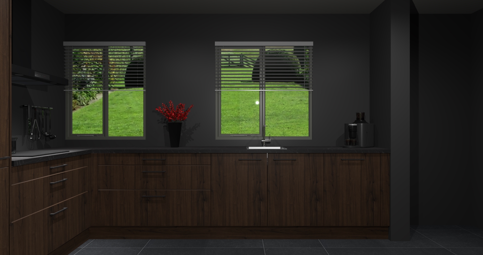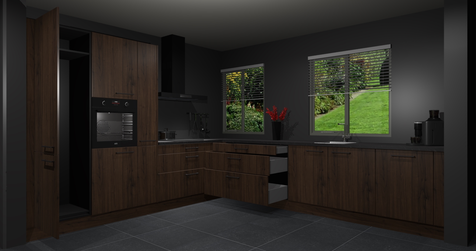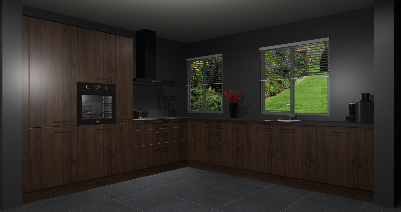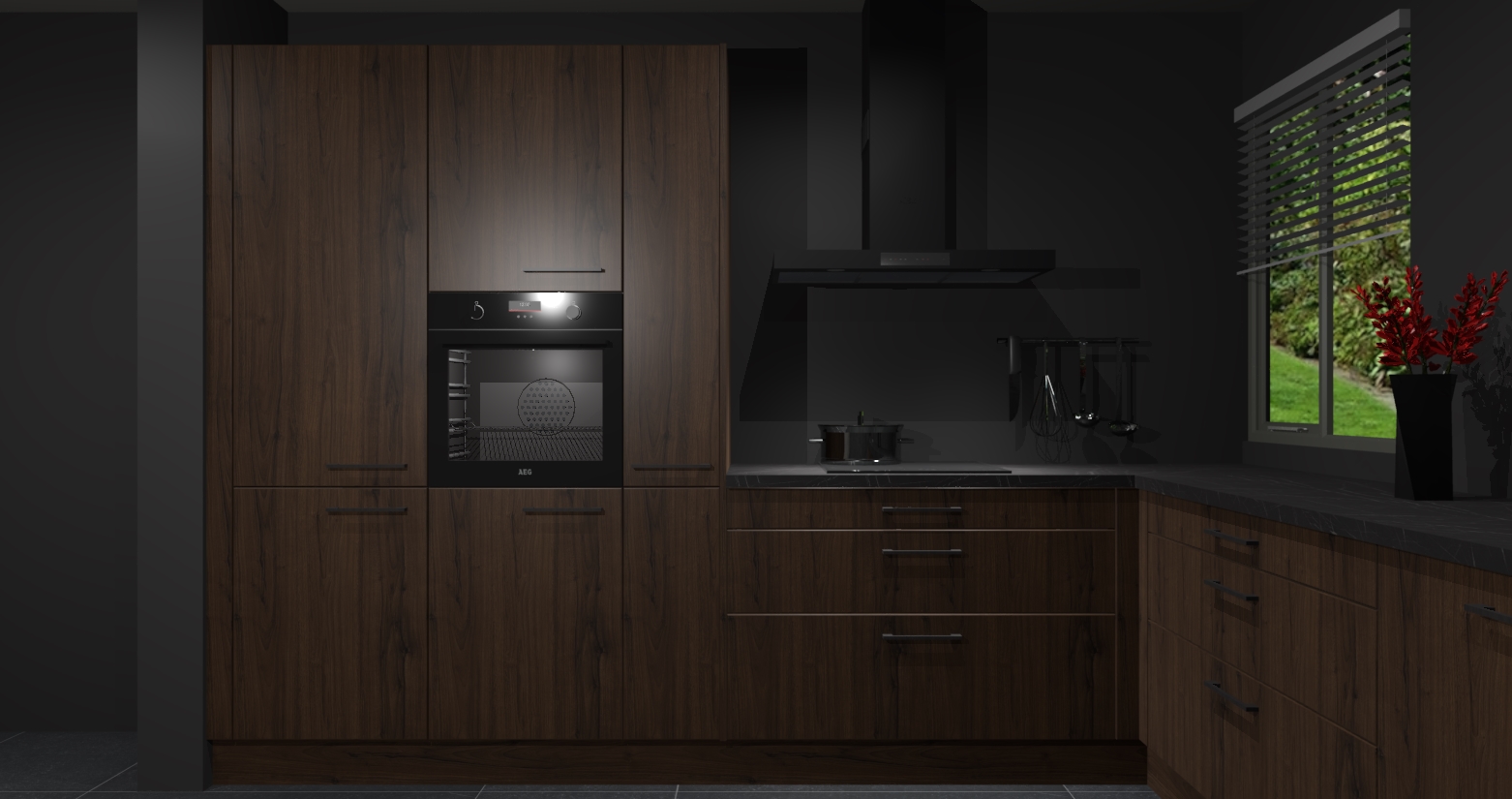 Welkom bij de Noten keuken Palermo. Deze prachtige keuken zal de komende jaren het middelpunt van de belangstelling in uw huis zijn. Uitgerust met vijf inbouwapparaten komt u nooit kookgereedschap tekort. Bovendien geeft de warme houtlook elke ruimte een uitnodigende en tijdloze uitstraling.