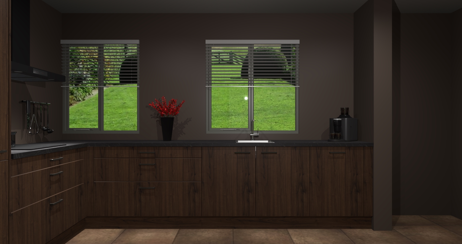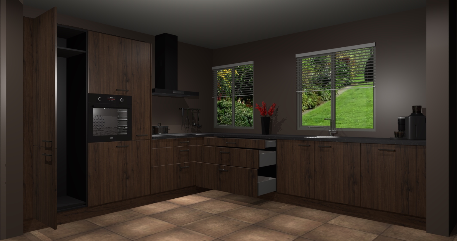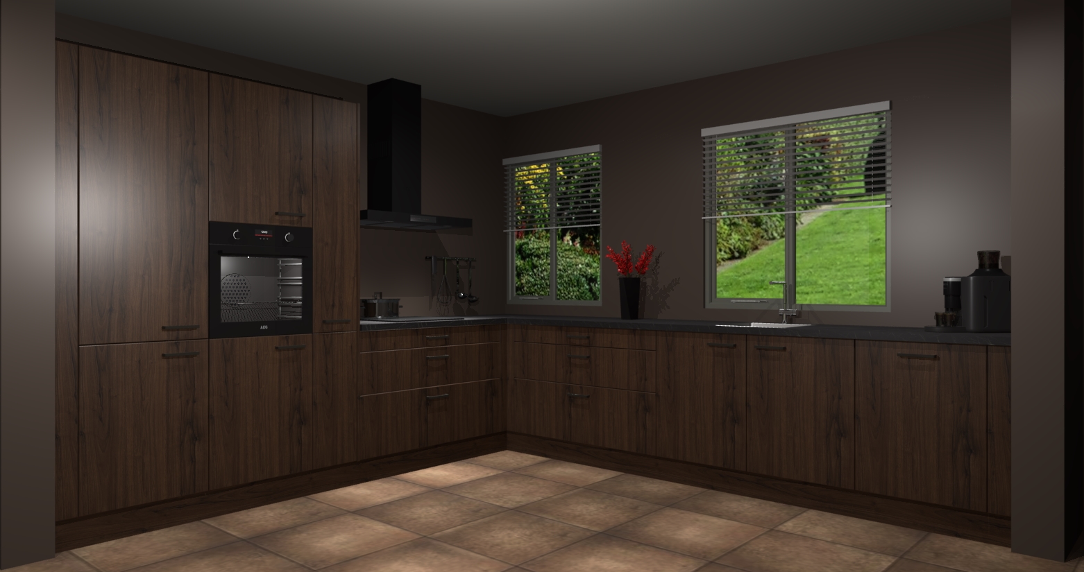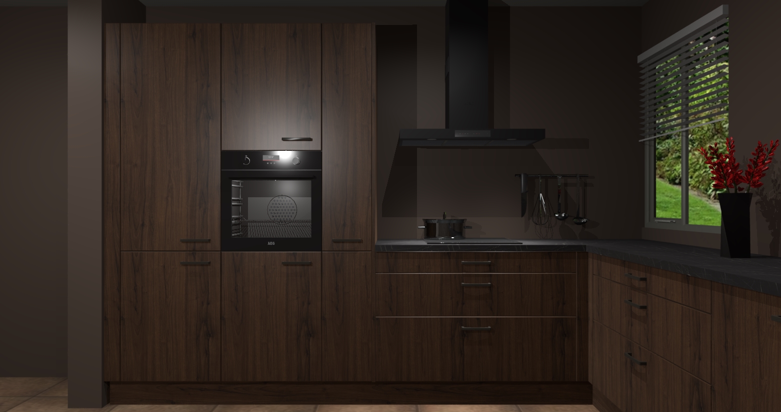 Welkom bij de Noten keuken Palermo. Deze prachtige keuken zal de komende jaren het middelpunt van de belangstelling in uw huis zijn. Uitgerust met vijf inbouwapparaten komt u nooit kookgereedschap tekort. Bovendien geeft de warme houtlook elke ruimte een uitnodigende en tijdloze uitstraling.