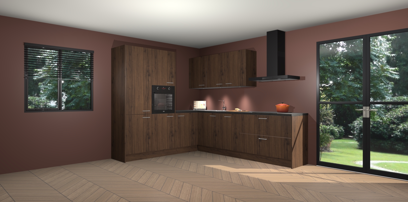 Maak kennis met de noten keuken Parla - de perfecte aanvulling voor uw moderne keuken! Ervaar tijdloos design, elegantie en een chique uitstraling met onze zwarte handgrepen, soft-close deuren en veel opbergruimte. Dit alles wordt aangeboden tegen een vaste lage prijs voor ongeëvenaarde Duitse keukenkwaliteit!
