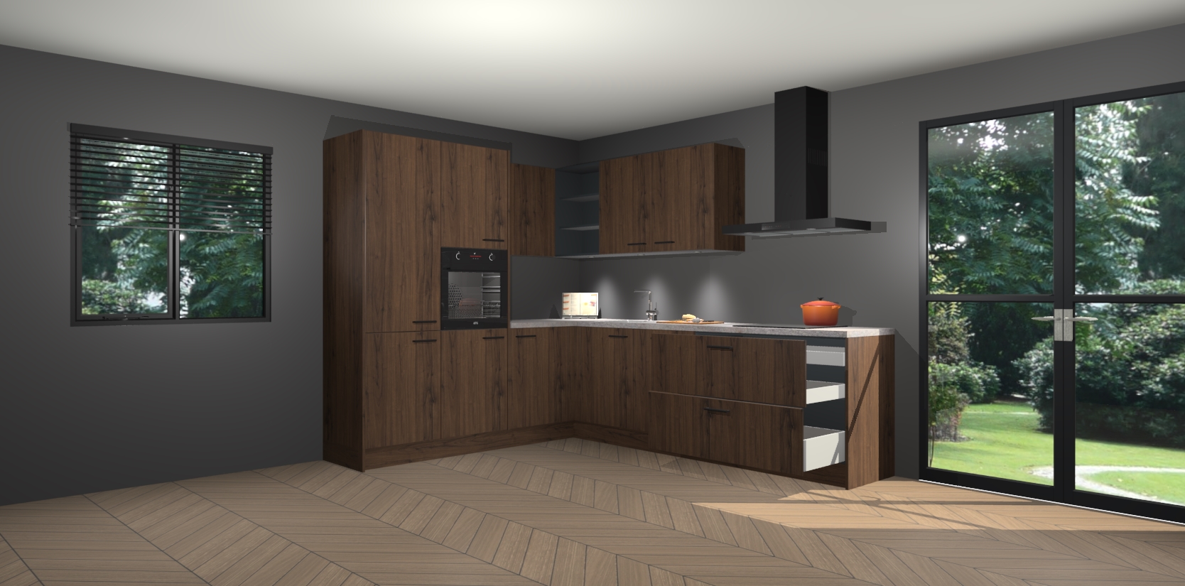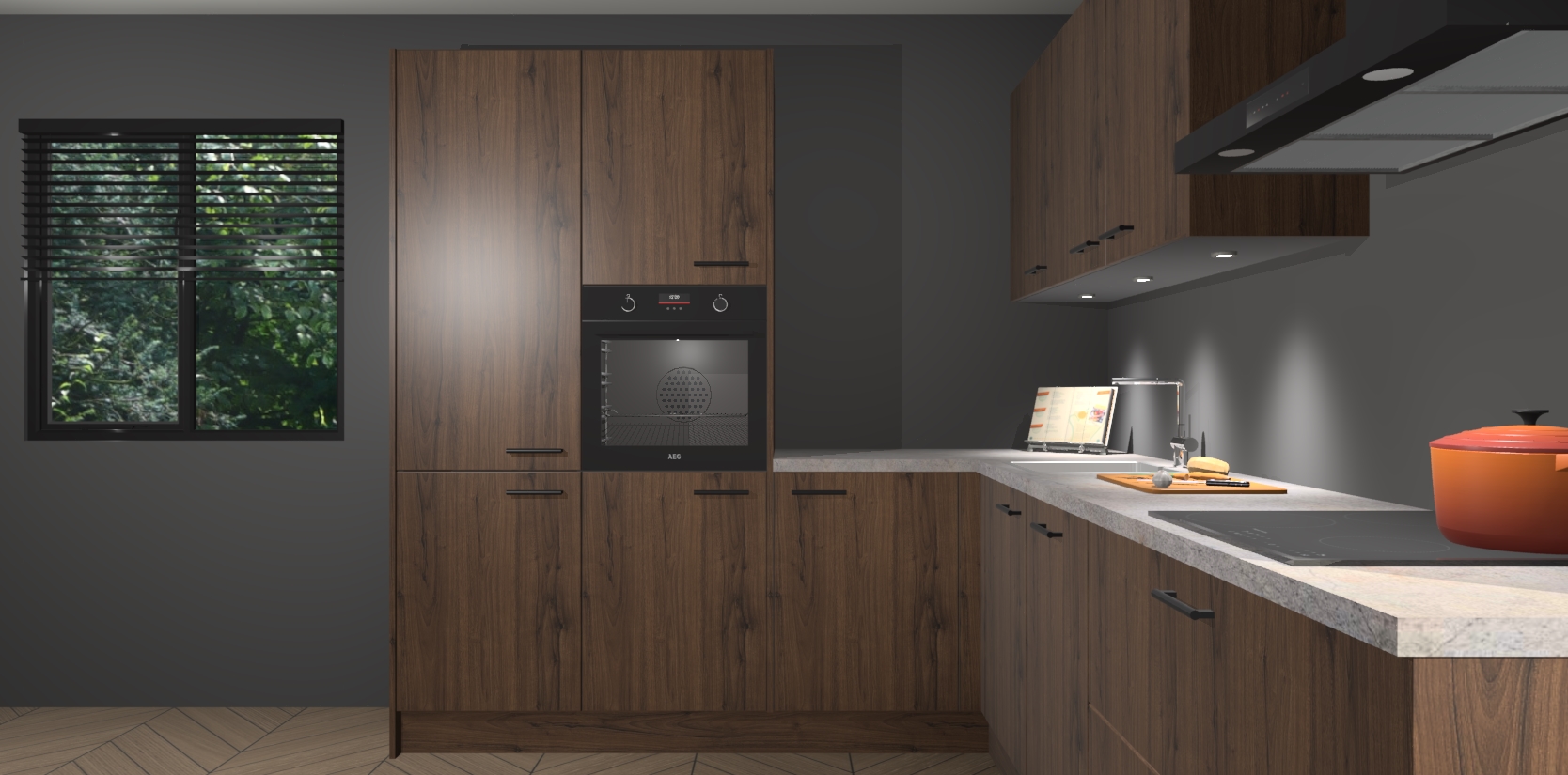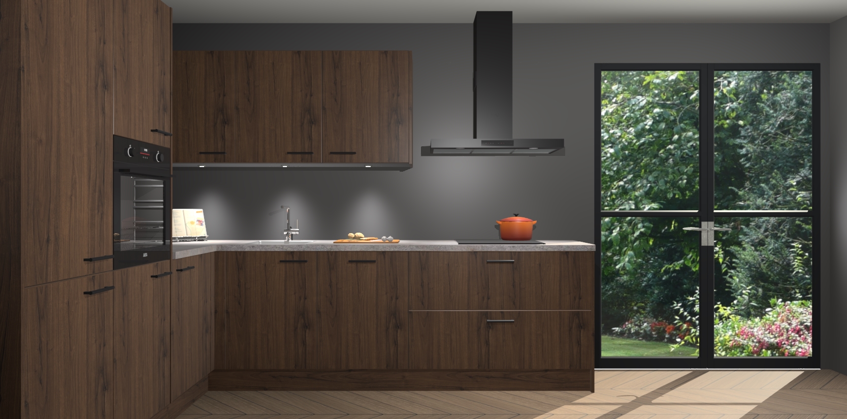 Maak kennis met de noten keuken Parla - de perfecte aanvulling voor uw moderne keuken! Ervaar tijdloos design, elegantie en een chique uitstraling met onze zwarte handgrepen, soft-close deuren en veel opbergruimte. Dit alles wordt aangeboden tegen een vaste lage prijs voor ongeëvenaarde Duitse keukenkwaliteit!