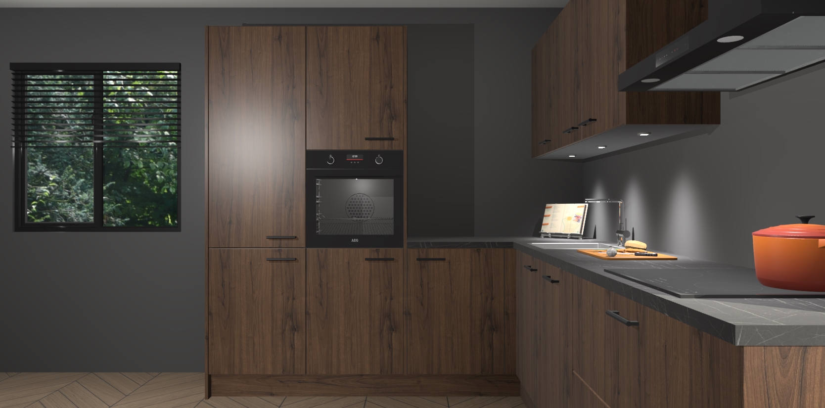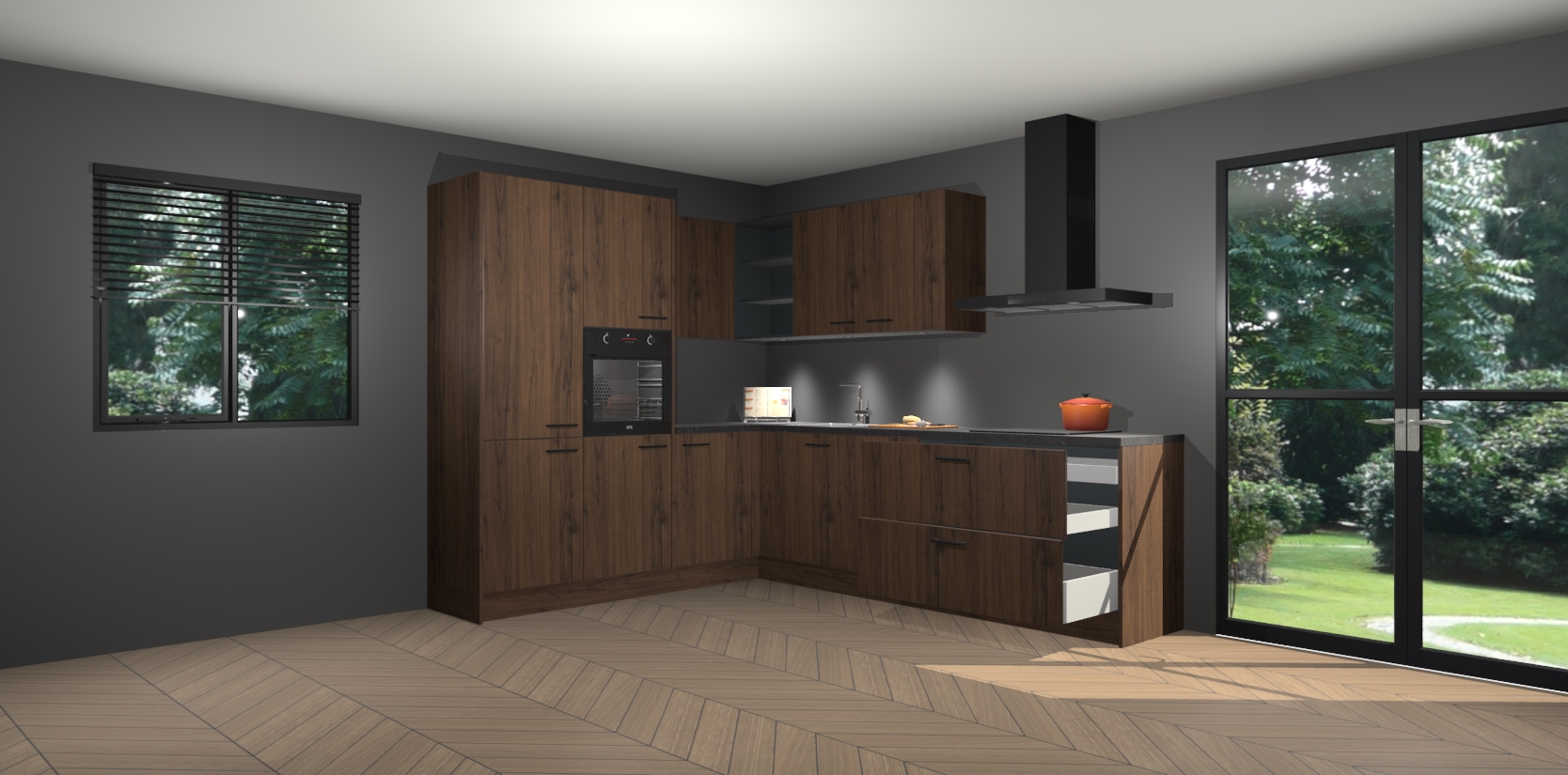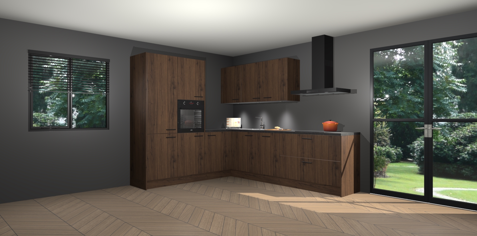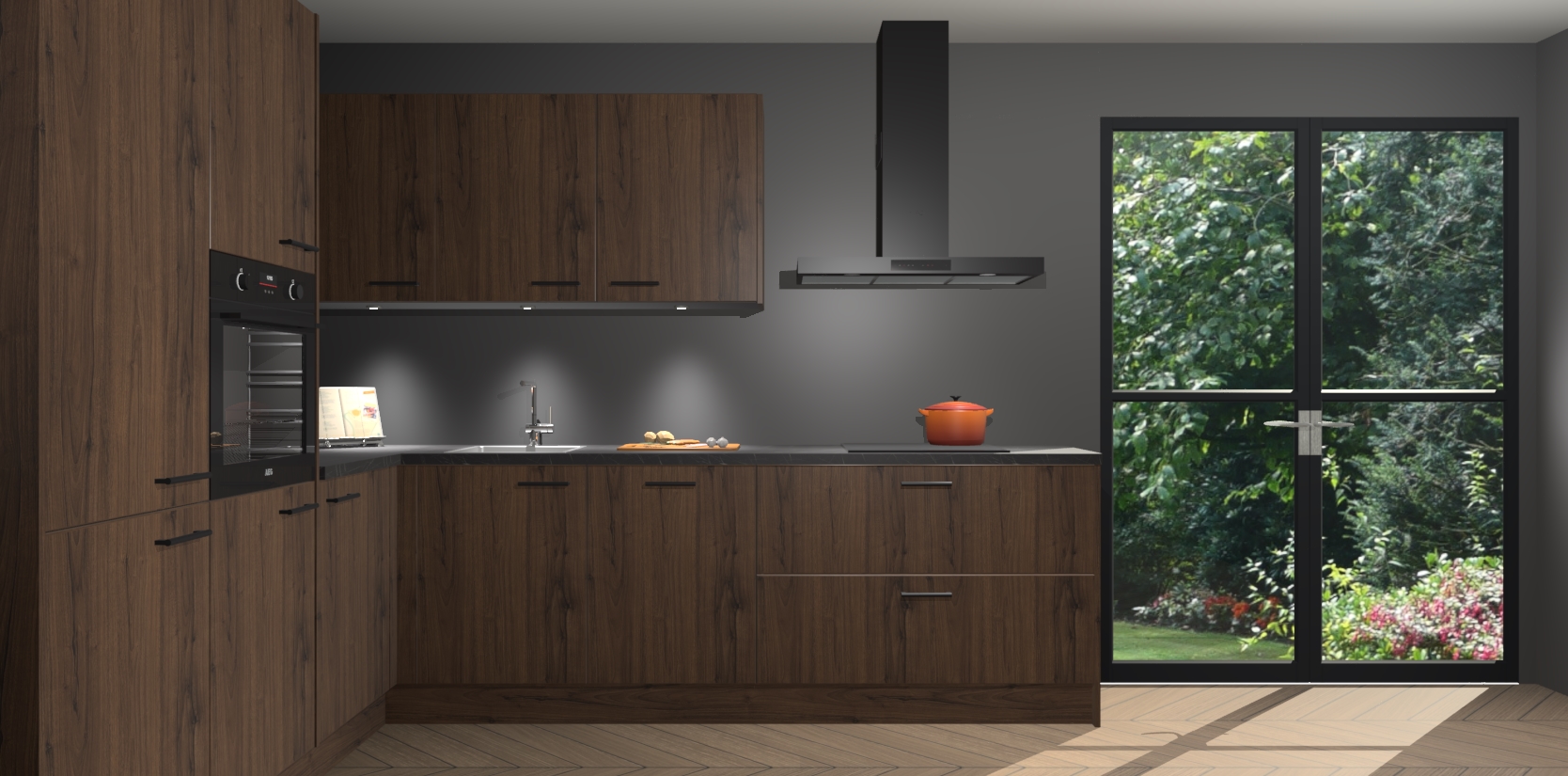 Maak kennis met de noten keuken Parla - de perfecte aanvulling voor uw moderne keuken! Ervaar tijdloos design, elegantie en een chique uitstraling met onze zwarte handgrepen, soft-close deuren en veel opbergruimte. Dit alles wordt aangeboden tegen een vaste lage prijs voor ongeëvenaarde Duitse keukenkwaliteit!