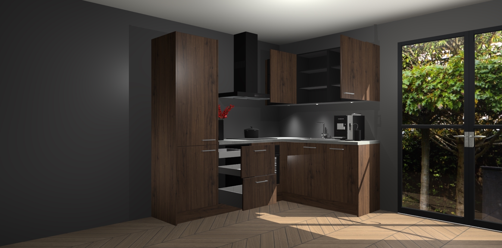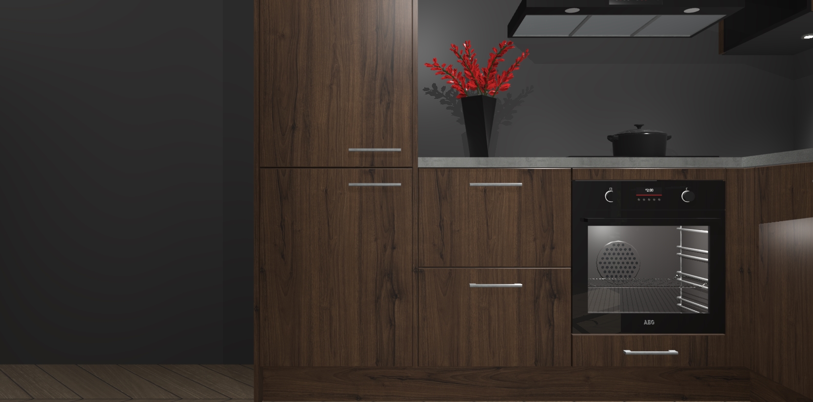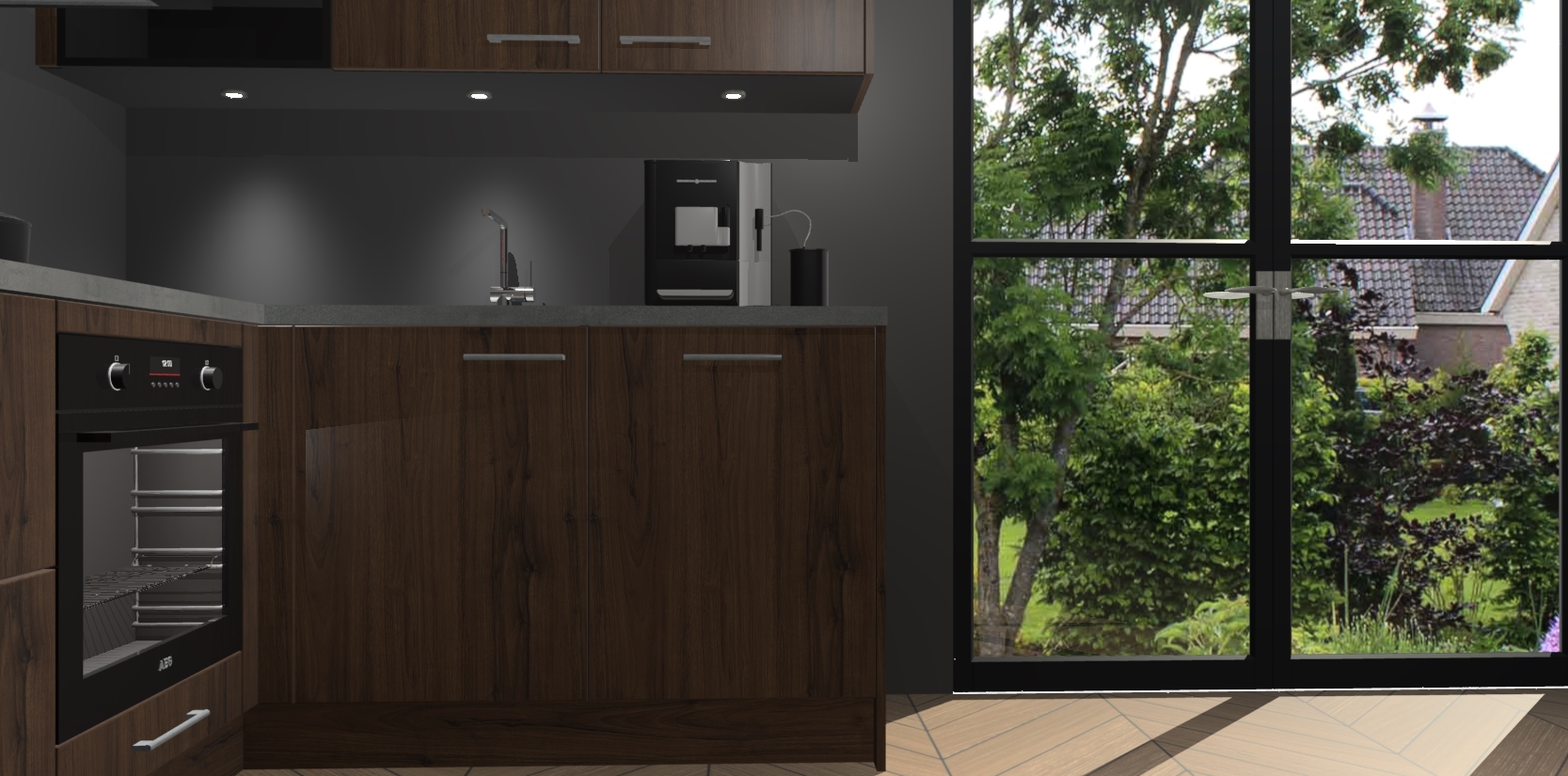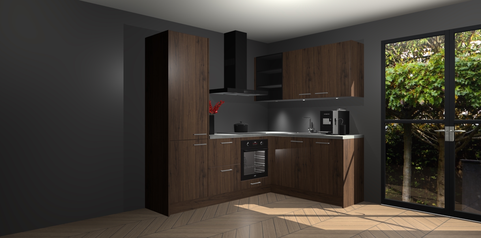 Wauw, dit is de Noten keuken Pilsen! U kunt gerust zeggen dat u elegantie combineert met functionaliteit met deze keuken. Met een modern en chique ontwerp is de keuken precies wat u nodig heeft om uw ruimte te verfraaien. De binnenzijde van de kasten is in dezelfde donkere kleur als de buitenzijde voor een uniforme look, compleet met softclose-kasten die stil sluiten.