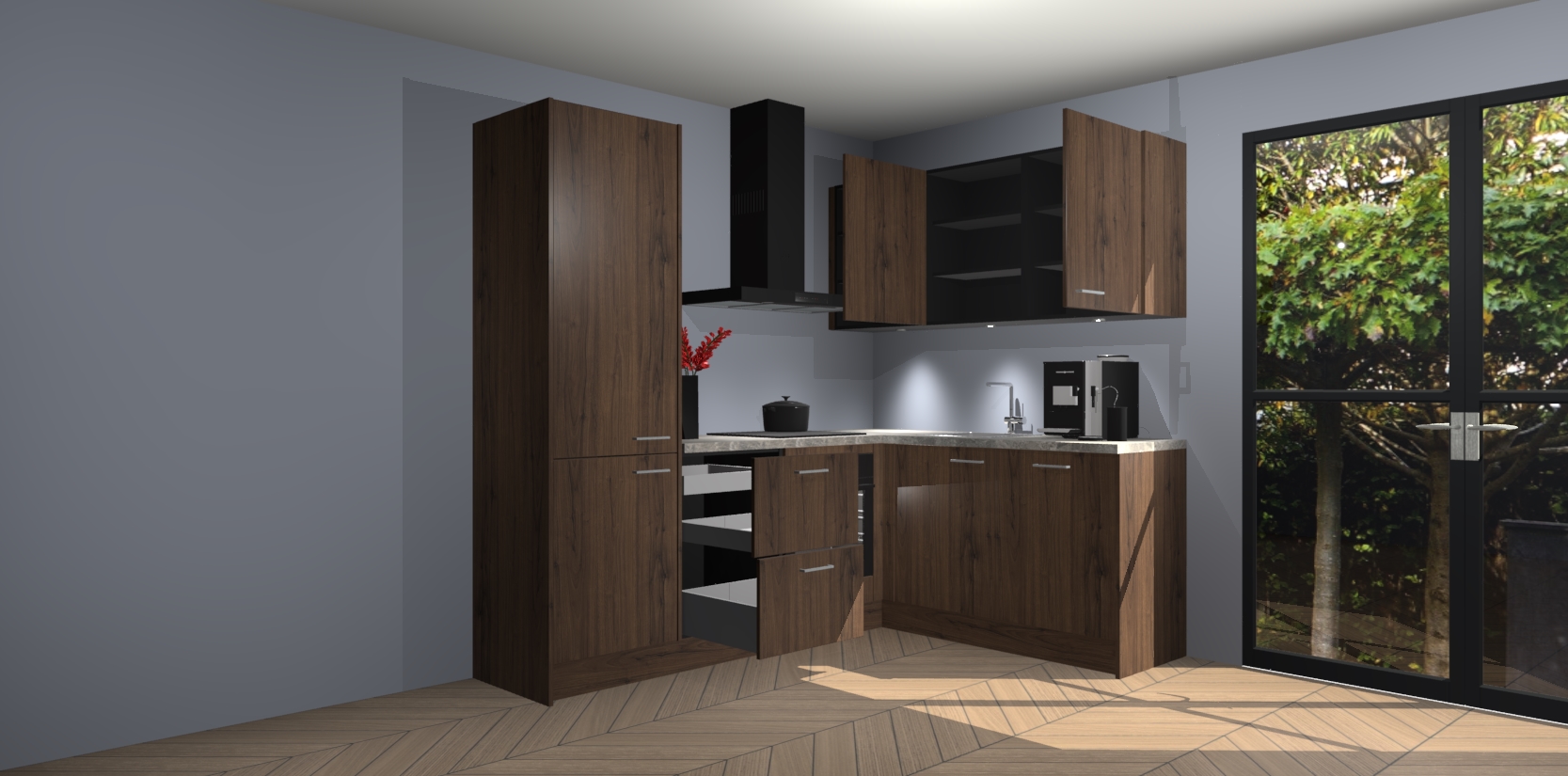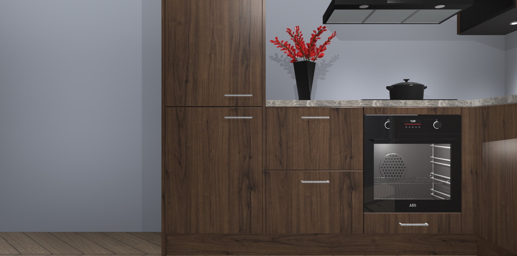 Wauw, dit is de Noten keuken Pilsen! U kunt gerust zeggen dat u elegantie combineert met functionaliteit met deze keuken. Met een modern en chique ontwerp is de keuken precies wat u nodig heeft om uw ruimte te verfraaien. De binnenzijde van de kasten is in dezelfde donkere kleur als de buitenzijde voor een uniforme look, compleet met softclose-kasten die stil sluiten.
