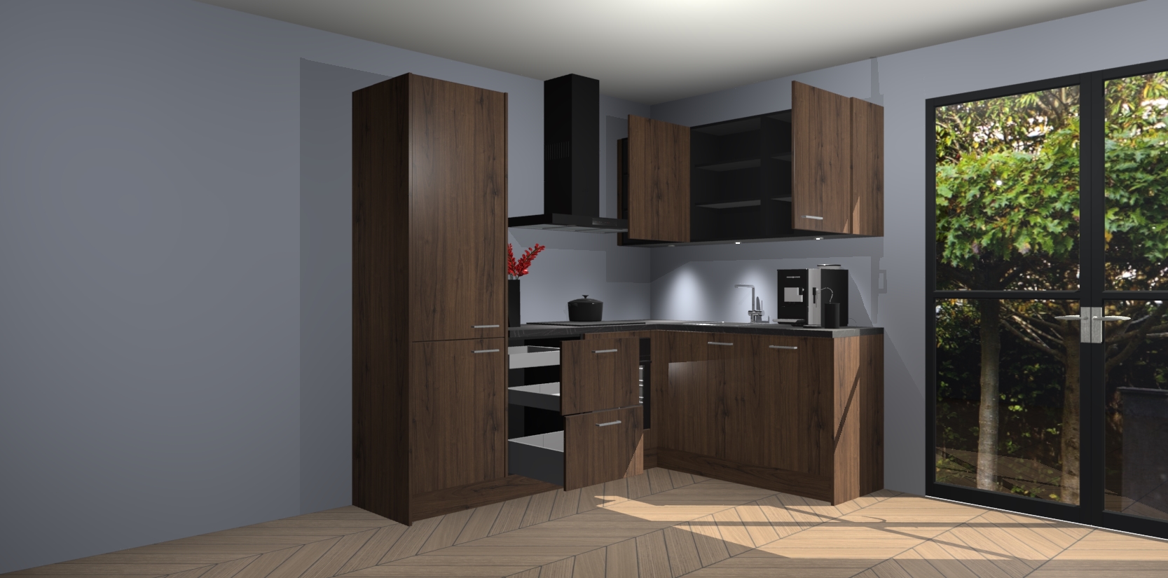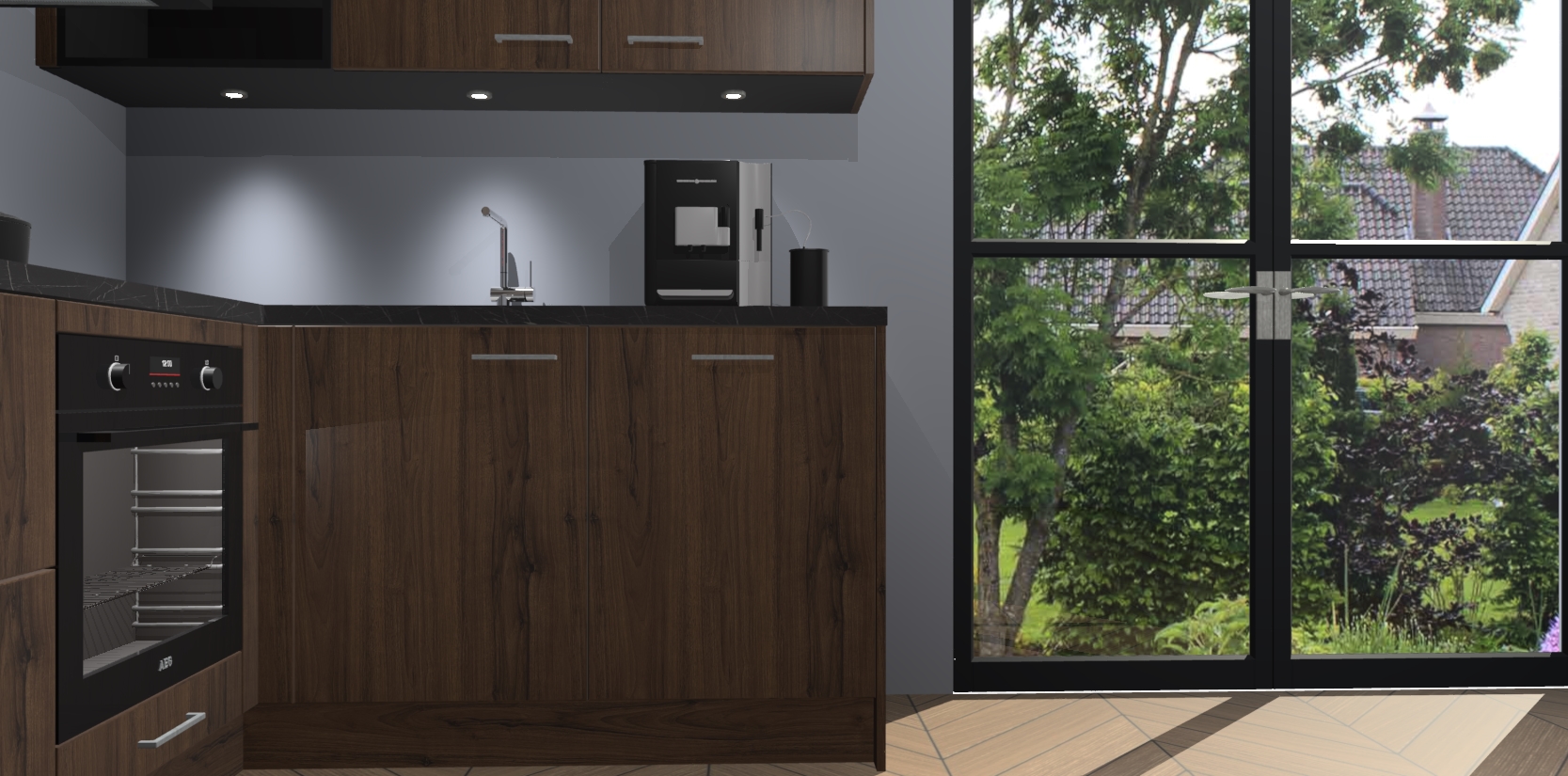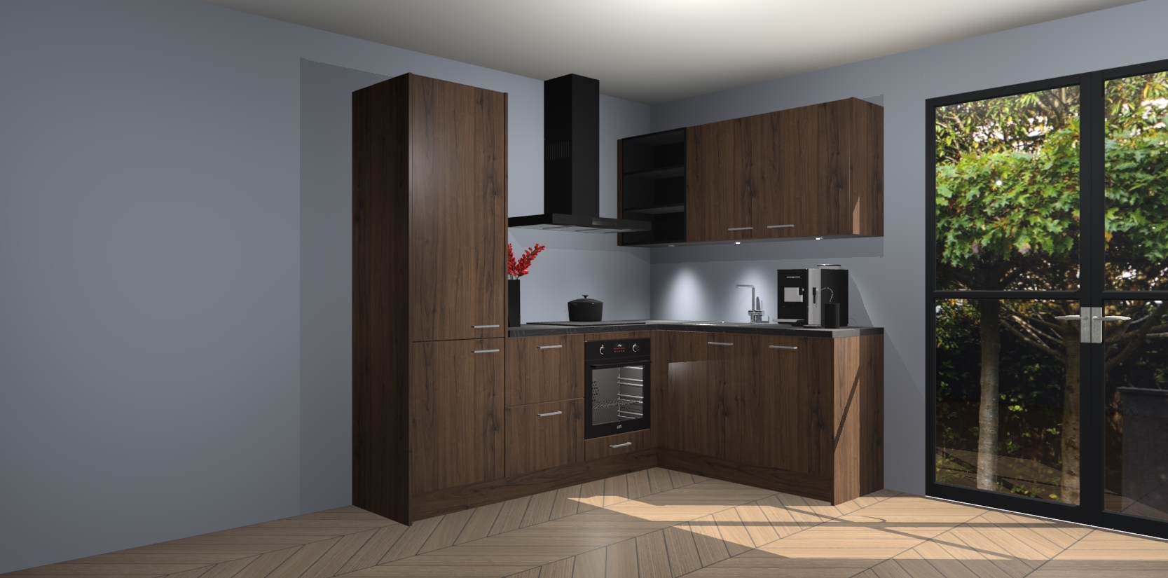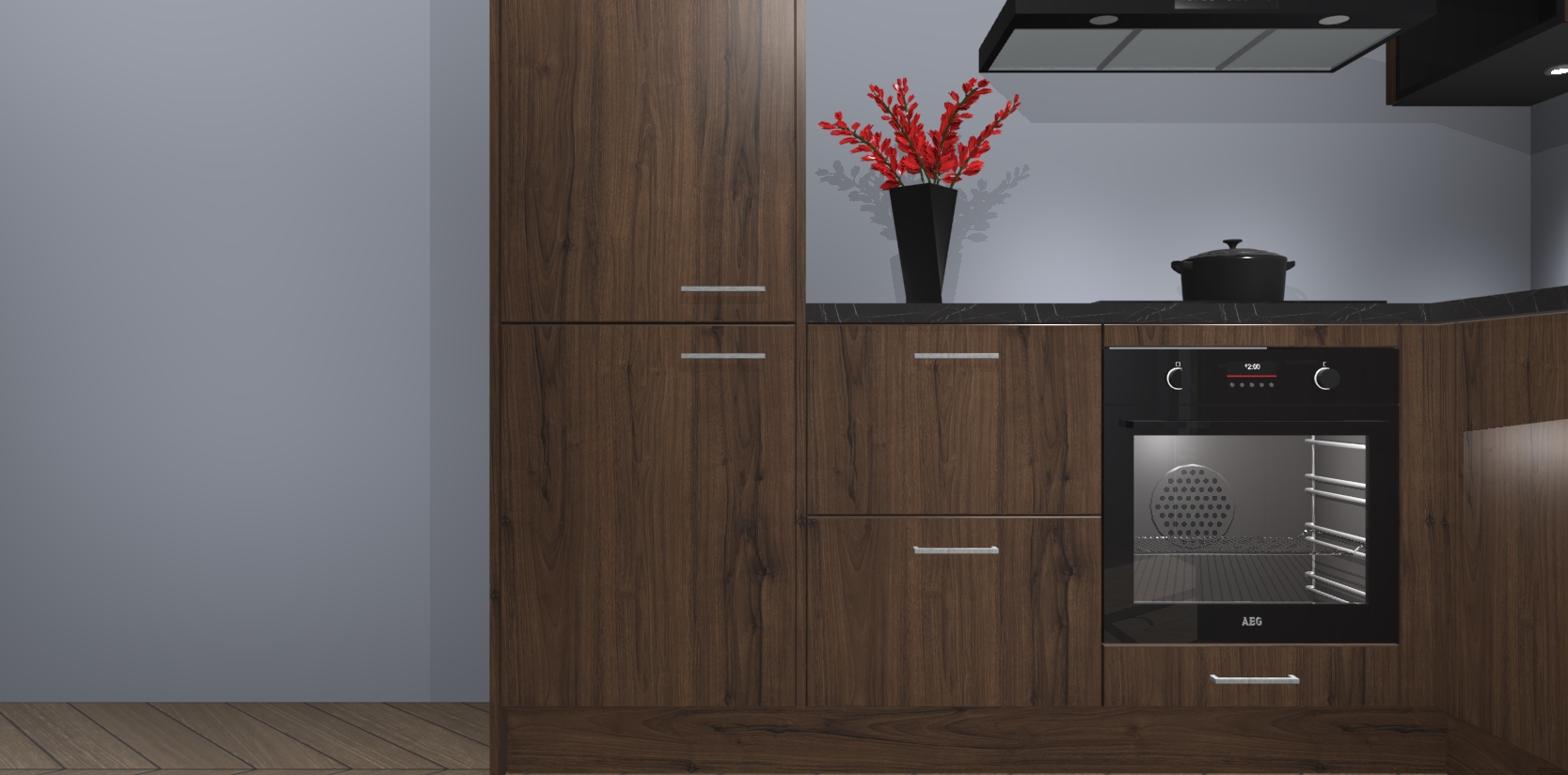 Wauw, dit is de Noten keuken Pilsen! U kunt gerust zeggen dat u elegantie combineert met functionaliteit met deze keuken. Met een modern en chique ontwerp is de keuken precies wat u nodig heeft om uw ruimte te verfraaien. De binnenzijde van de kasten is in dezelfde donkere kleur als de buitenzijde voor een uniforme look, compleet met softclose-kasten die stil sluiten.
