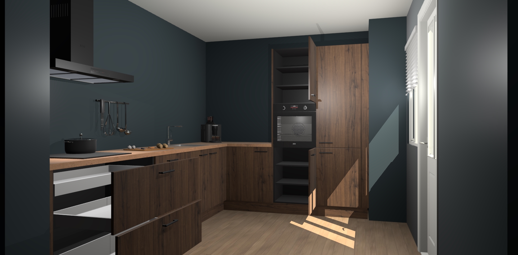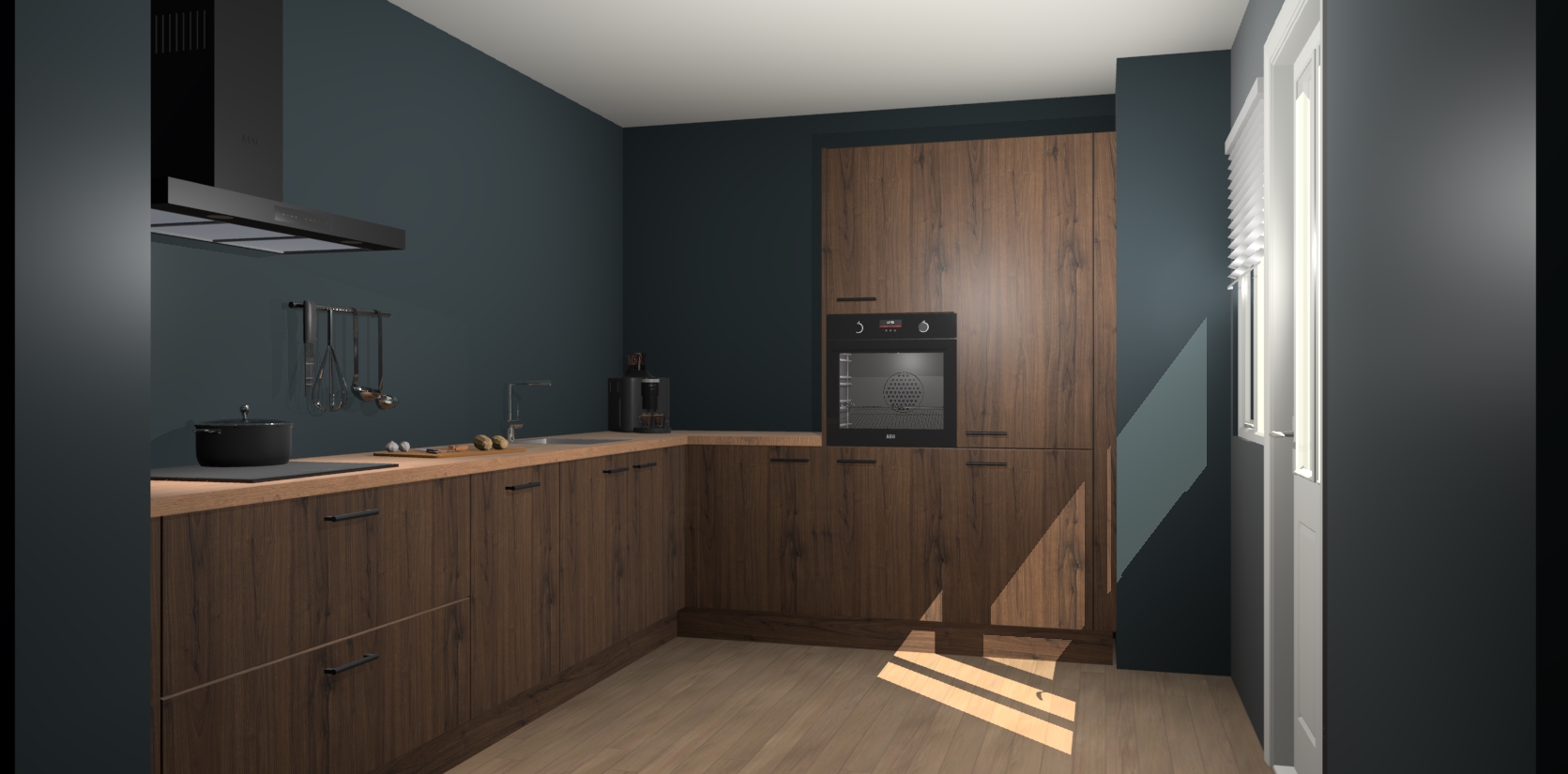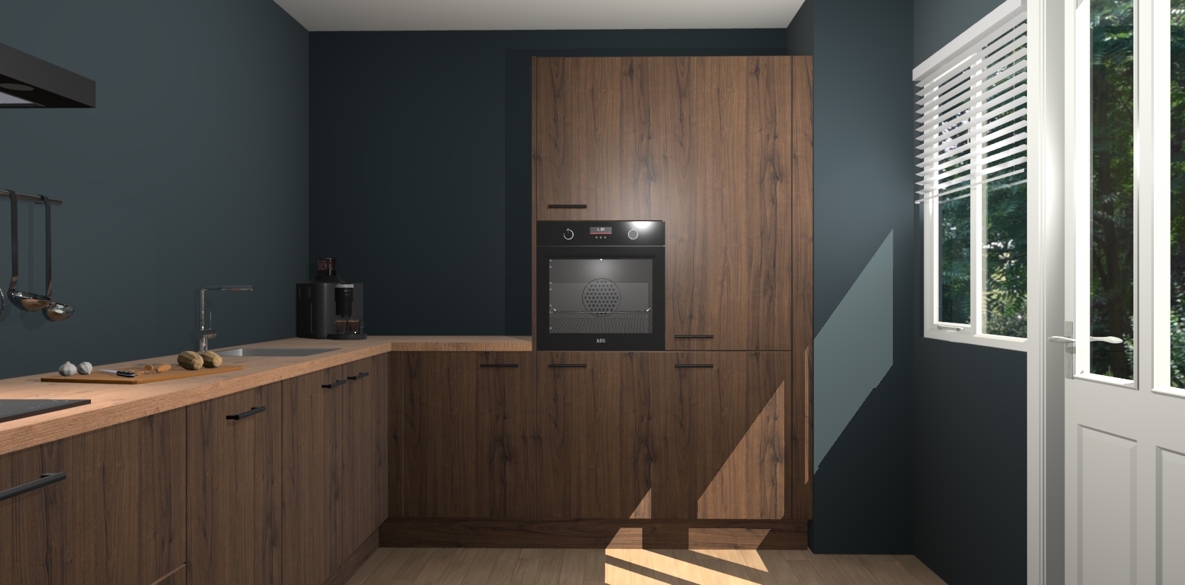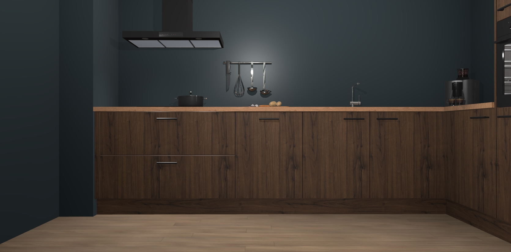Welkom bij de Noten keuken Portland. Deze prachtige keuken zal de komende jaren het middelpunt van de belangstelling in uw huis zijn. Uitgerust met vijf inbouwapparaten komt u nooit kookgereedschap tekort. Bovendien geeft de warme houtlook elke ruimte een uitnodigende en tijdloze uitstraling.