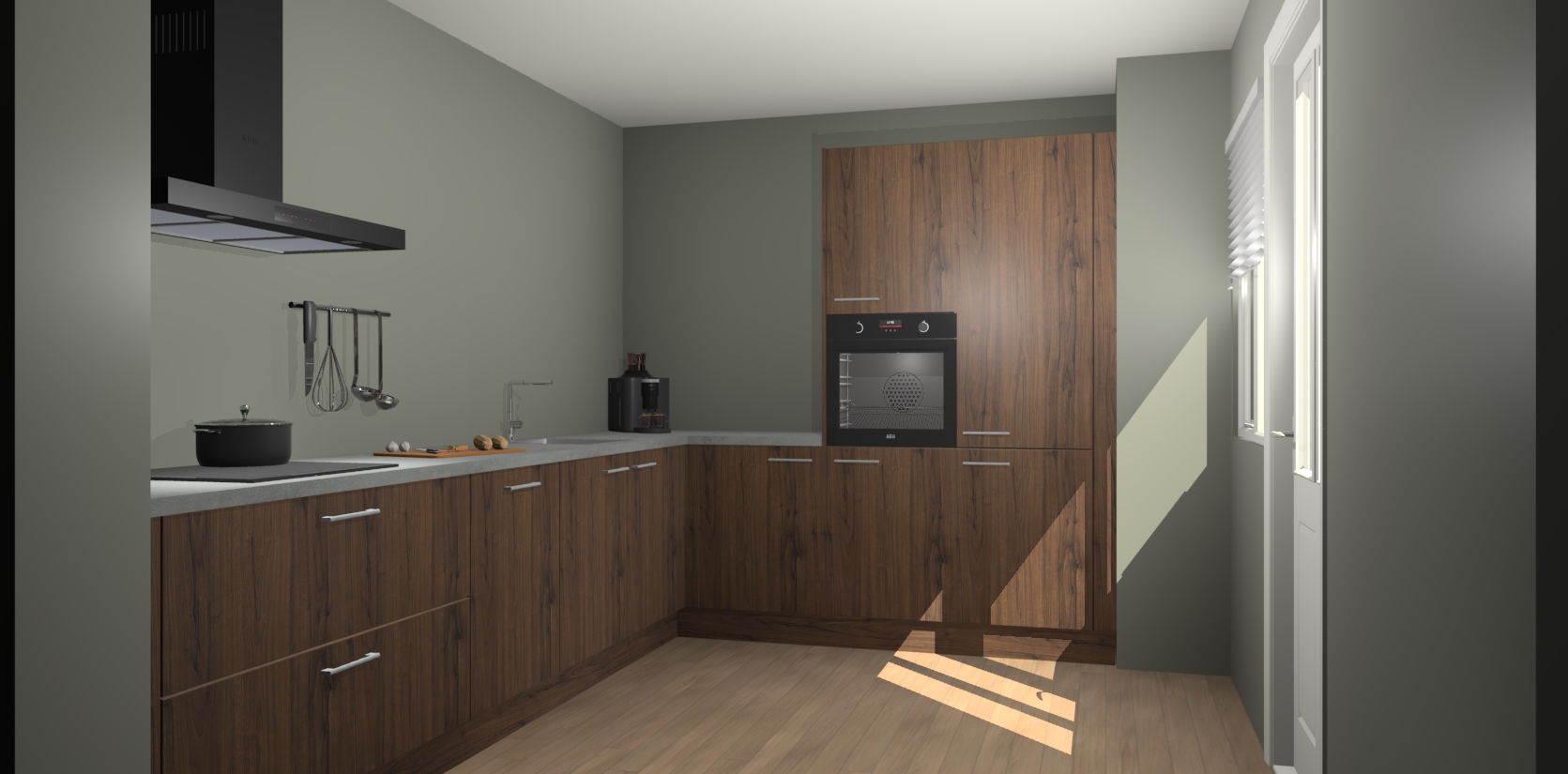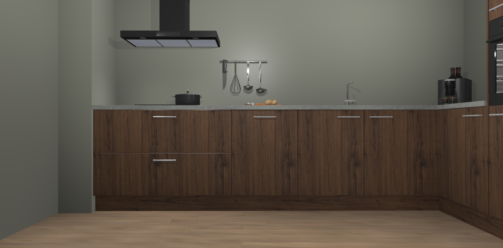 Welkom bij de Noten keuken Portland. Deze prachtige keuken zal de komende jaren het middelpunt van de belangstelling in uw huis zijn. Uitgerust met vijf inbouwapparaten komt u nooit kookgereedschap tekort. Bovendien geeft de warme houtlook elke ruimte een uitnodigende en tijdloze uitstraling.
