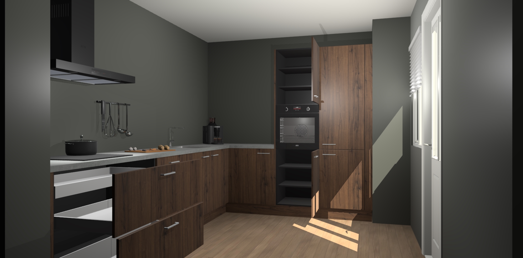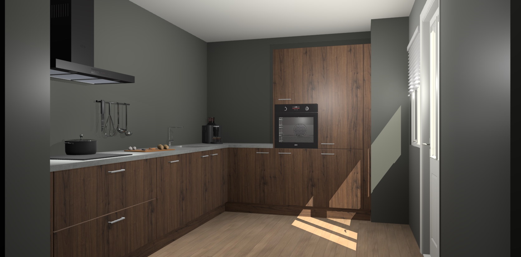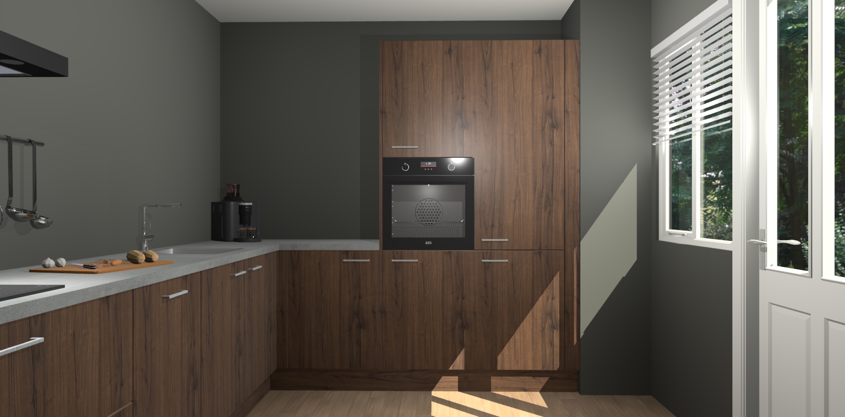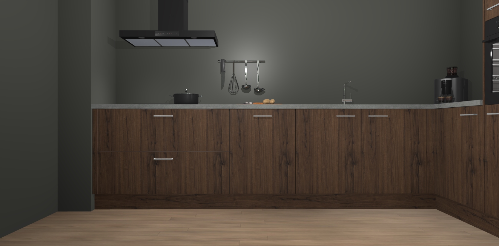Welkom bij de Noten keuken Portland. Deze prachtige keuken zal de komende jaren het middelpunt van de belangstelling in uw huis zijn. Uitgerust met vijf inbouwapparaten komt u nooit kookgereedschap tekort. Bovendien geeft de warme houtlook elke ruimte een uitnodigende en tijdloze uitstraling.