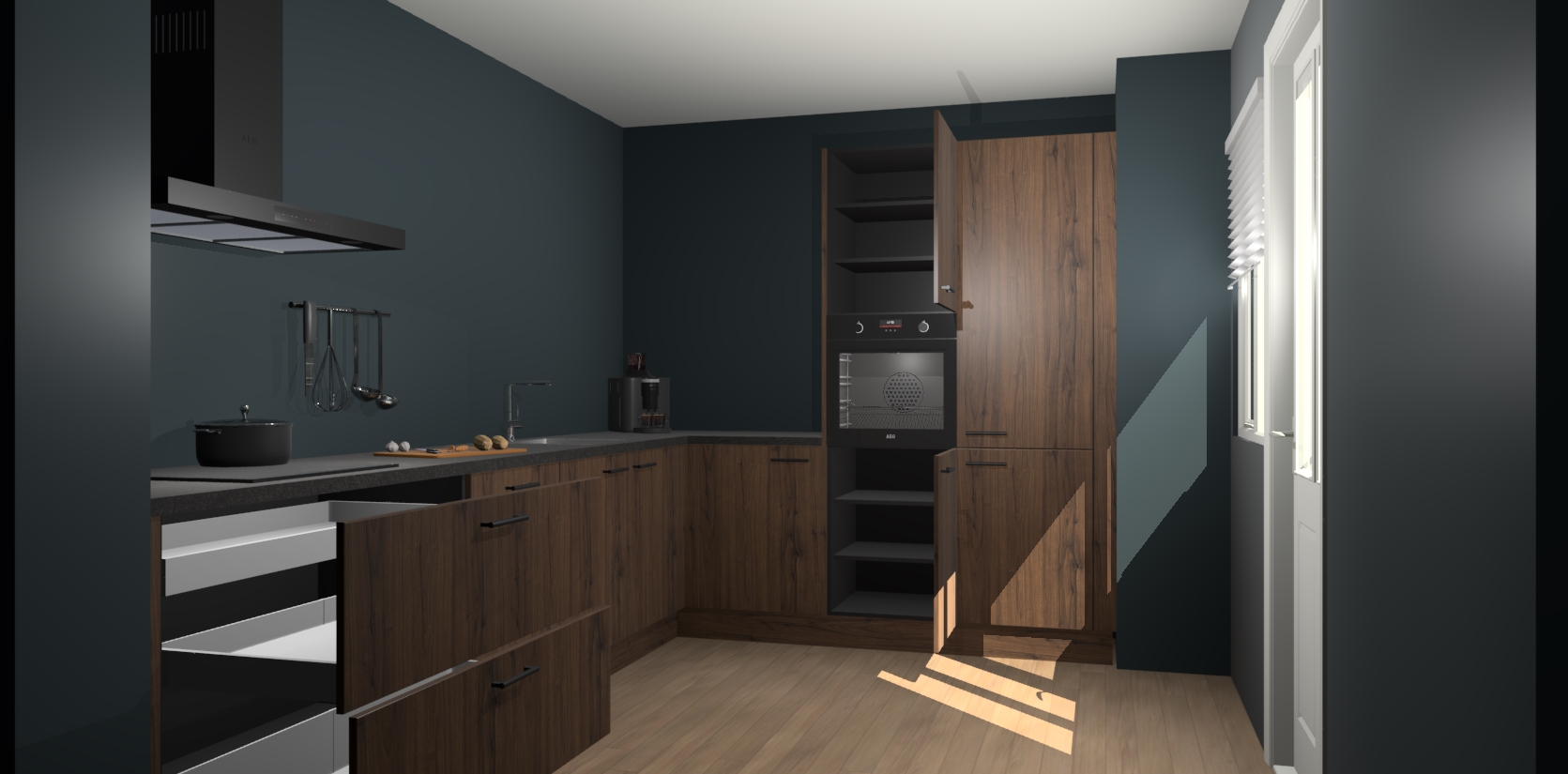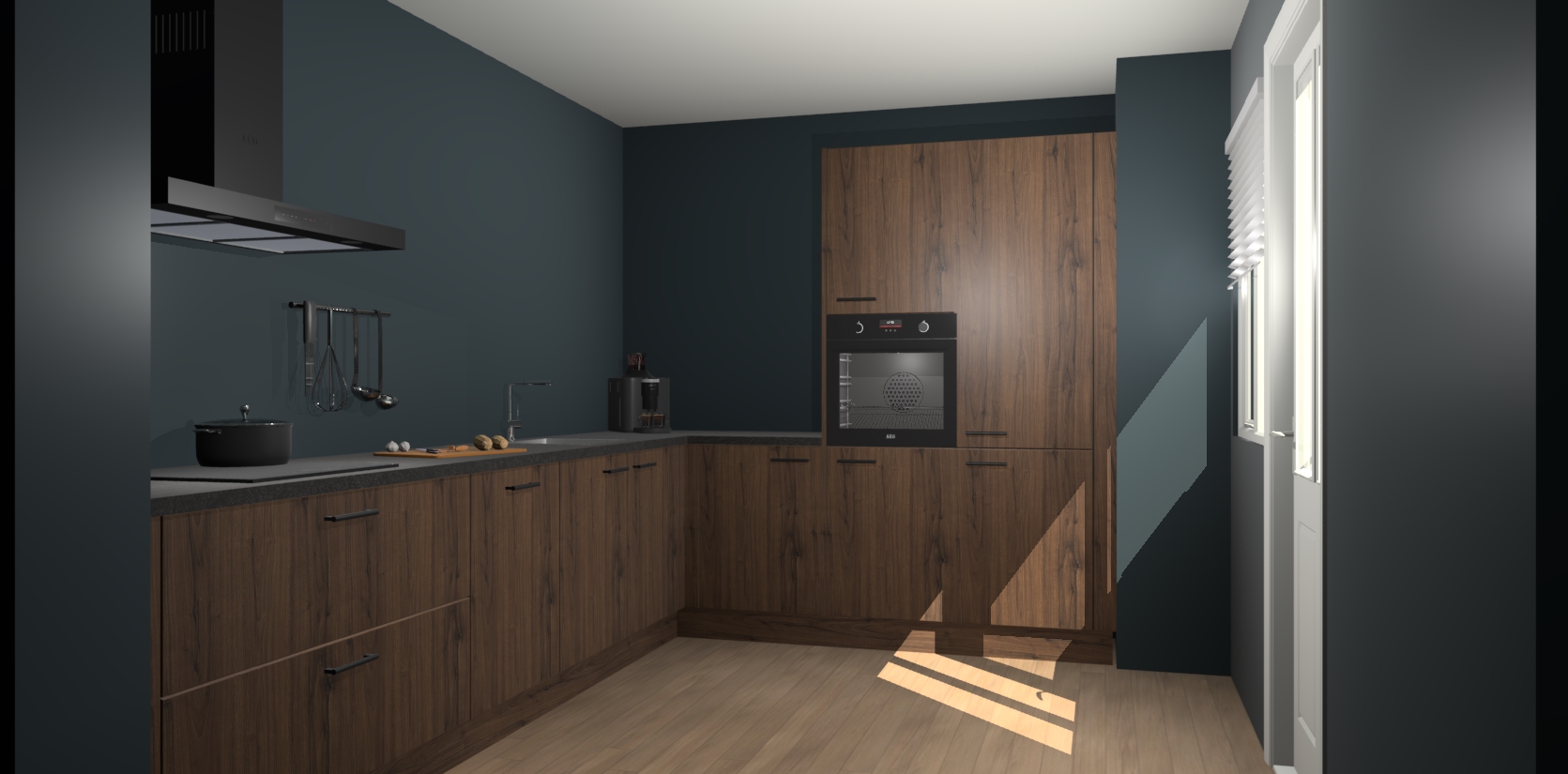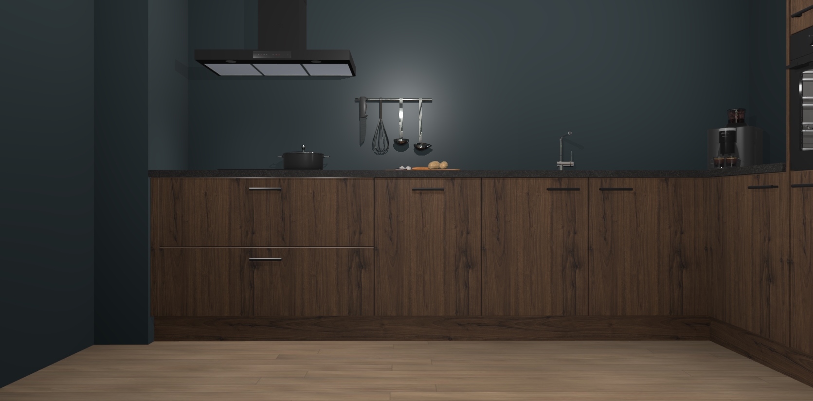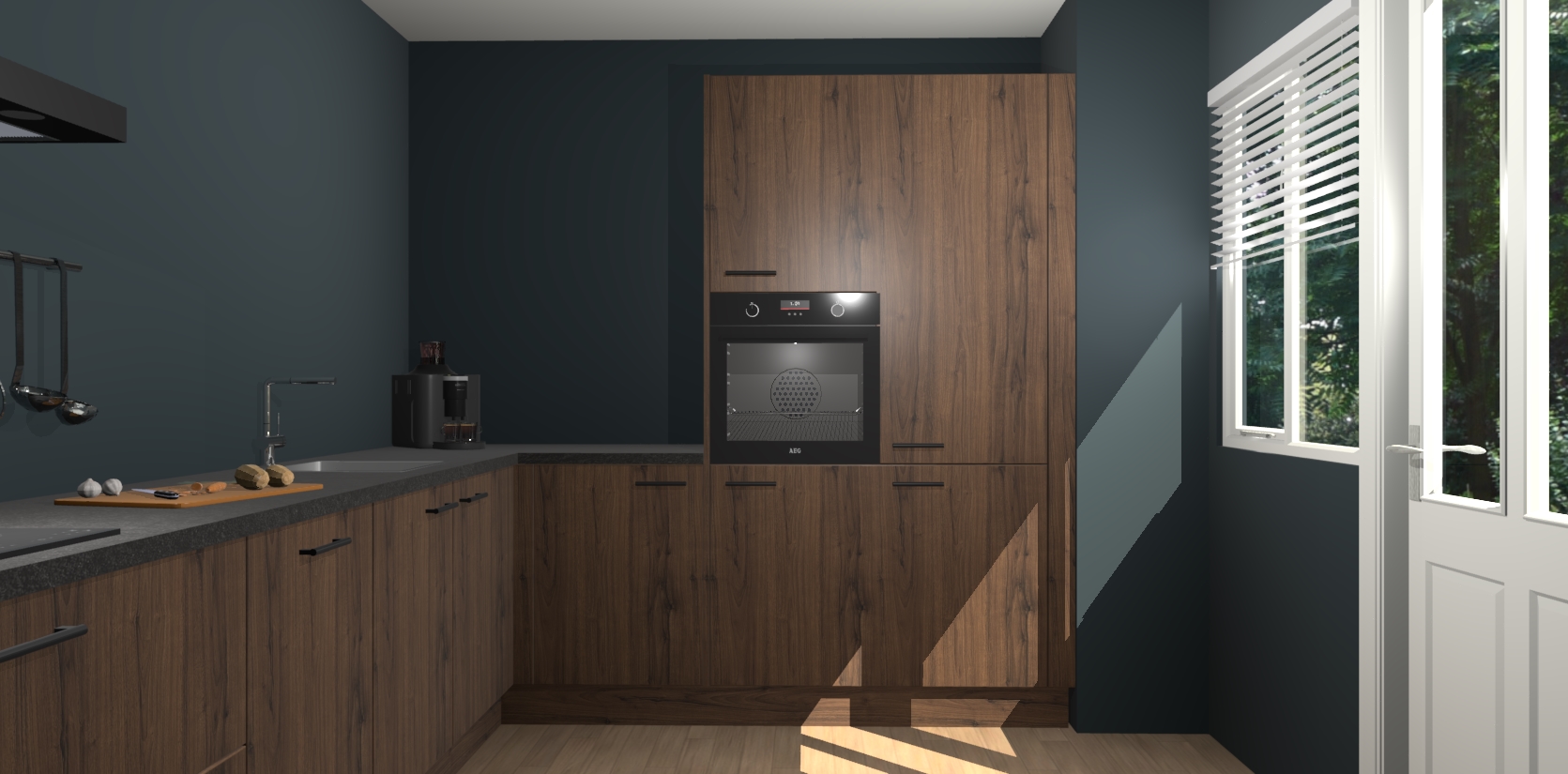 Welkom bij de Noten keuken Portland. Deze prachtige keuken zal de komende jaren het middelpunt van de belangstelling in uw huis zijn. Uitgerust met vijf inbouwapparaten komt u nooit kookgereedschap tekort. Bovendien geeft de warme houtlook elke ruimte een uitnodigende en tijdloze uitstraling.
