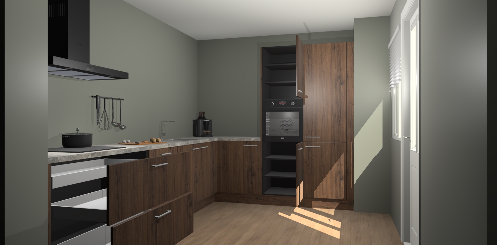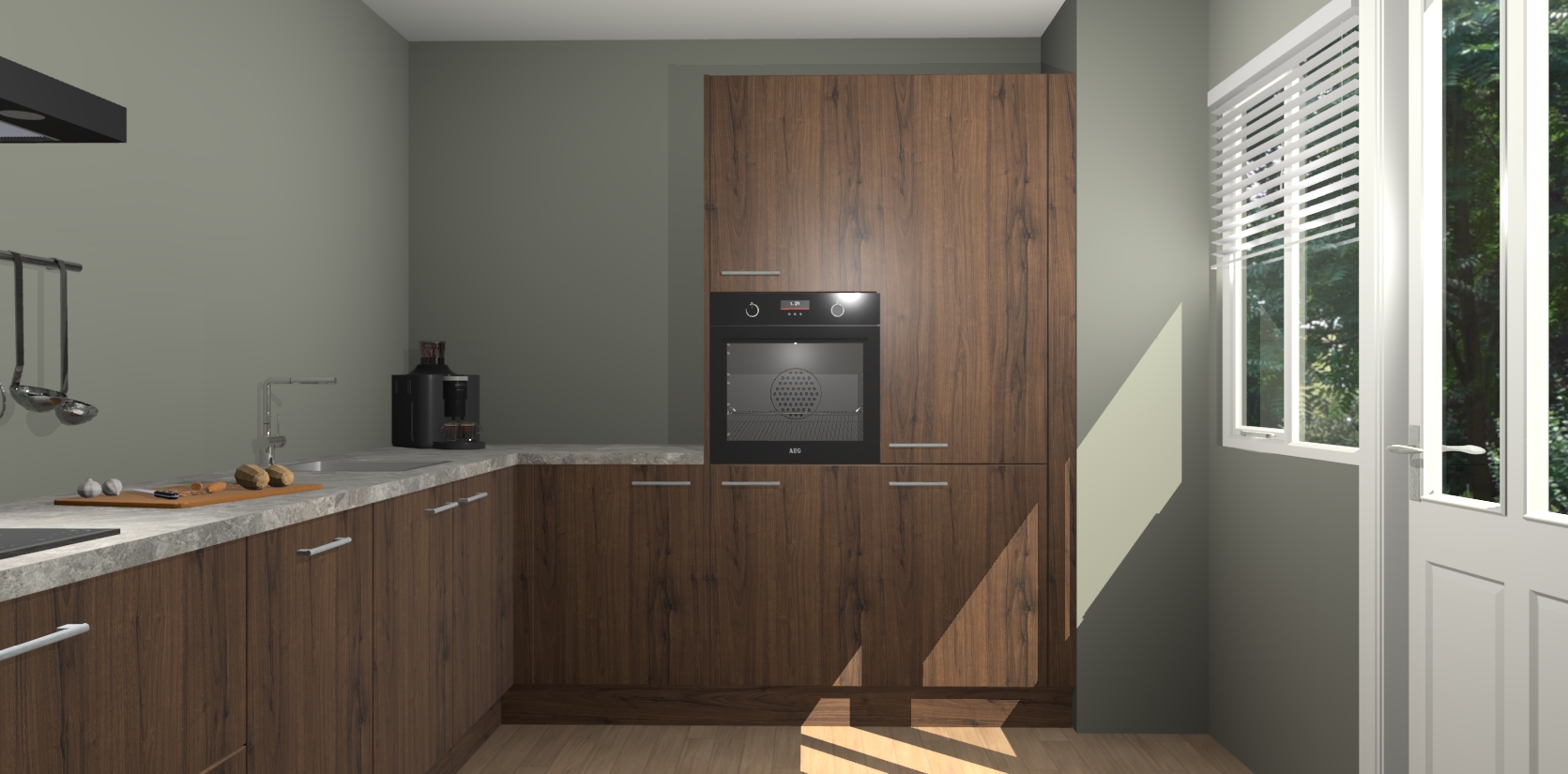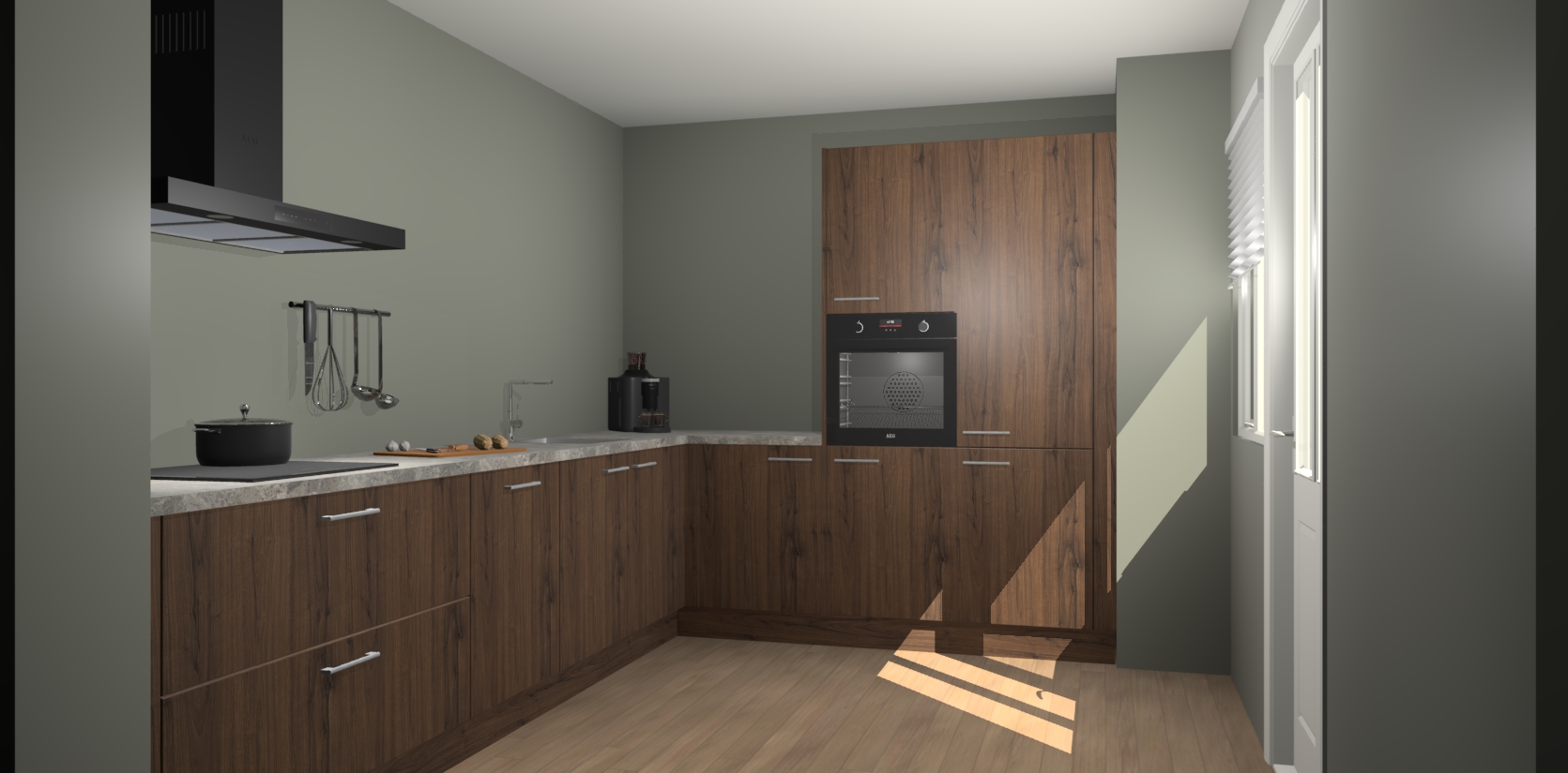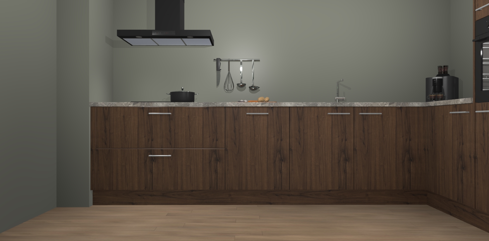 Welkom bij de Noten keuken Portland. Deze prachtige keuken zal de komende jaren het middelpunt van de belangstelling in uw huis zijn. Uitgerust met vijf inbouwapparaten komt u nooit kookgereedschap tekort. Bovendien geeft de warme houtlook elke ruimte een uitnodigende en tijdloze uitstraling.
