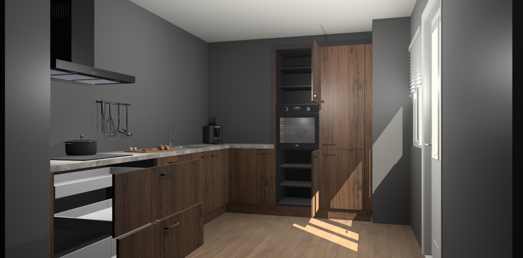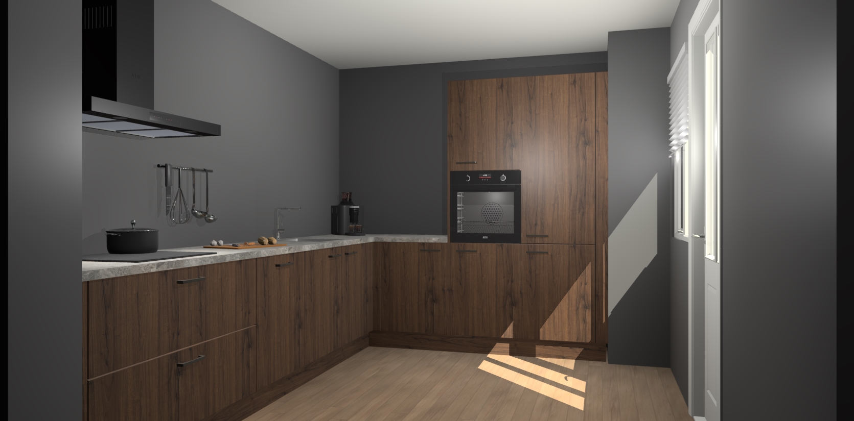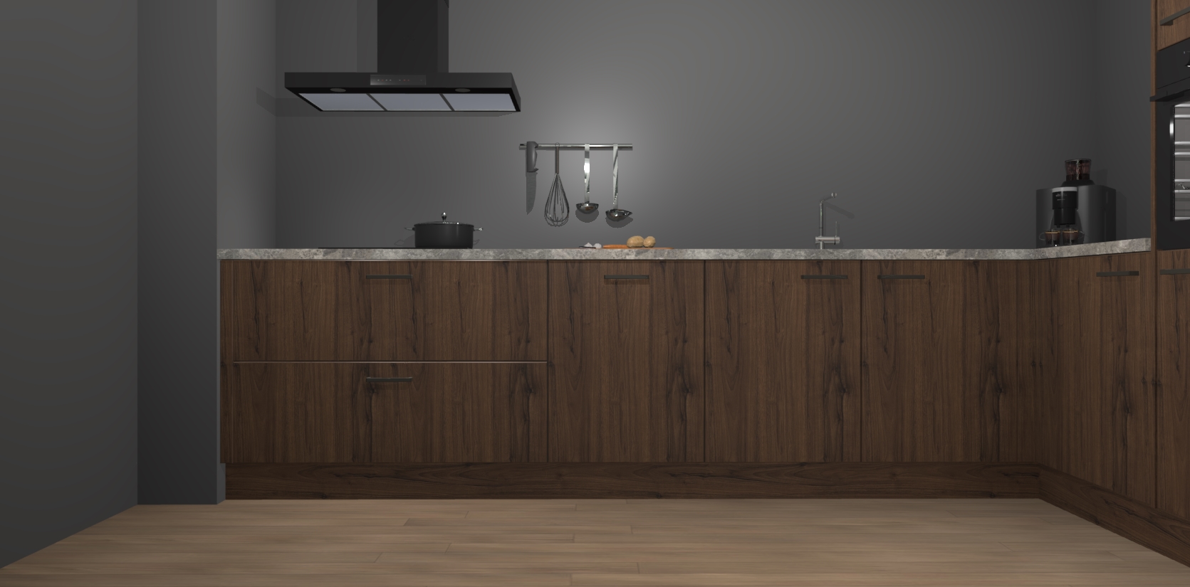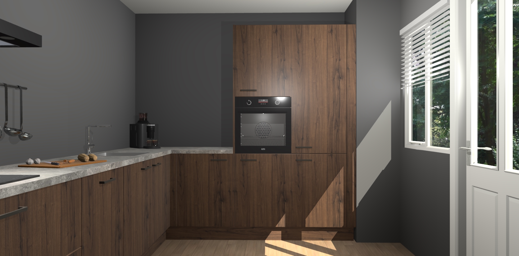 Welkom bij de Noten keuken Portland. Deze prachtige keuken zal de komende jaren het middelpunt van de belangstelling in uw huis zijn. Uitgerust met vijf inbouwapparaten komt u nooit kookgereedschap tekort. Bovendien geeft de warme houtlook elke ruimte een uitnodigende en tijdloze uitstraling.