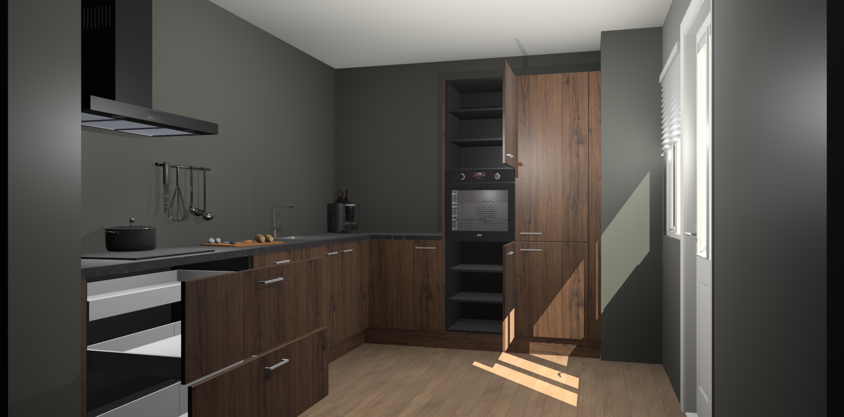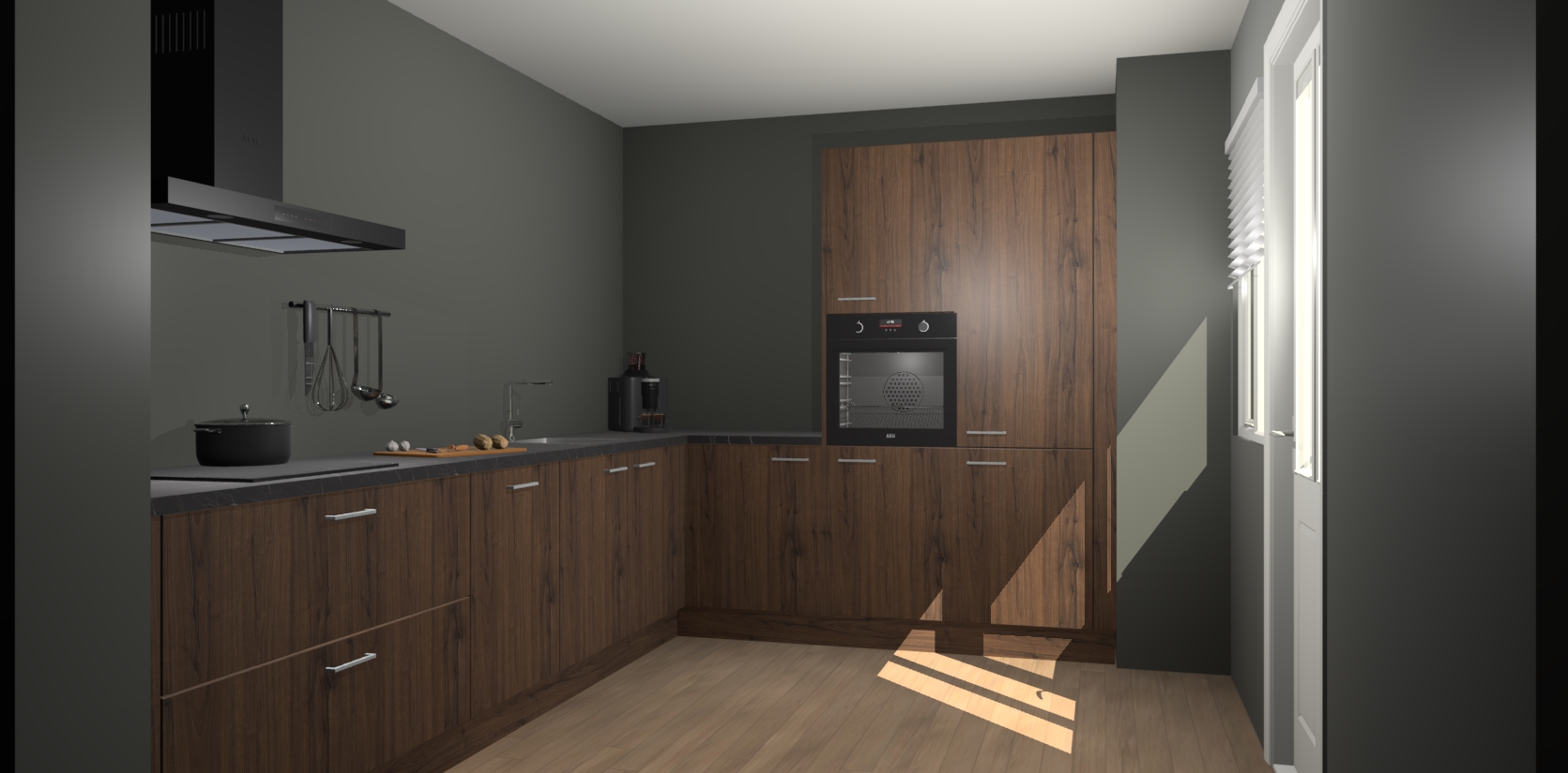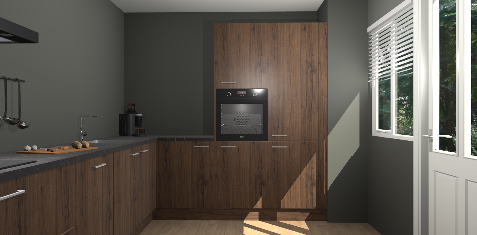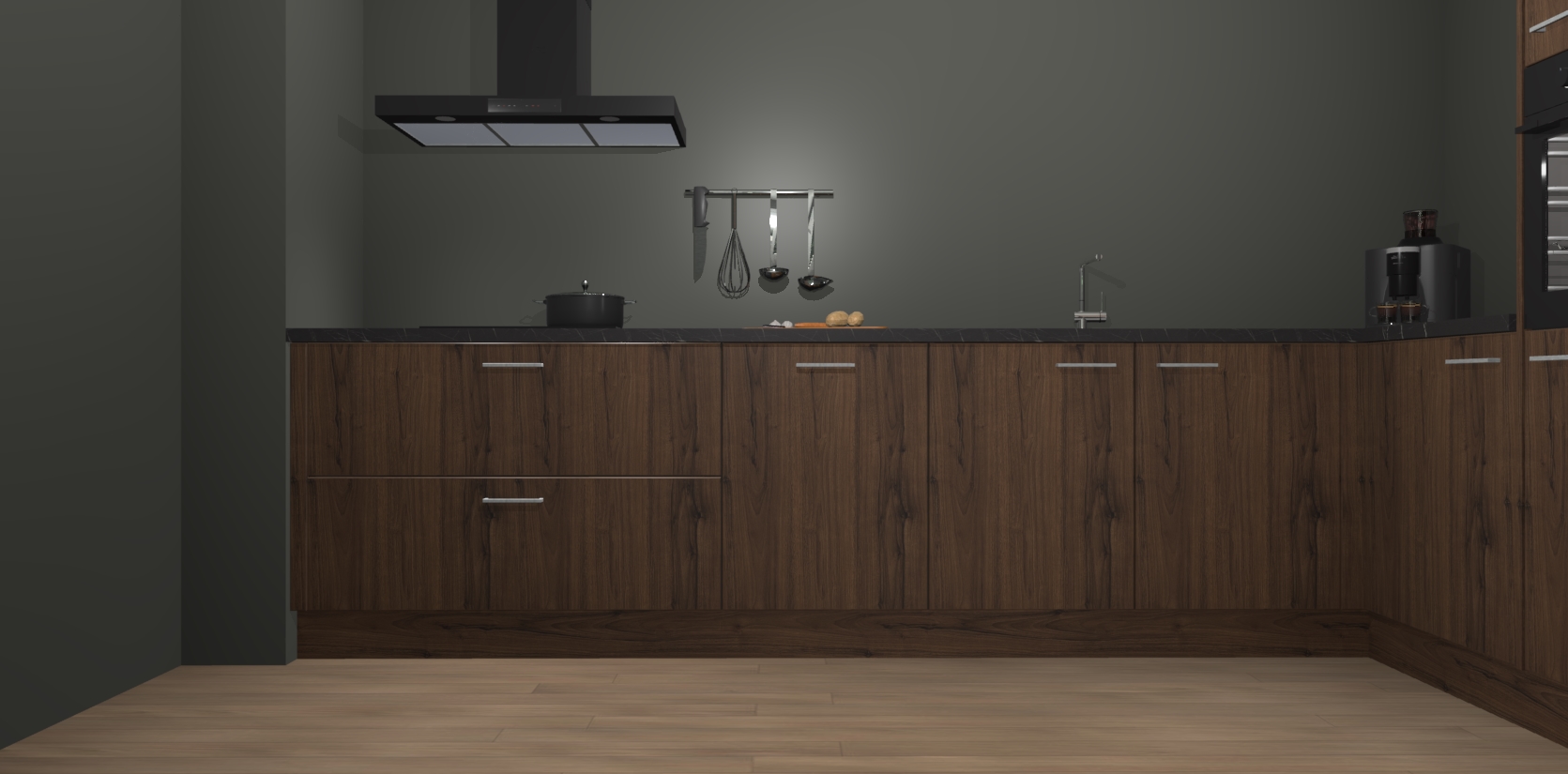 Welkom bij de Noten keuken Portland. Deze prachtige keuken zal de komende jaren het middelpunt van de belangstelling in uw huis zijn. Uitgerust met vijf inbouwapparaten komt u nooit kookgereedschap tekort. Bovendien geeft de warme houtlook elke ruimte een uitnodigende en tijdloze uitstraling.