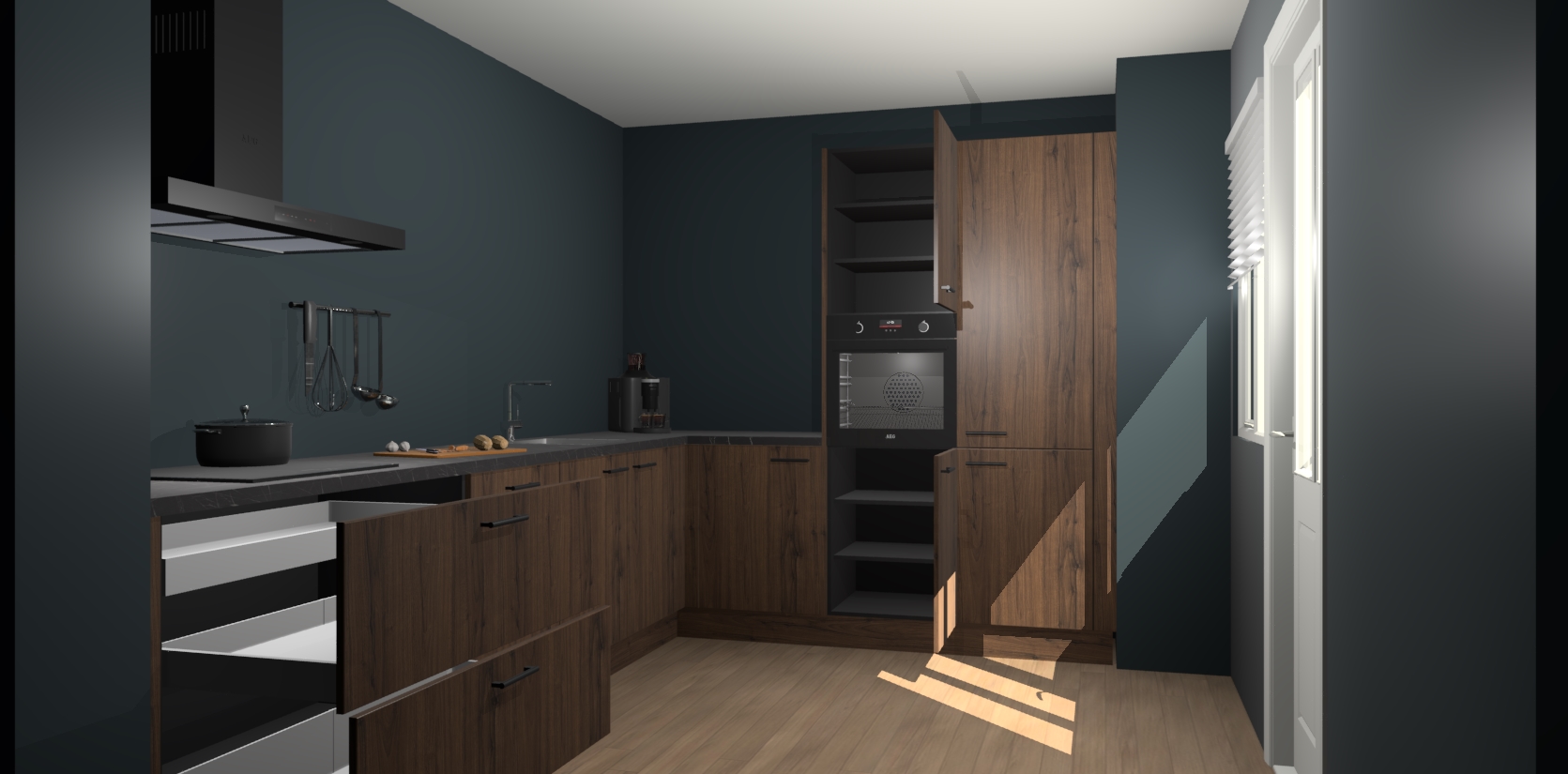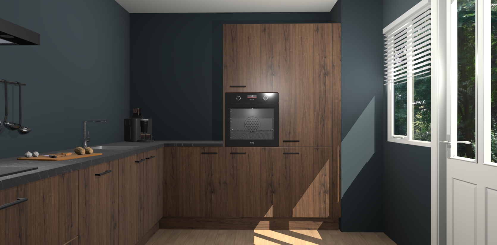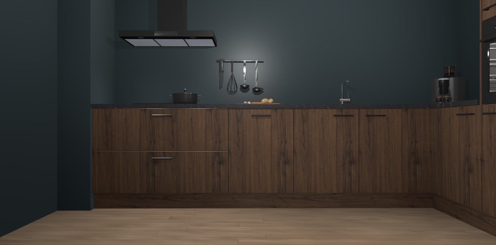 Welkom bij de Noten keuken Portland. Deze prachtige keuken zal de komende jaren het middelpunt van de belangstelling in uw huis zijn. Uitgerust met vijf inbouwapparaten komt u nooit kookgereedschap tekort. Bovendien geeft de warme houtlook elke ruimte een uitnodigende en tijdloze uitstraling.